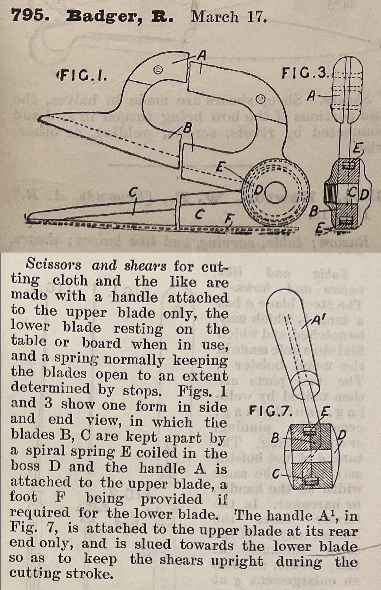 Scissors and shears for cutting cloth and the like are made with a handle attached to the upper blade only, the lower blade resting on the table or board when in use, and a spring normally keeping the blades open to an extent determined by stops. Figs. 1 and 3 show one form in side and end view, in which the blades B, C are kept apart by a spiral spring E coiled in the boss D and the handle A is attached to the upper blade, a foot F being provided if required for the lower blade. The handle A1, in Fig. 7, is attached to the upper blade at its rear end only, and is slued towards the lower blade so as to keep the shears upright during the cutting stroke.Cataloged By