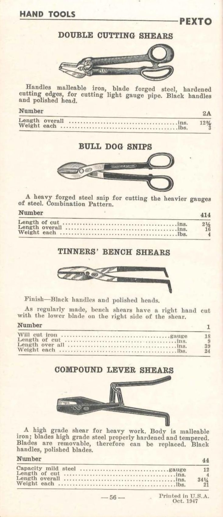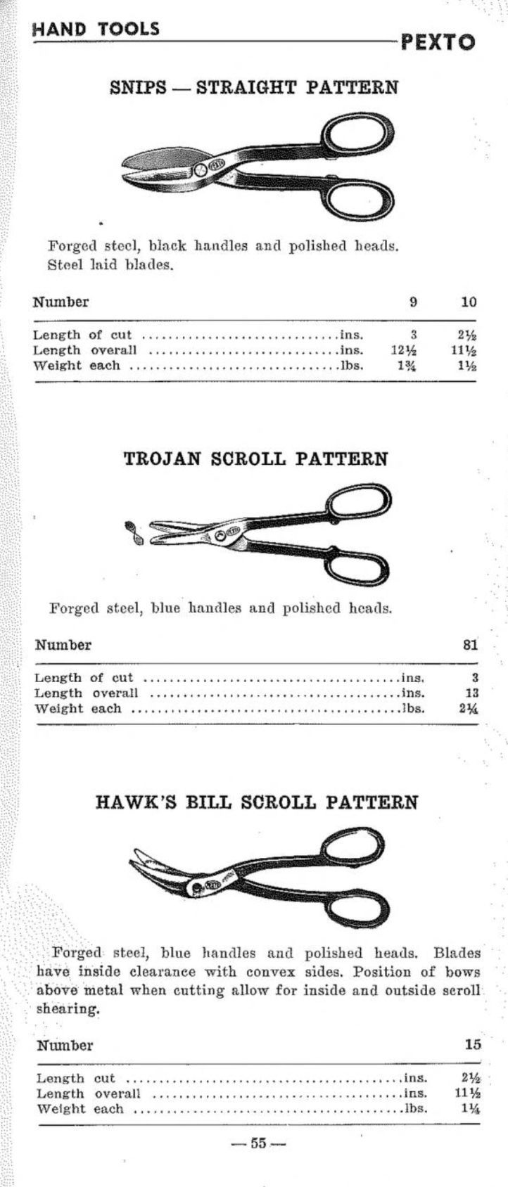 Peck, Stow & Wilcox Co. were manufacturers of tools for the sheet metal trades. They were owners of the PEXTO brand. Their 1947 Catalogue illustrates a range of snips and shears including: Straight Pattern; Trojan Scroll Pattern; Hawk's Bill Scroll Pattern; Double Cutting Shears; Bull Dog Snips; Bench Shears; and Compound Lever Shears.Publication Details