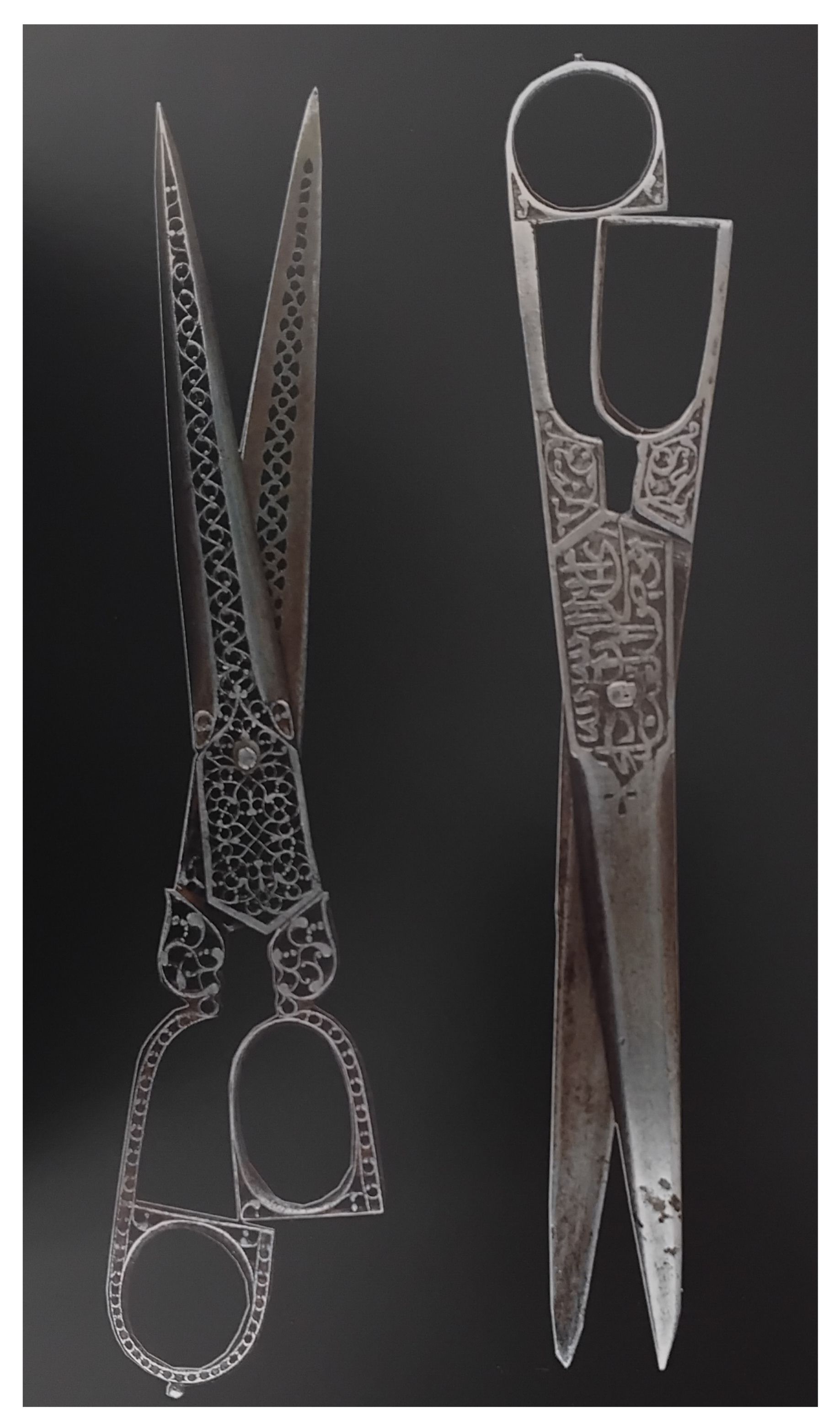 There is a discussion of decoration techniques (eg, surface decoration, inlaid, overlaid, openwork "which was a very popular techniques [sic] among scissor-makers") and how the variety of these techniques led to specialisation and division of labour, which continues today. We learn that steelworking was generally a family business; in the Safavid period (1501 - 1736) the Nazuk family, for example, included "Shafi' Nazuk ... known from a pair of steel scissors". In the 20th century these family businesses also brought in apprentices from outside.