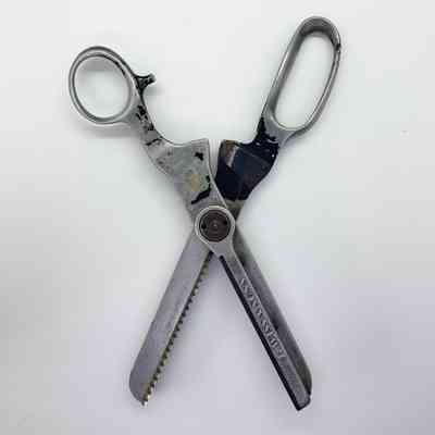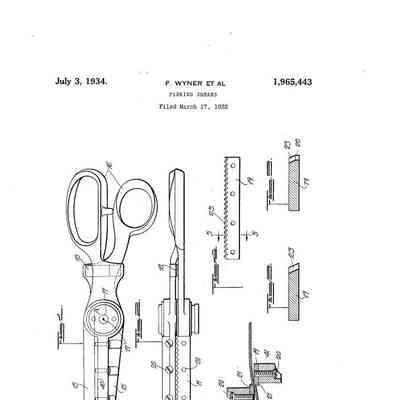 A pair of Wiss & Sons pinking shears, marked "PATENTS PENDING". American patent 1,965,443 (see below) was registered on 3rd July 1934 and the construction of these is similar, consisting of shears with blades attached to the jaws. It is likely that the shears component was manufactured by Wiss & Sons, and the blades were manufactured by a separate firm.