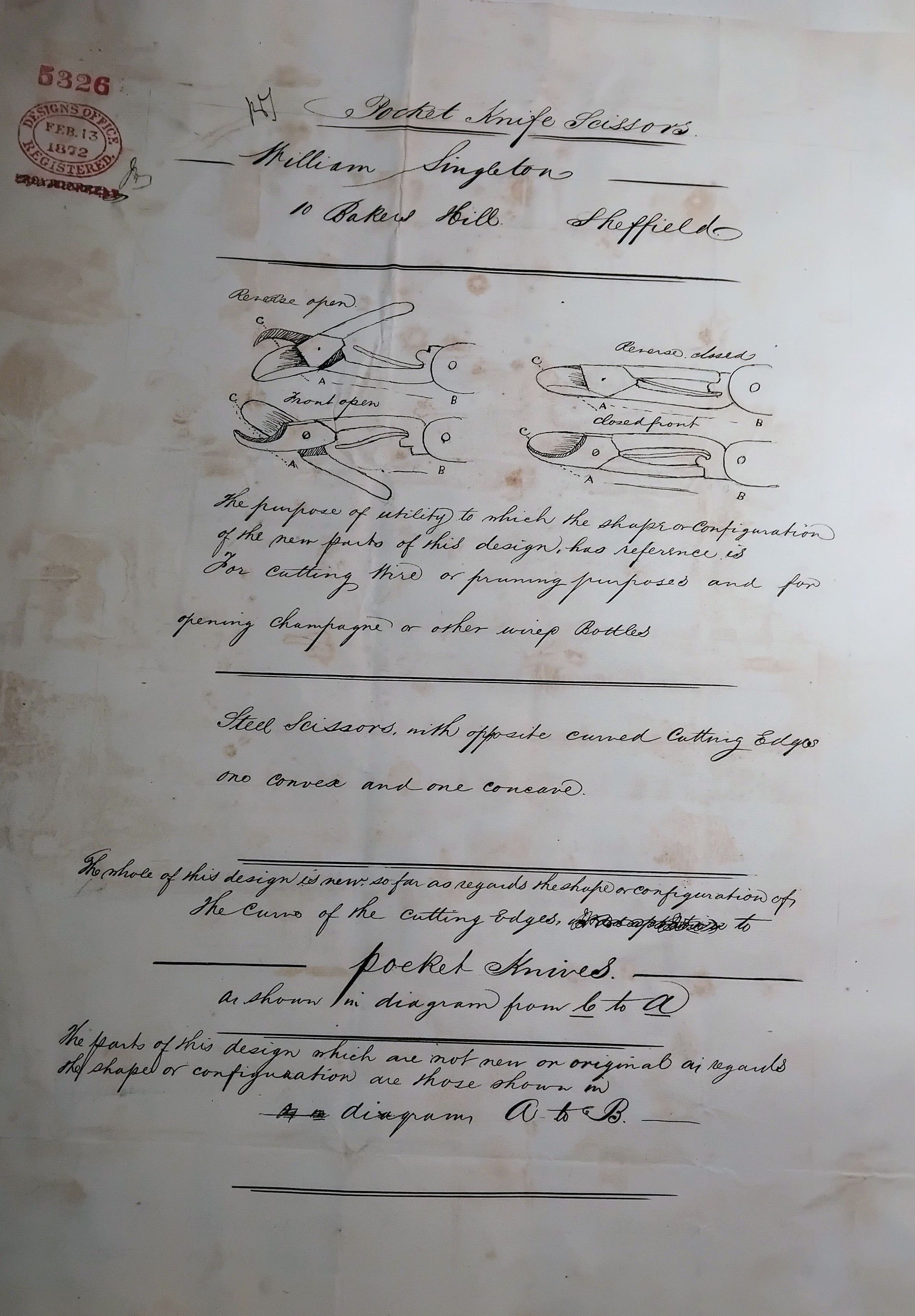 Registered design for pocket knife scissors from 1872. Stamped "Designs Office Registered Feb. 13 1872"