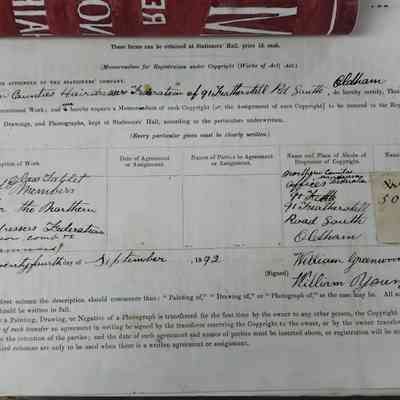 A registered design from 1892 with accompanying form (Memorandum for Registration under Copyright (Works of Art) Act.). Stamped 'Received Stationers Hall -5 OCT. 92'. Selected text from the certificate:
