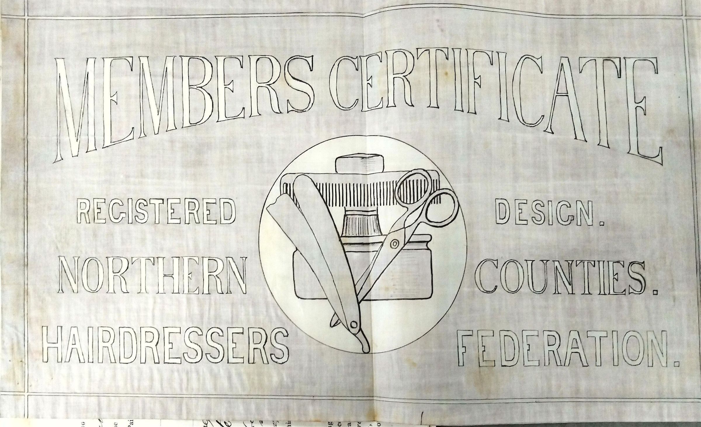 Description of Work. Drawing of Glass Tablet Members Certificate for the Northern Counties Hairdressers Federation with razor, scissors, comb [...] (copy [...]).