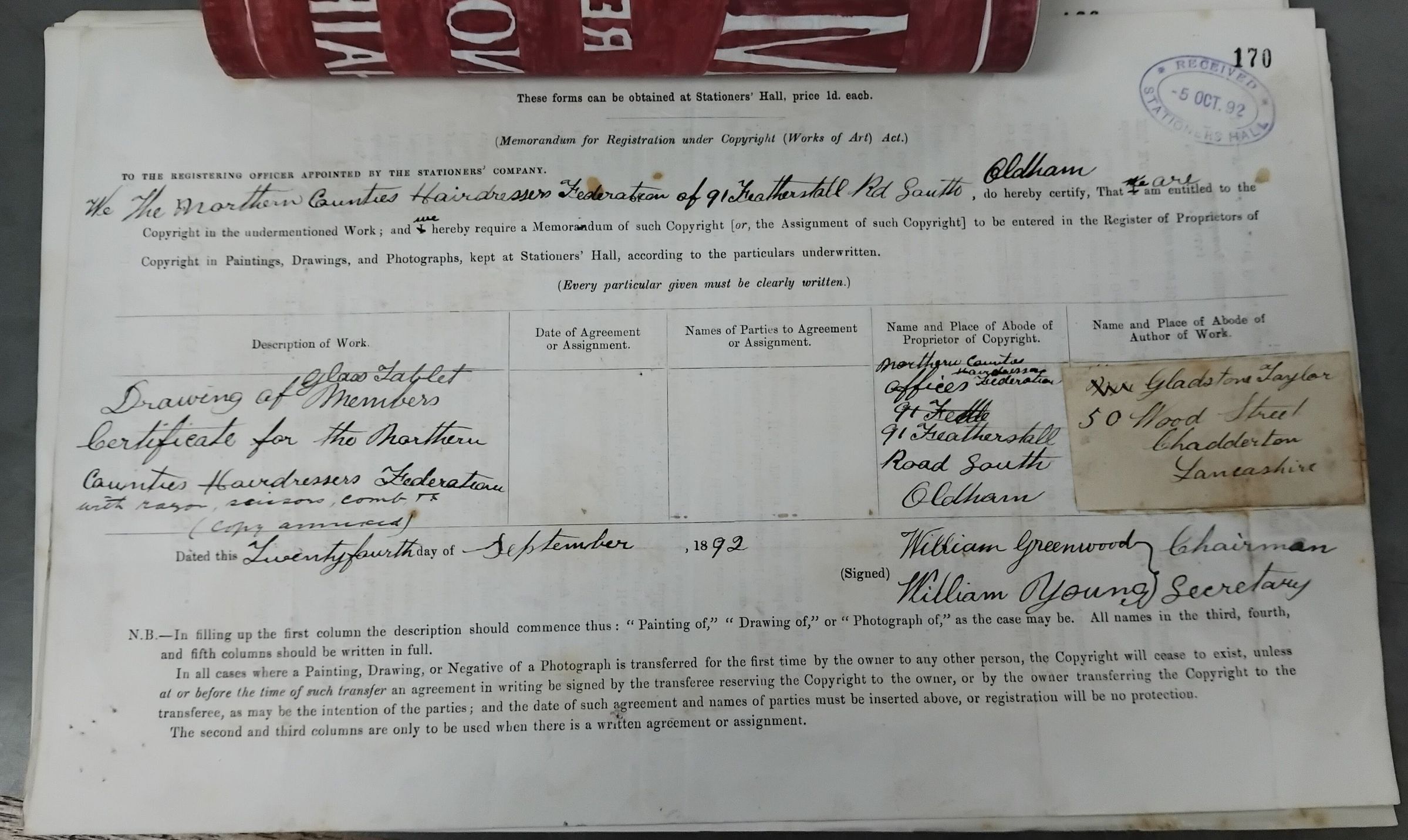 We The Northern Counties Hairdressers Federation of 91 Featherstall Rd South, Oldham, do hereby certify, That we are entitled to the Copyright in the undermentioned Work; and we hereby require a Memorandum of such Copyright [or, the Assignment of such Copyright] to be entered in the Register of Proprietors of Copyright in Paintings, Drawings, and Photographs, kept at Stationers' Hall, according to the particulars underwritten. ...