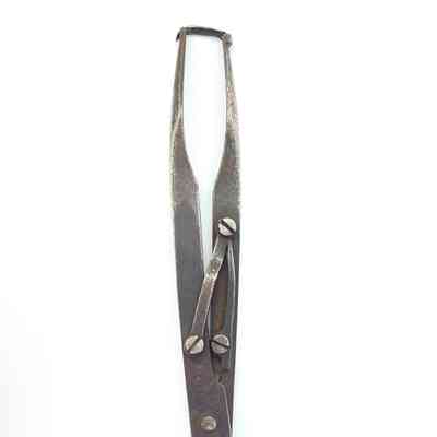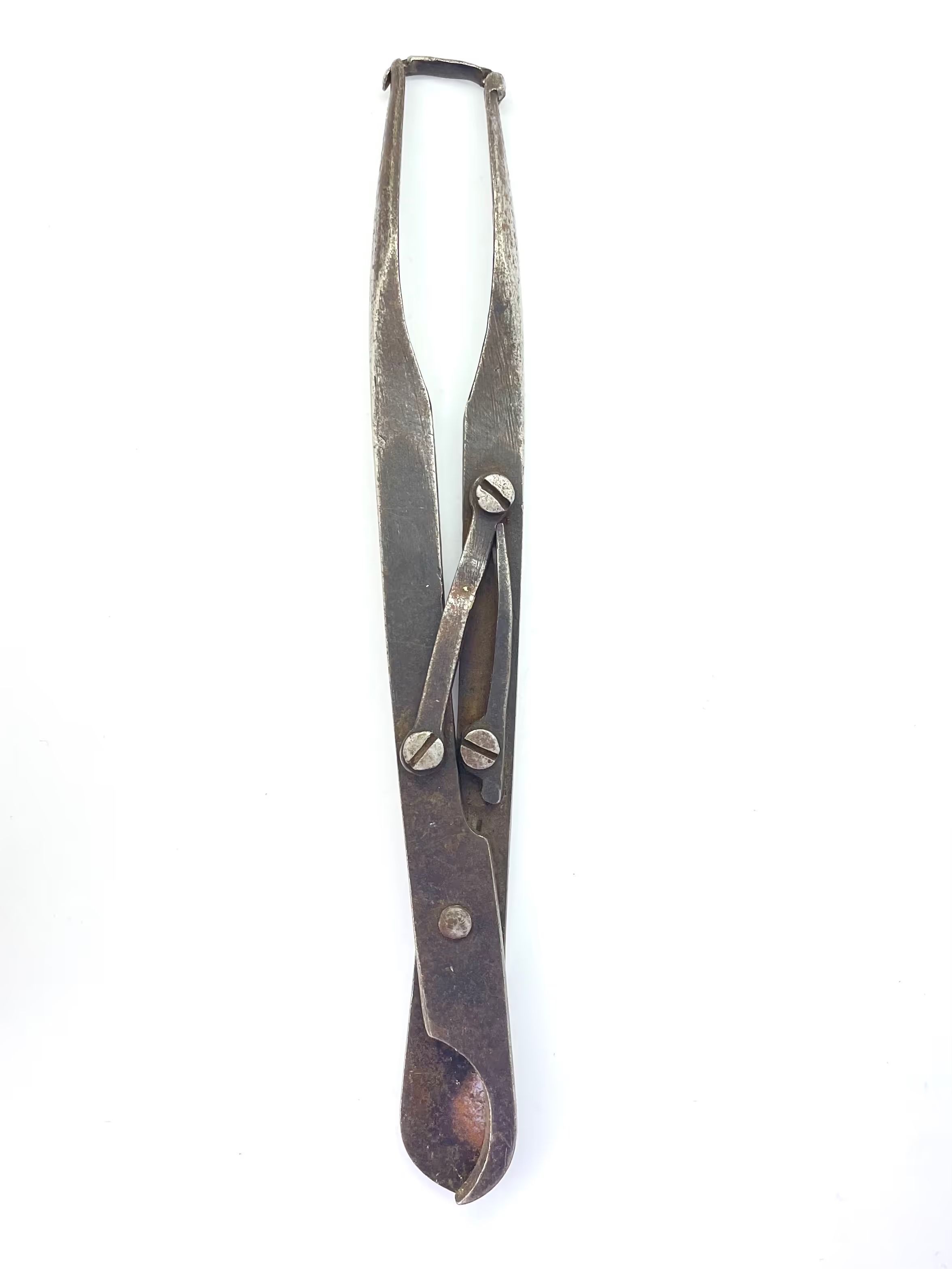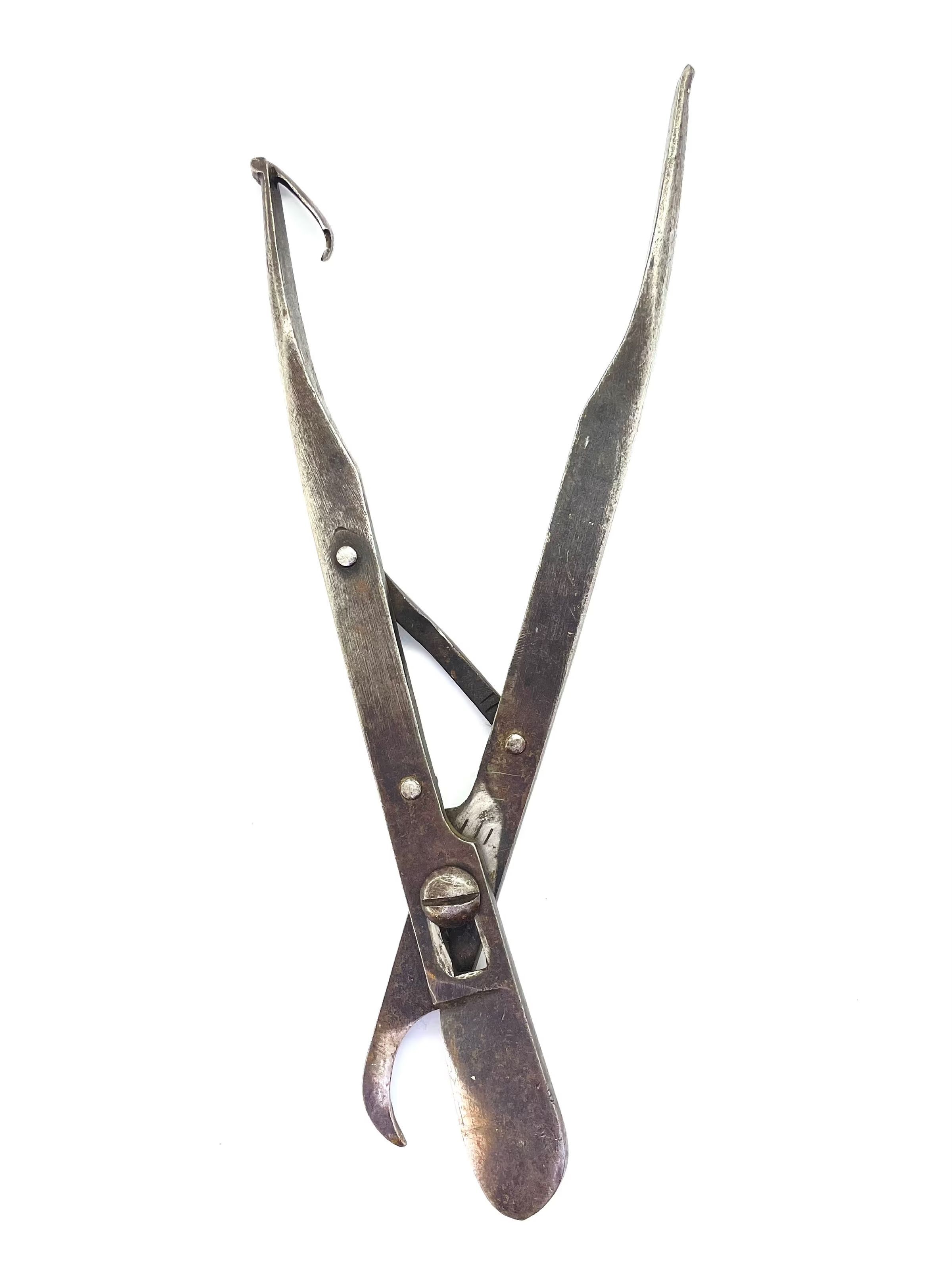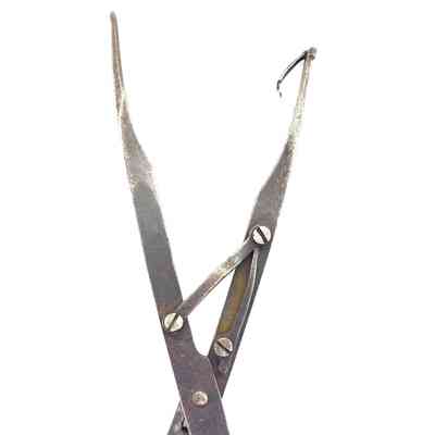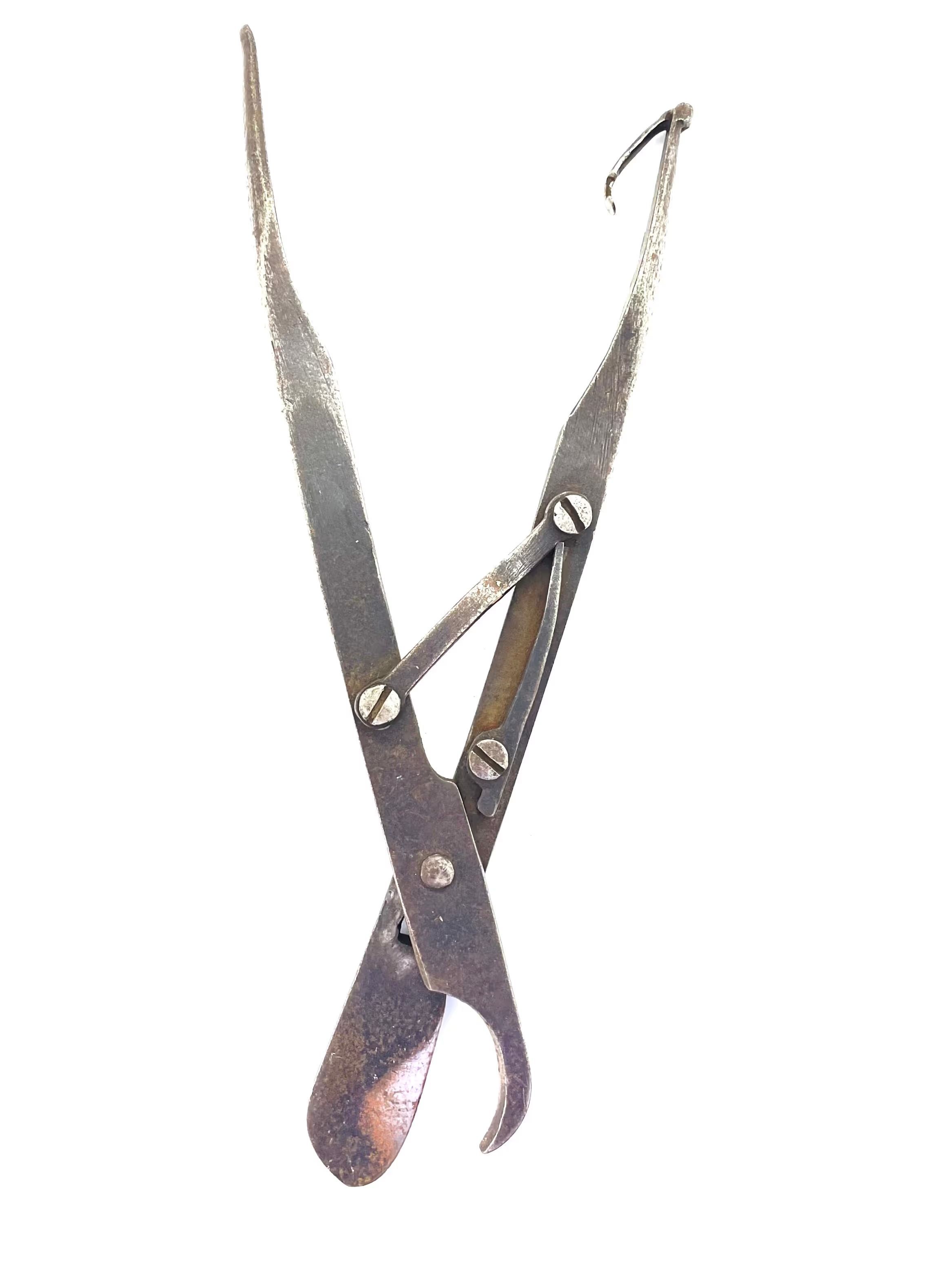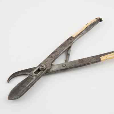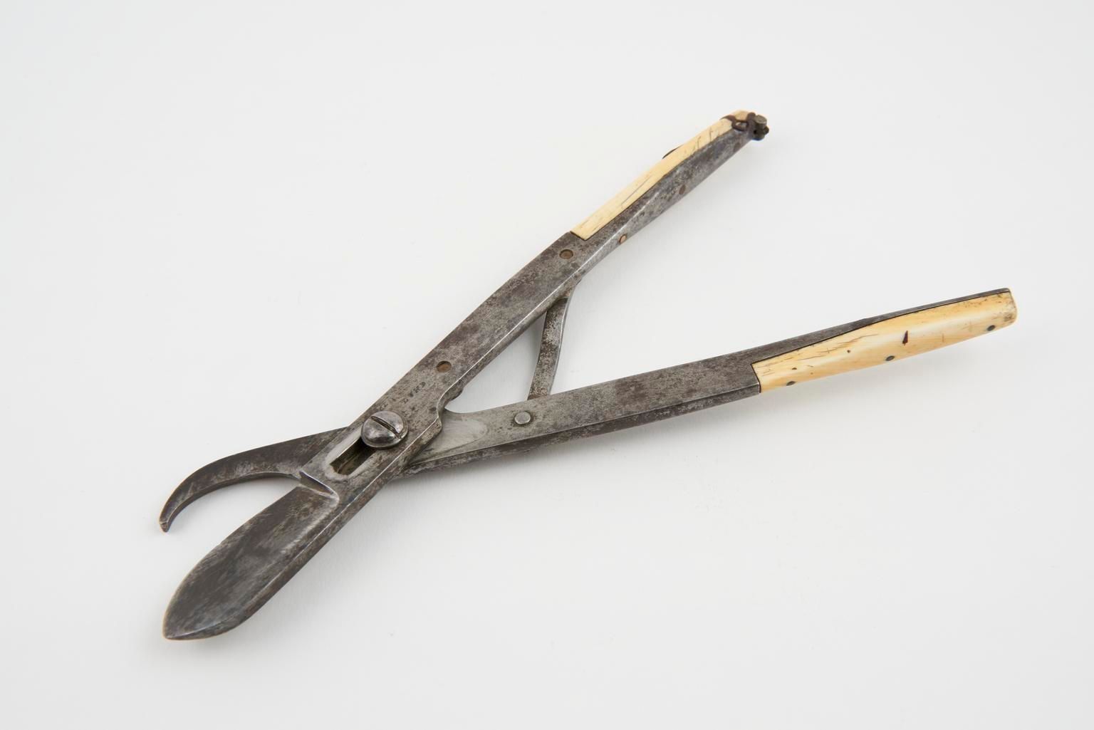 Spring scissors with a movable pivot. The spring mechanism opens the scissors automatically after each cut. A clip fixed to the top of one of the shanks keeps the scissors closed when not in use. Probably rib shears - very similar to a pair held by the Science Museum in London.Dimensions