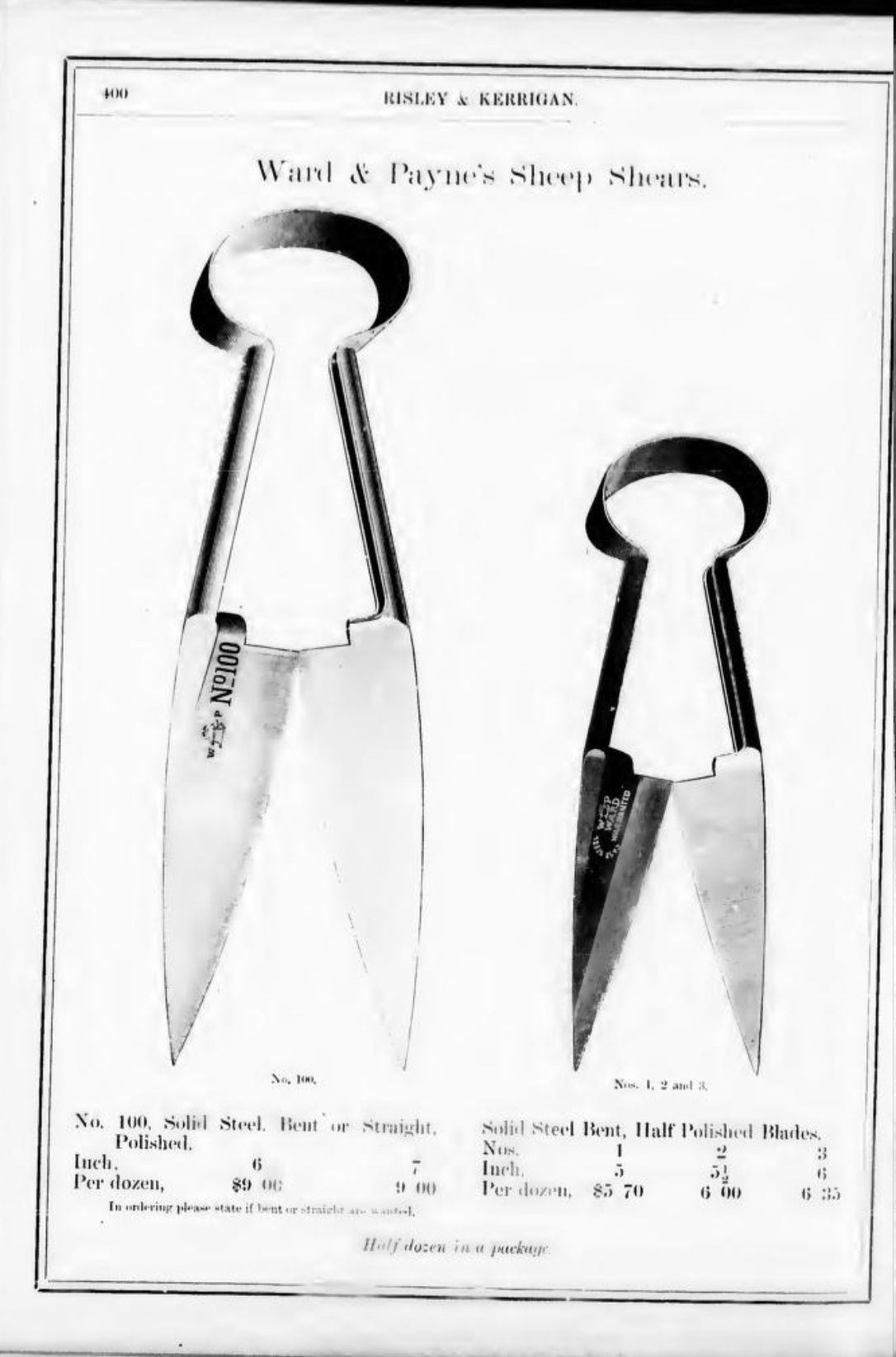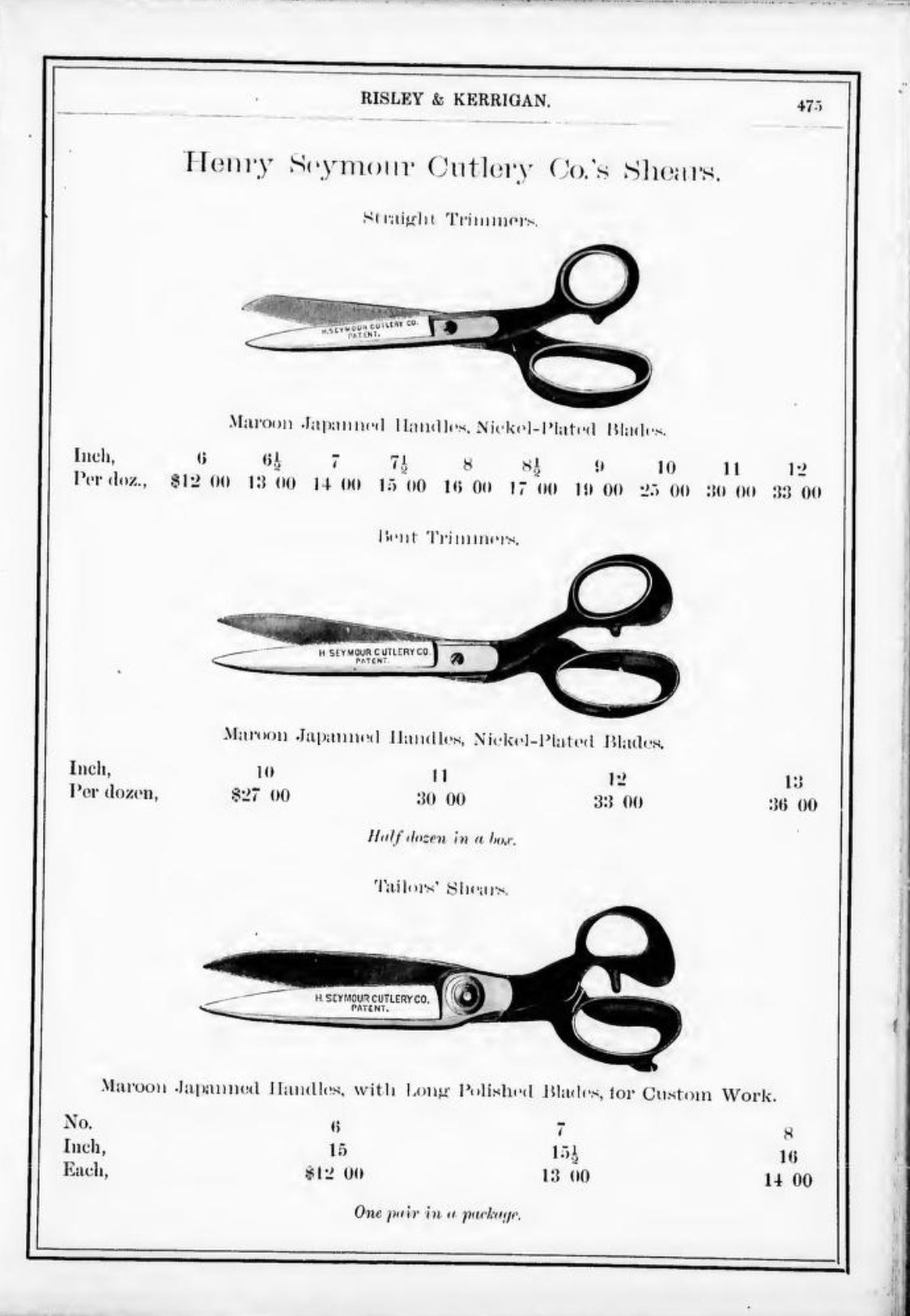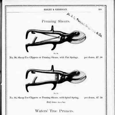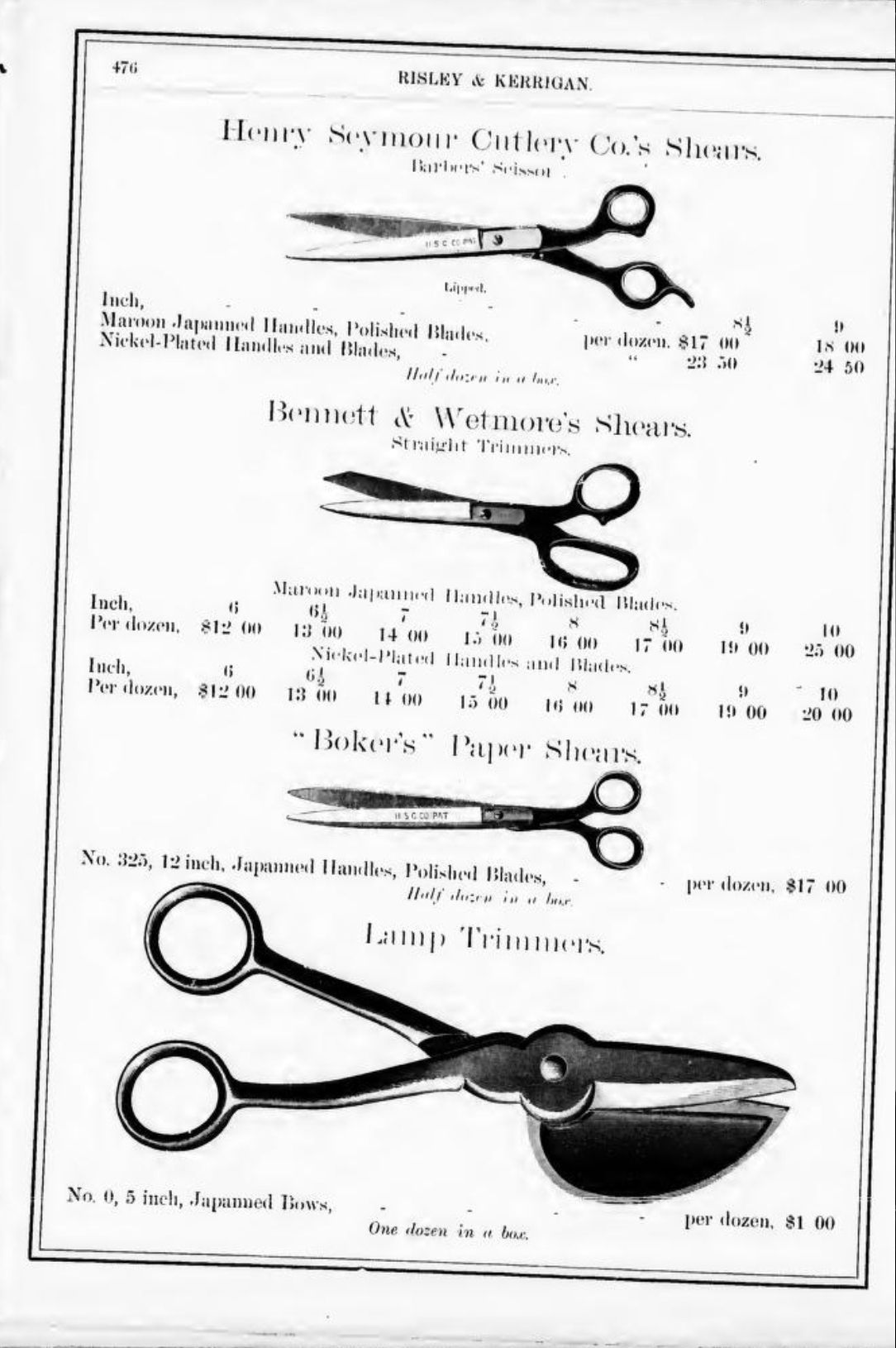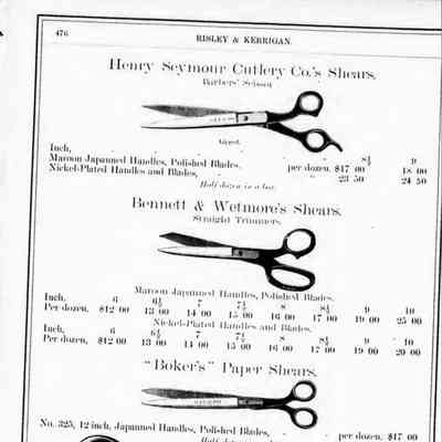 Risley & Kerrigan were suppliers of hardware based in Toronto. Their 1886 Catalogue includes Tinners' Snips, Pruning Shears, Tree Shears, Ward & Payne's Sheep Shears, Henry Seymour's Tailors' Shears, Trimmers, and Barbers' Scissors, Bennet & Wetmore's Trimmers, Boker's Paper Shears, Lamp Scissors, and Can Openers/Sardine Scissors.Publication Details