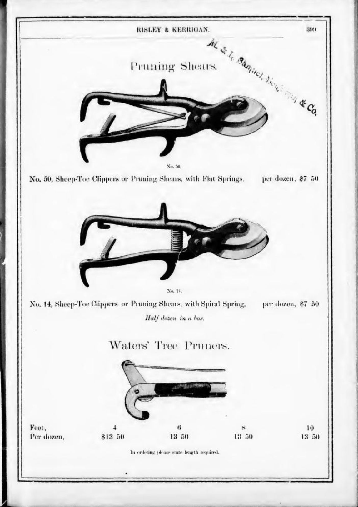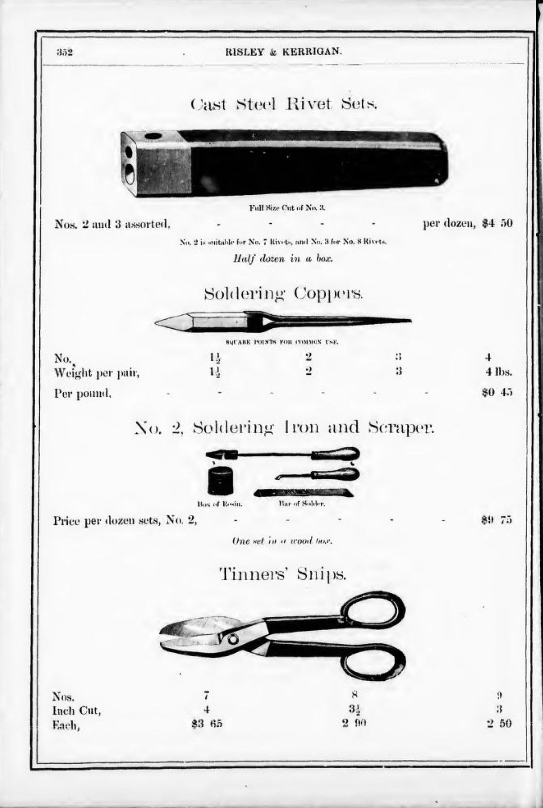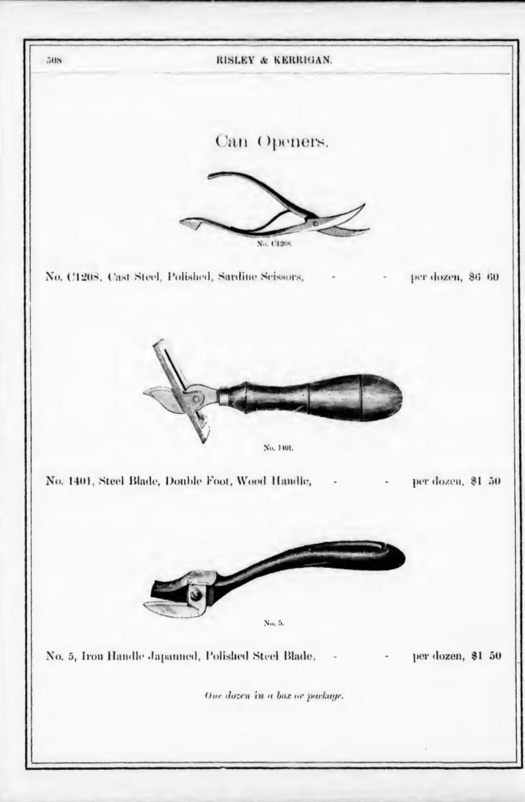 Risley & Kerrigan were suppliers of hardware based in Toronto. Their 1886 Catalogue includes Tinners' Snips, Pruning Shears, Tree Shears, Ward & Payne's Sheep Shears, Henry Seymour's Tailors' Shears, Trimmers, and Barbers' Scissors, Bennet & Wetmore's Trimmers, Boker's Paper Shears, Lamp Scissors, and Can Openers/Sardine Scissors.Publication Details