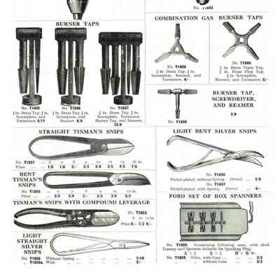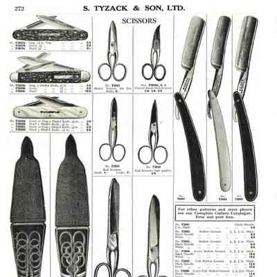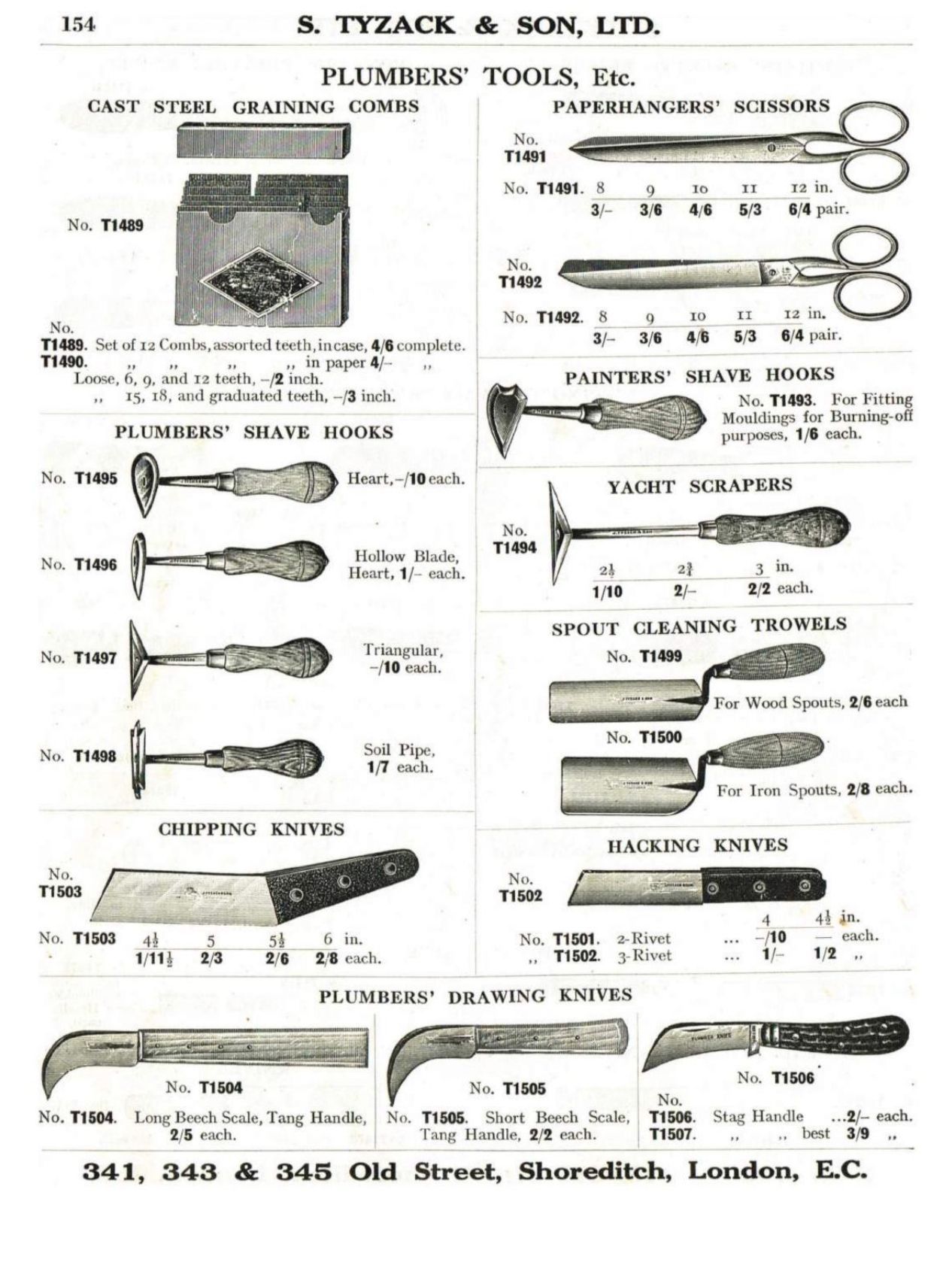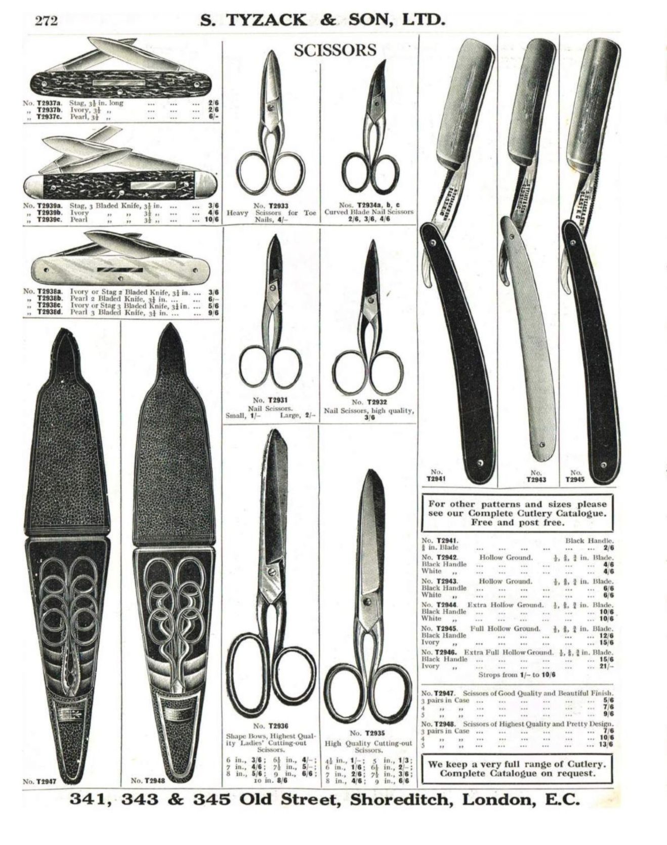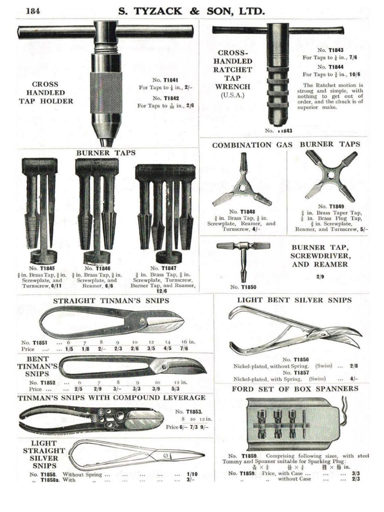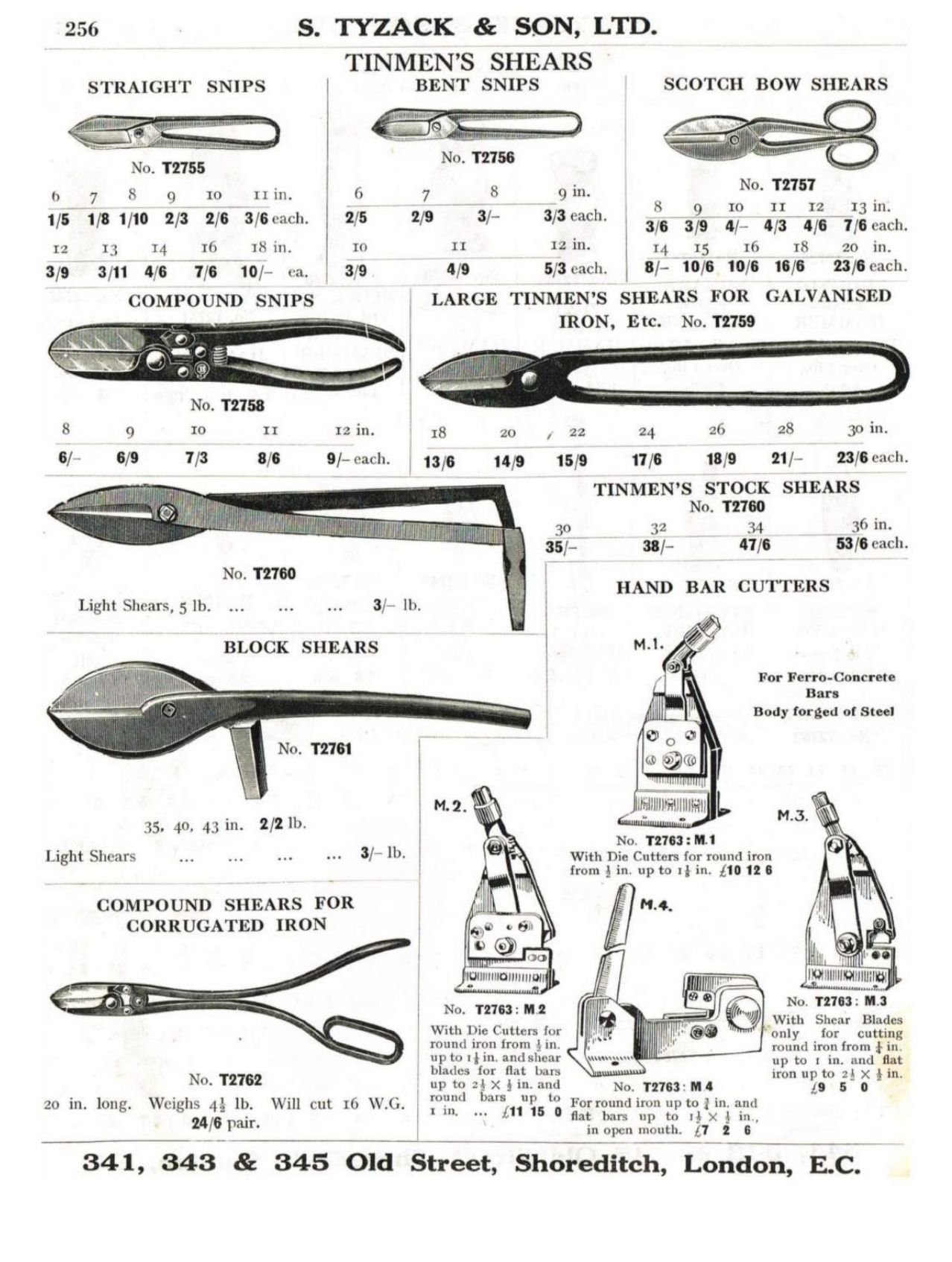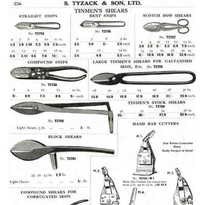 S. Tyzack & Son, Ltd. were London based manufacturers and suppliers of a range of tools. Their Illustrated Price List of Tools and Machinery for Wood and Metal Workers (published c. 1930) shows a range of scissors and metal snips/shears, including: