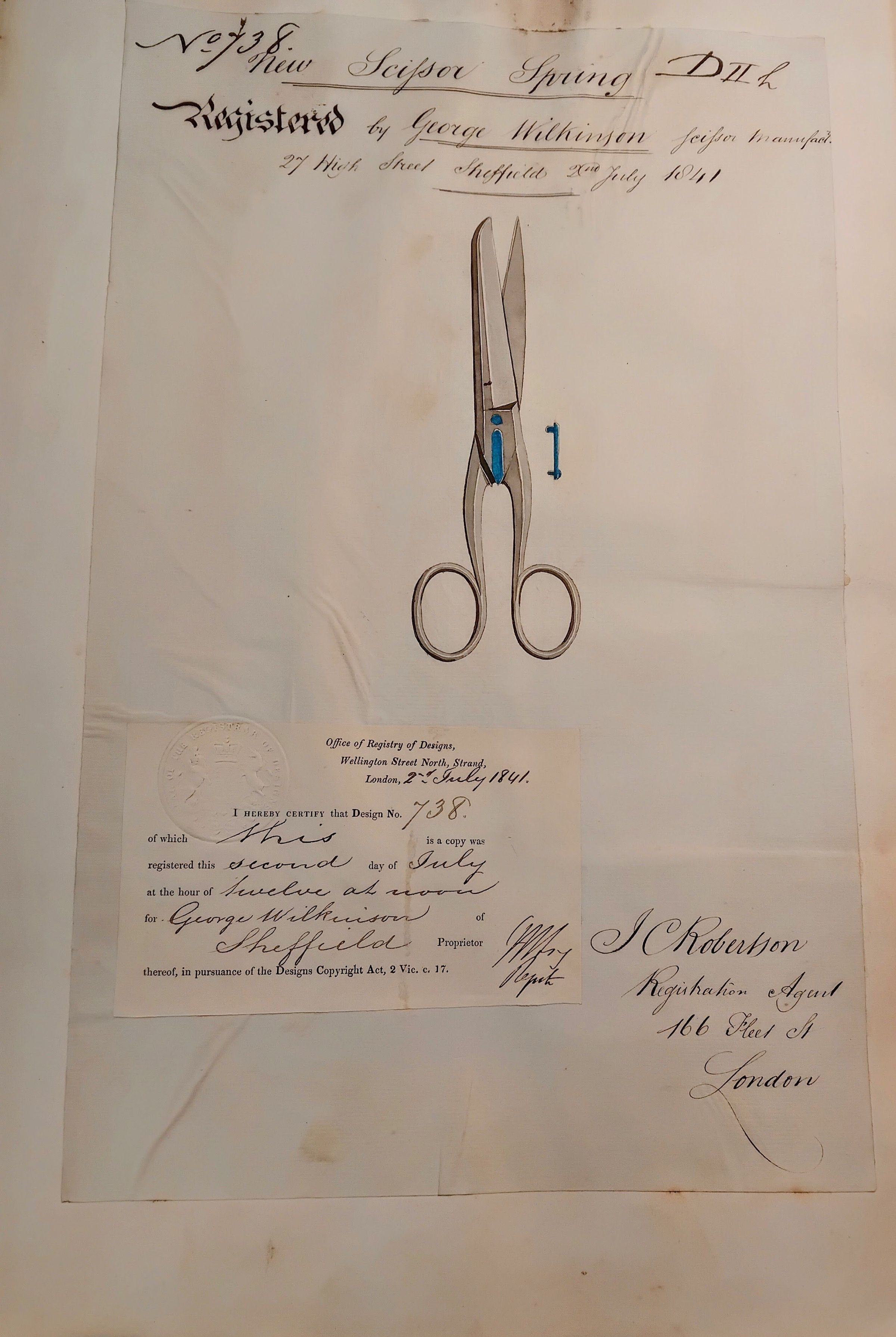 "New Scissor Spring Registered by George Wilkinson scissor manufact. 27 High Street Sheffield 2nd July 1841
