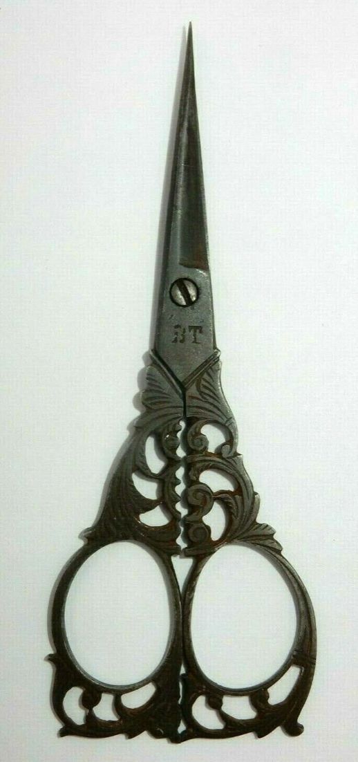 A pair of Italian pierced steel (acciaio traforto) thread scissors marked 'BT', for Bartolomeo Terzano. Pivot type is a screw, point type is pointed. The bows and shanks are cut and filed.Cataloged By