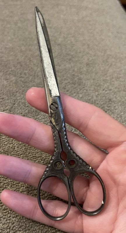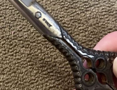 A pair of German carbon scissors with a screw pivot point and asymmetrical point type.Cataloged By