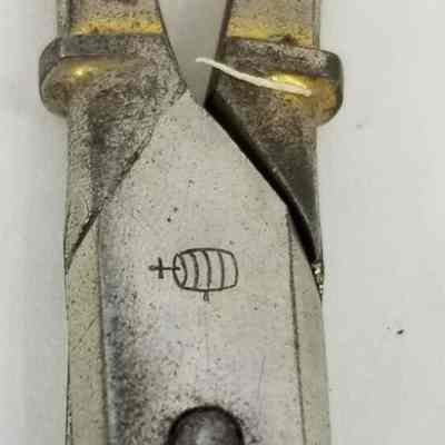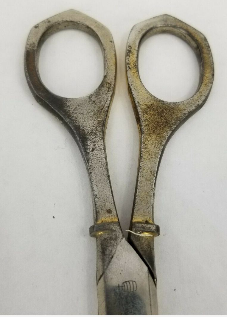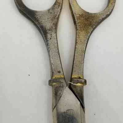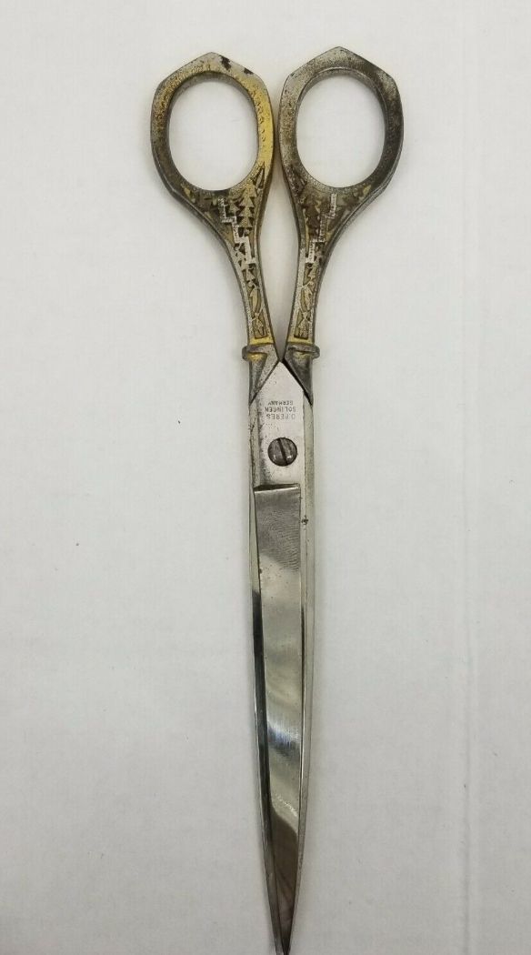 A pair of German carbon scissors made by Daniel Peres in Solingen. The bows and shanks are gilded (decorated on the front, but plain on the reverse), the pivot type is a screw, and the point type is pointed. Marked 'D.PERES SOLINGEN GERMANY' on the front, and with the barrel and tap design on the reverse.Cataloged By