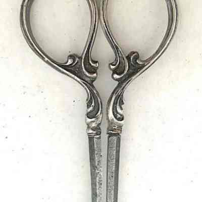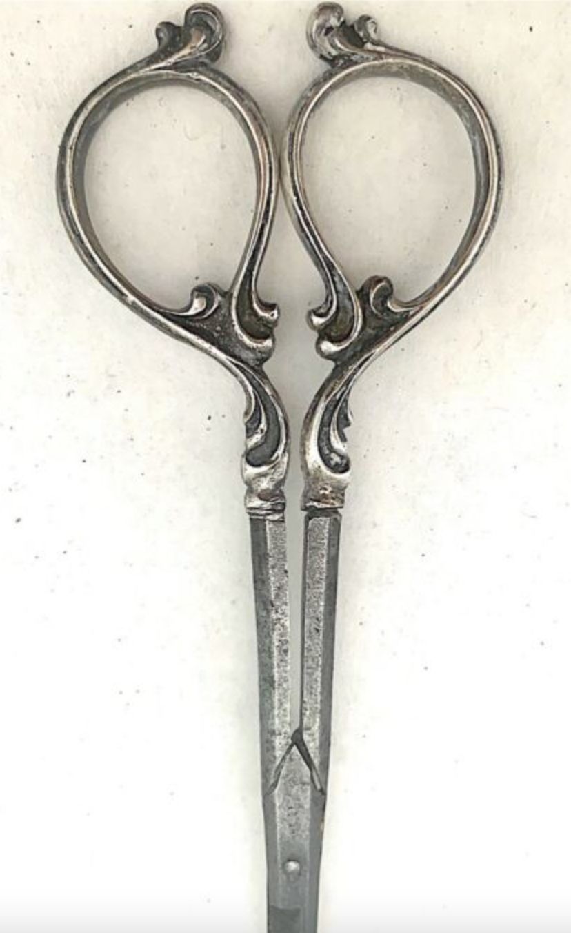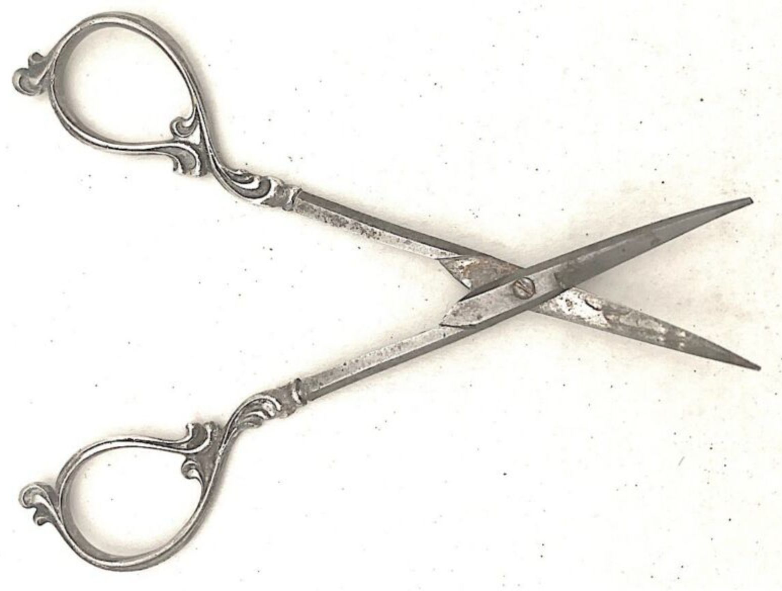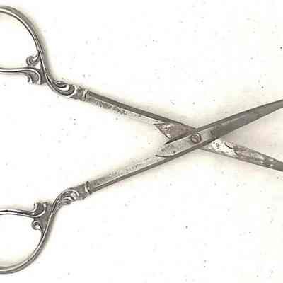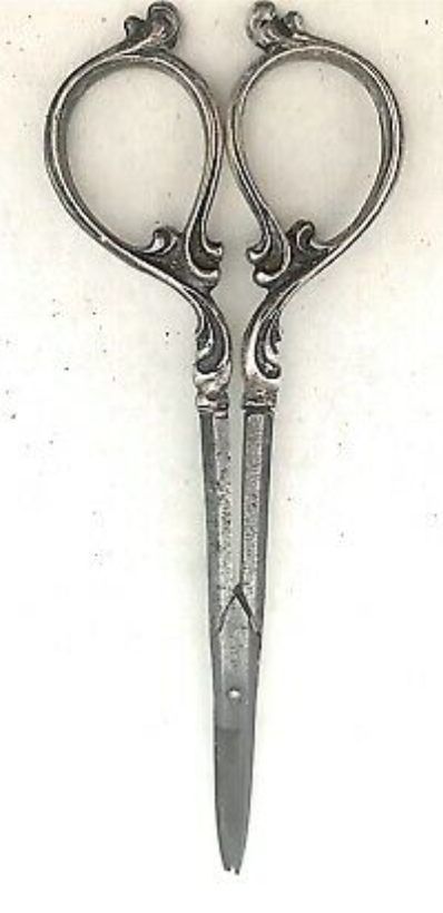 A pair of carbon thread cutting scissors with silver handles. Pivot type is a screw, point type is pointed.Cataloged By