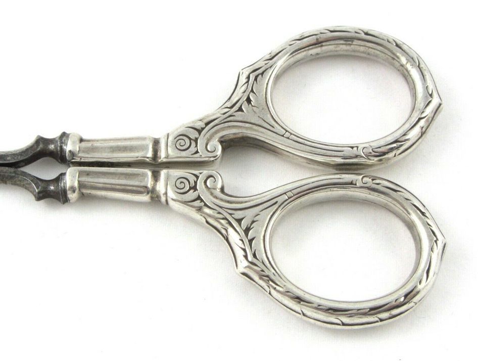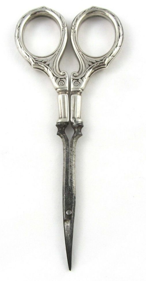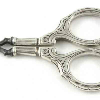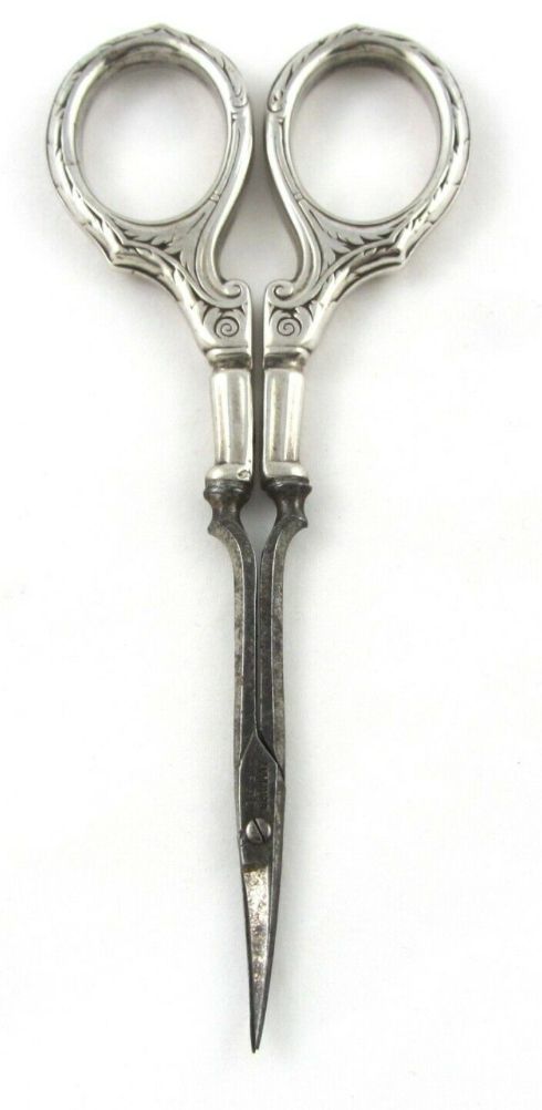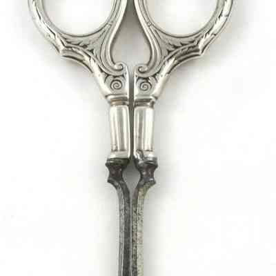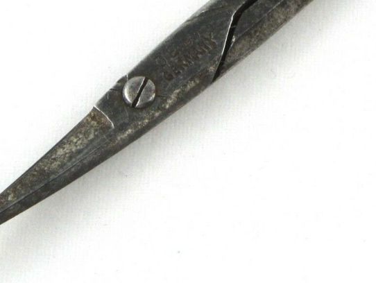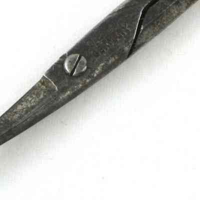 A pair of German, carbon manicure scissors with silver handles. The pivot type is a screw, the point type is pointed, and the blades are curved.Cataloged By