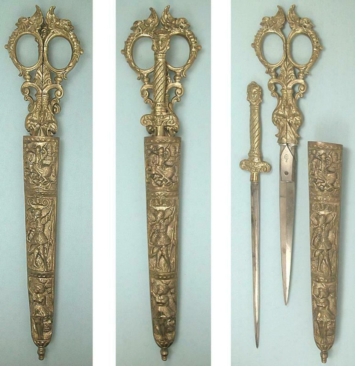 A pair of German desk scissors complete with matching letter opener and sheath. The handles are brass, the pivot type is a screw, and the point type is pointed leaf. Marked 'AUG KNECHT GERMANY SOLINGEN'.Cataloged By