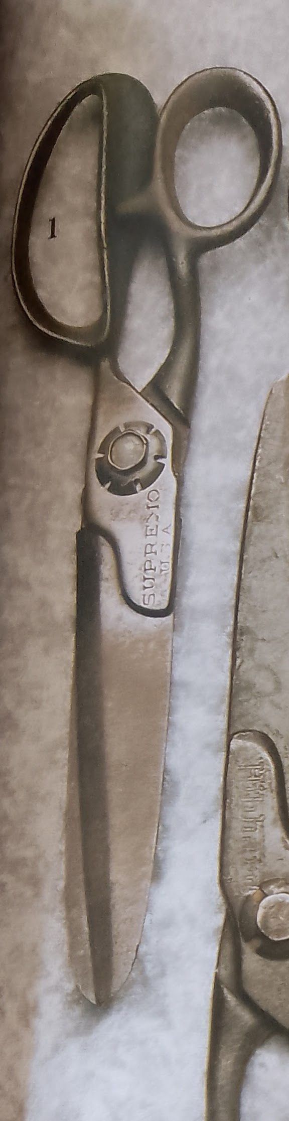 A pair of Supremo U.S.A. brand industrial scissors. Carbon Japanned handles, a bolt and washer pivot type, and rounded point type. The pivot is reinforced.Cataloged By