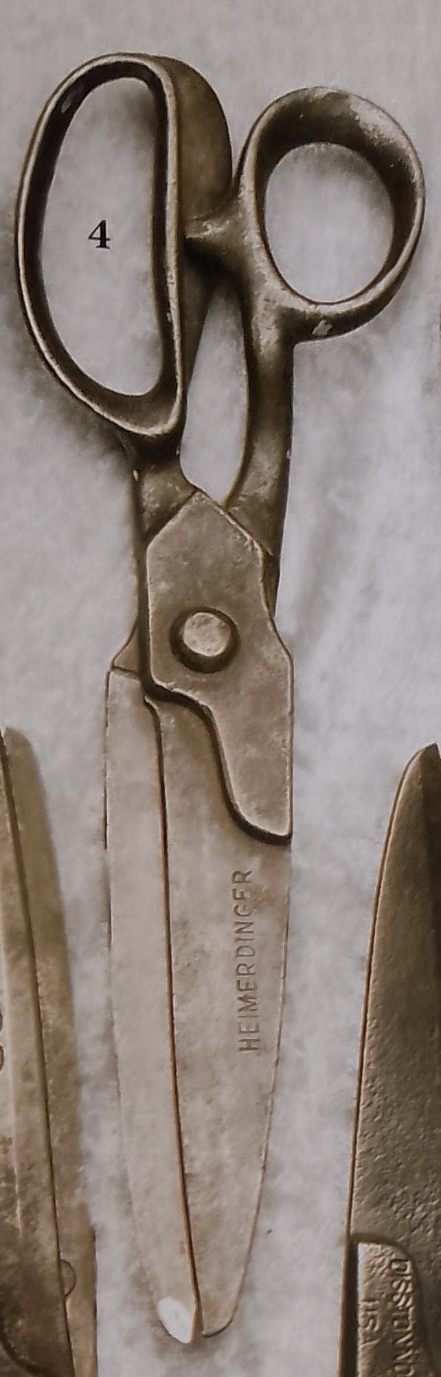 A pair of American, carbon, industrial scissors with japanned handles. The pivot point is bolt, the pivot area is reinforced. Marked 'HEIMERDINGER' on one blade.Cataloged By