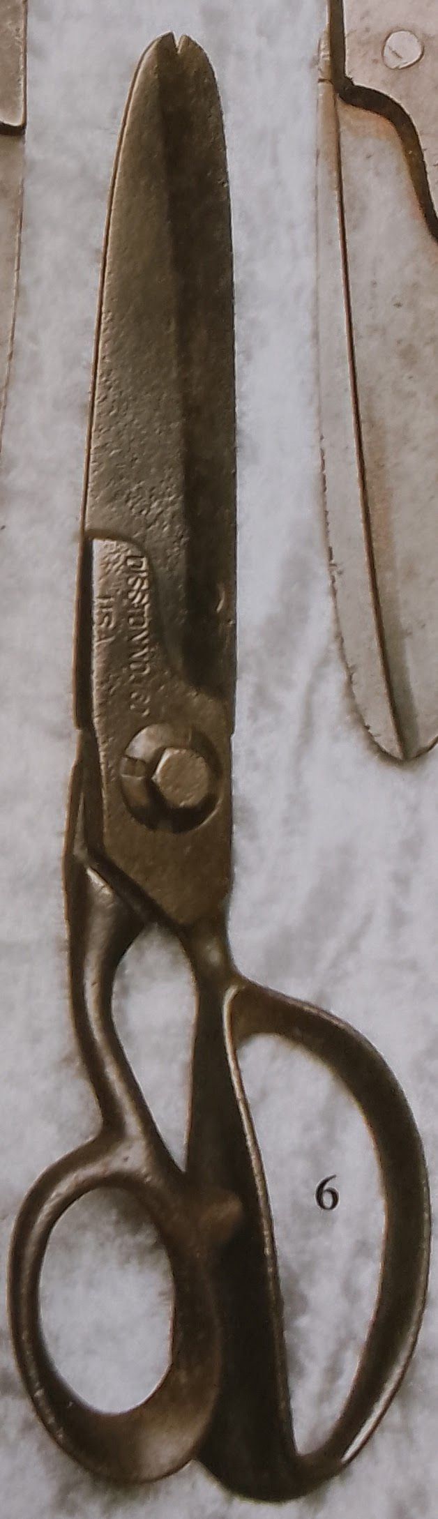 A pair of American, carbon, industrial scissors with japanned handles. The pivot type is bolt and washer, the pivot area is reinforced. They are marked 'DISSTON NO. [180?] USA'.Cataloged By
