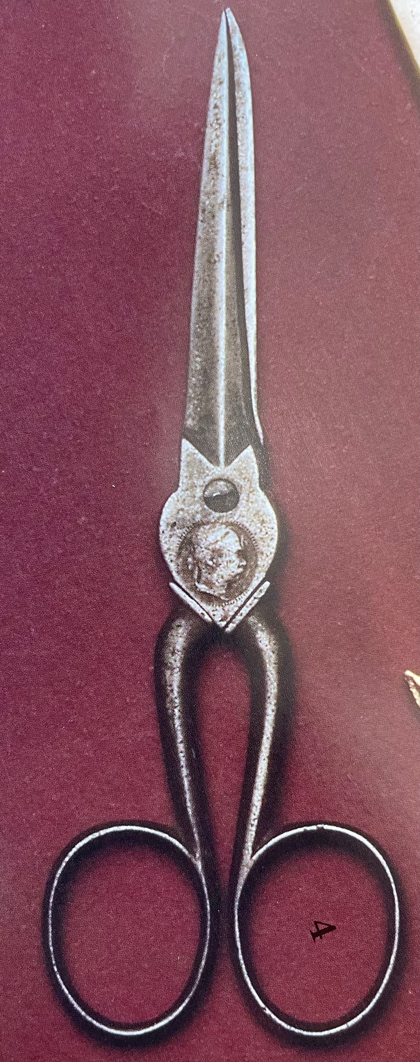 A pair of scissors with a screw pivot point and an asymmetrical point type; the blades are asymmetrical with a dagger grind. An image of the pope is on the body.Cataloged By