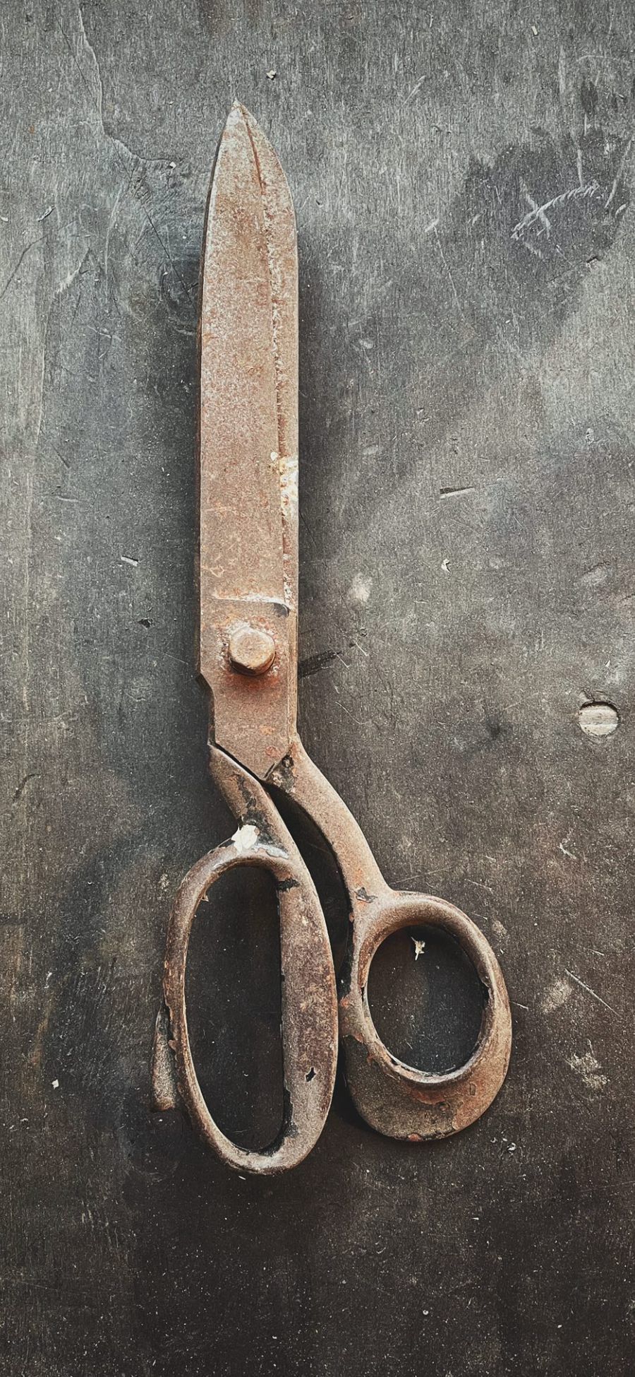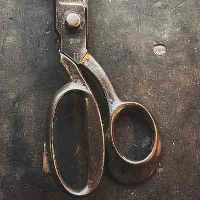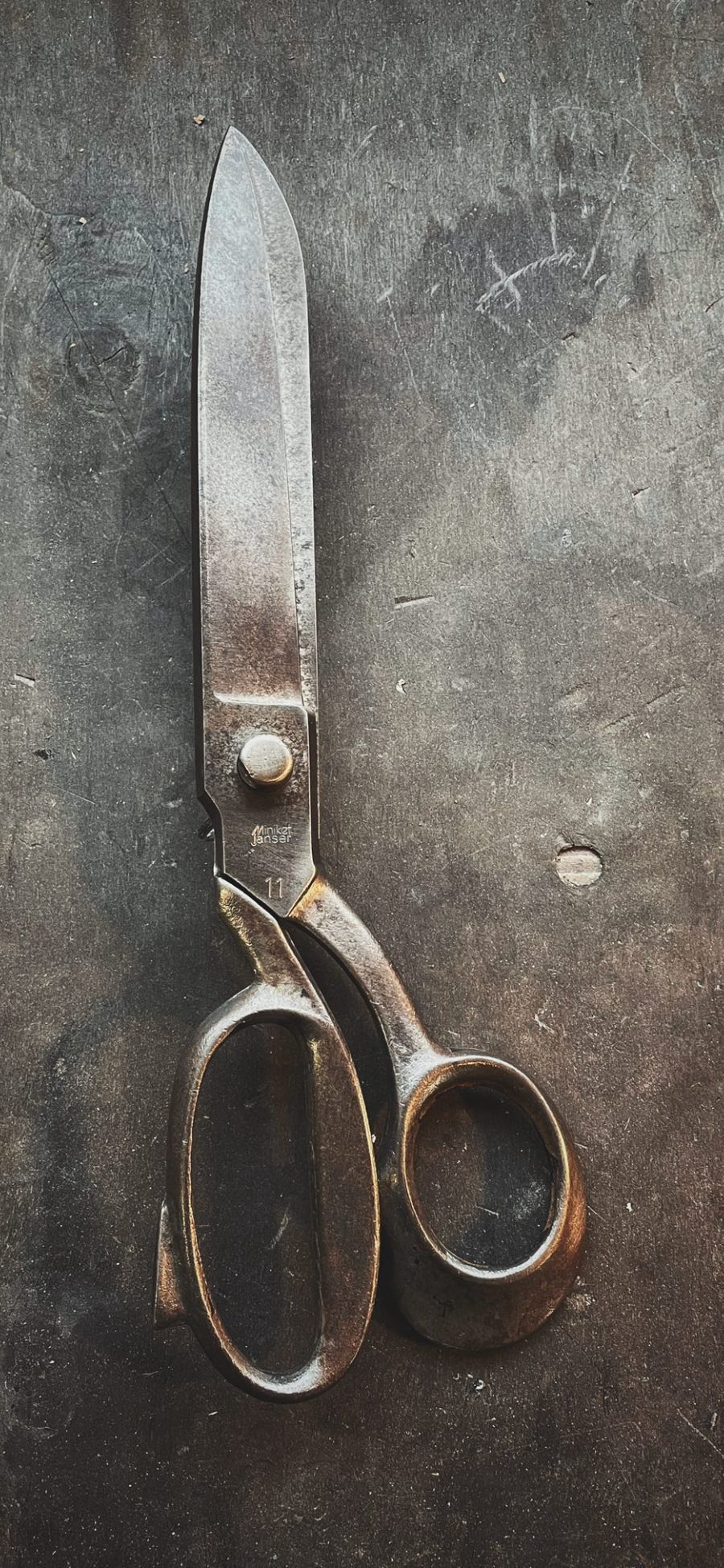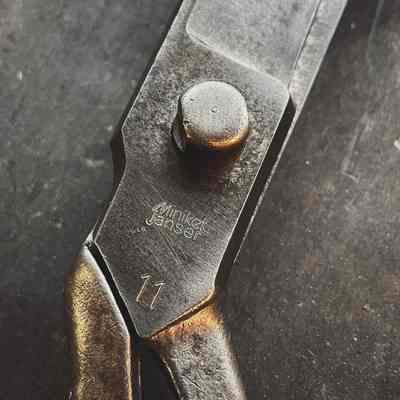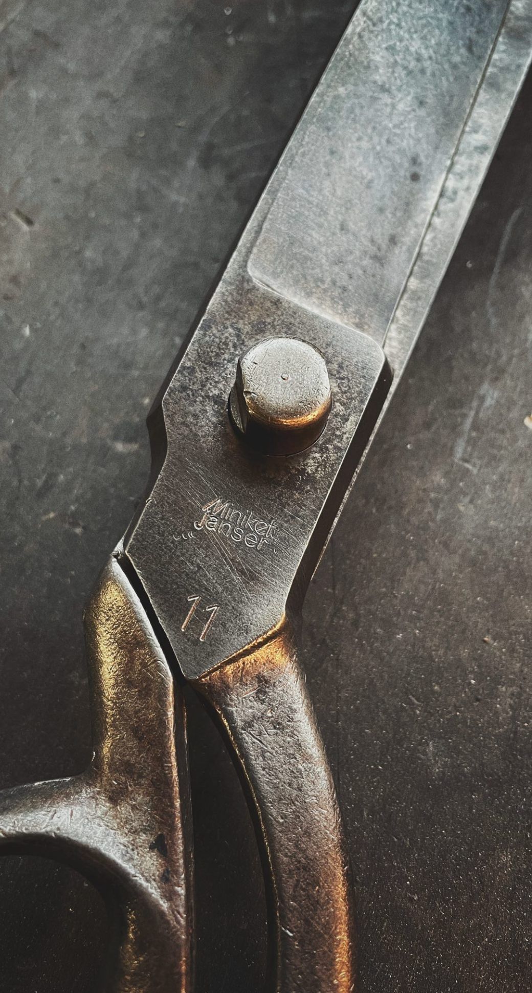 Mid/late 20th century carbon scissors with black japanning, an extended bolt, and a leaf point type. Marked 'Miniket Janser' and '11'.Cataloged By