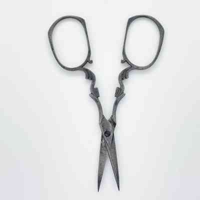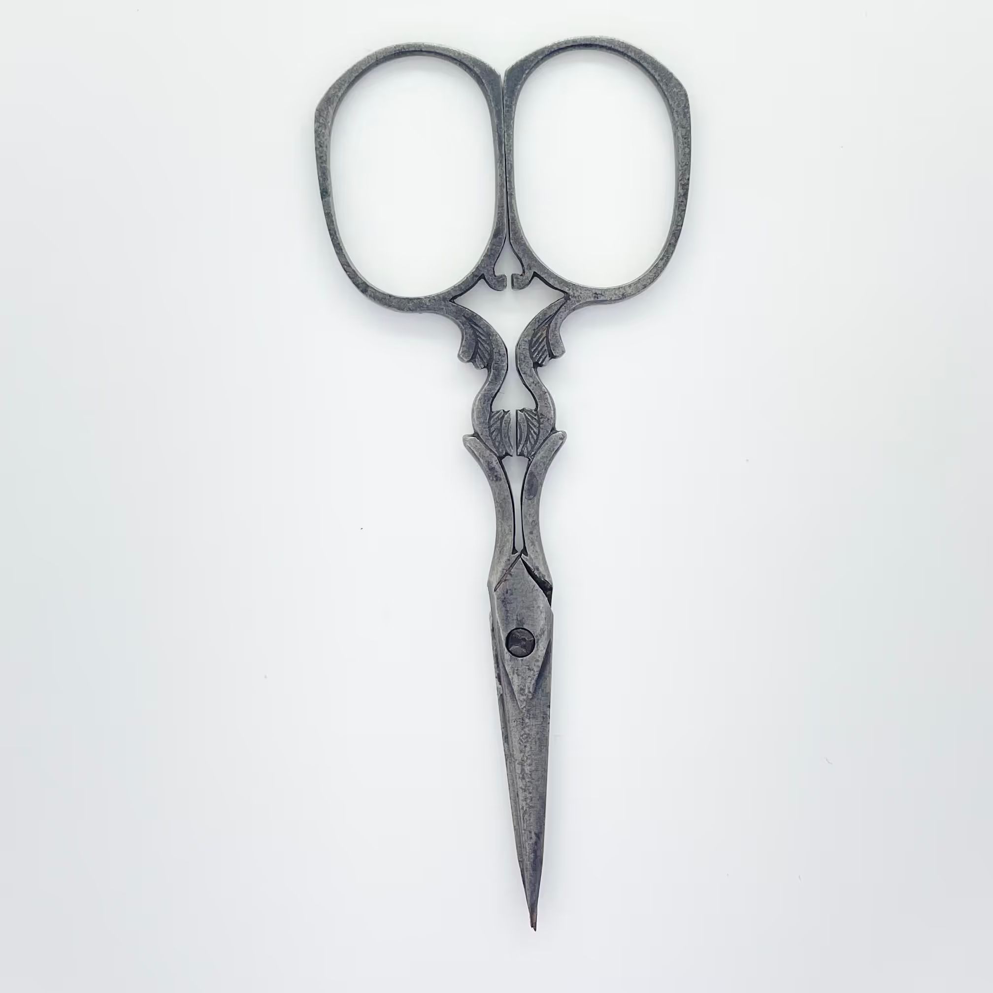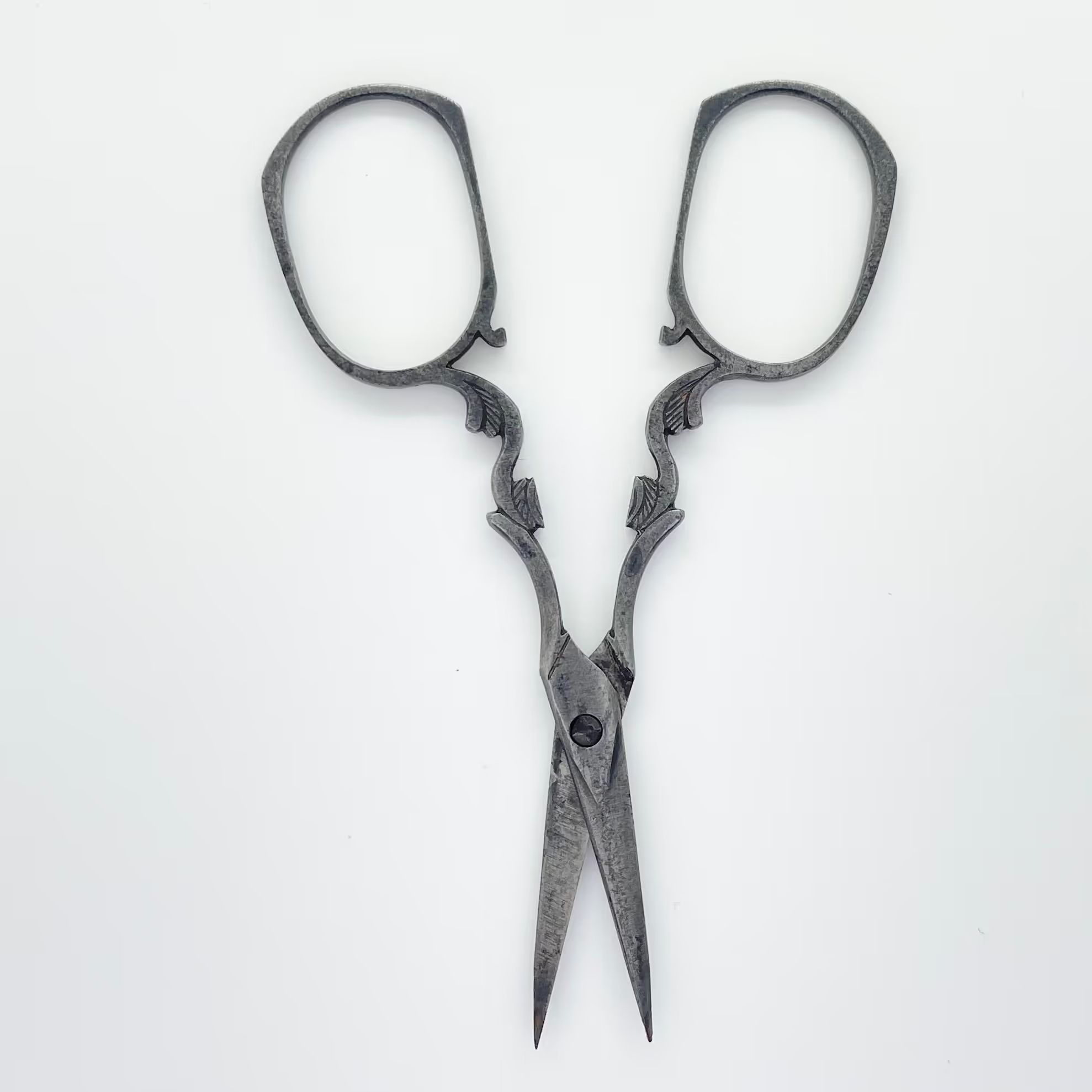 A small pair of scissors with no markings. The shanks are decorated with foliage motifs, shoulder transition is st8, cross section is cs1 and the point is bodkin.Dimensions