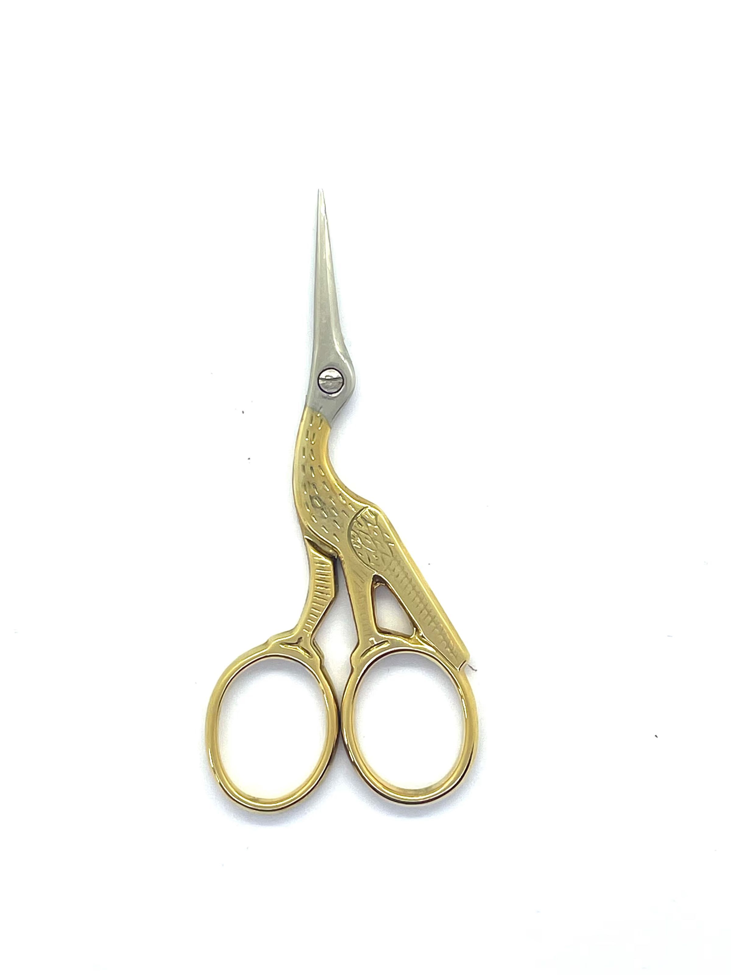 A pair of modern, drop forged stork scissors made in Italy. Gold plated shanks and bows. Screw pivot, no shoulder transition. Cross section is cs2 with bodkin blade and point. Drop forged.Category