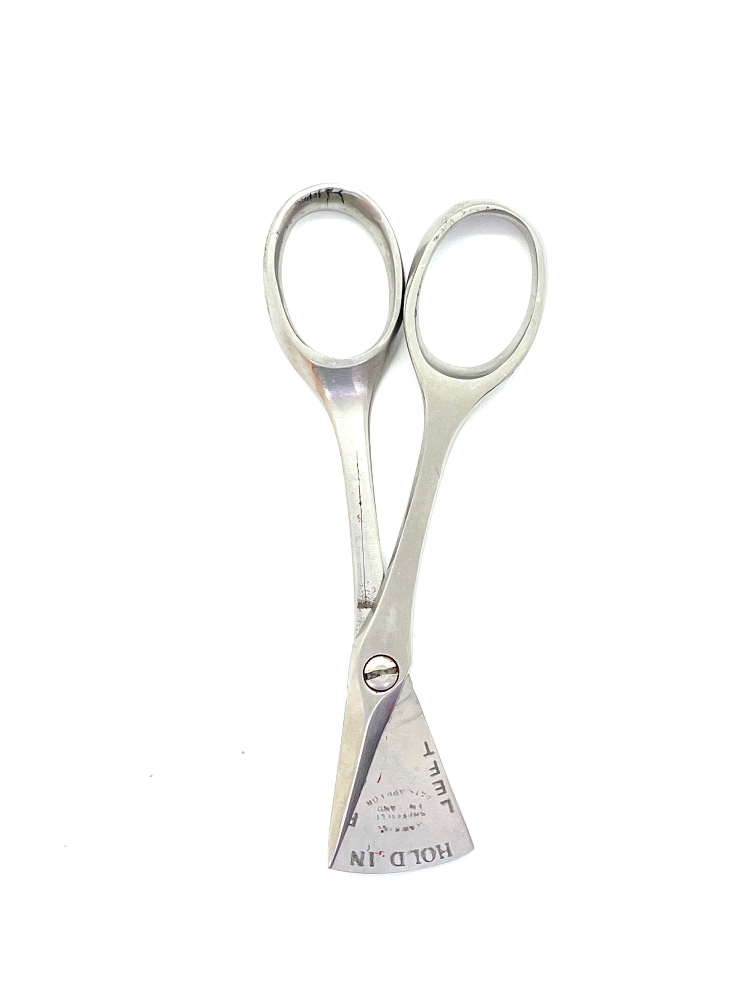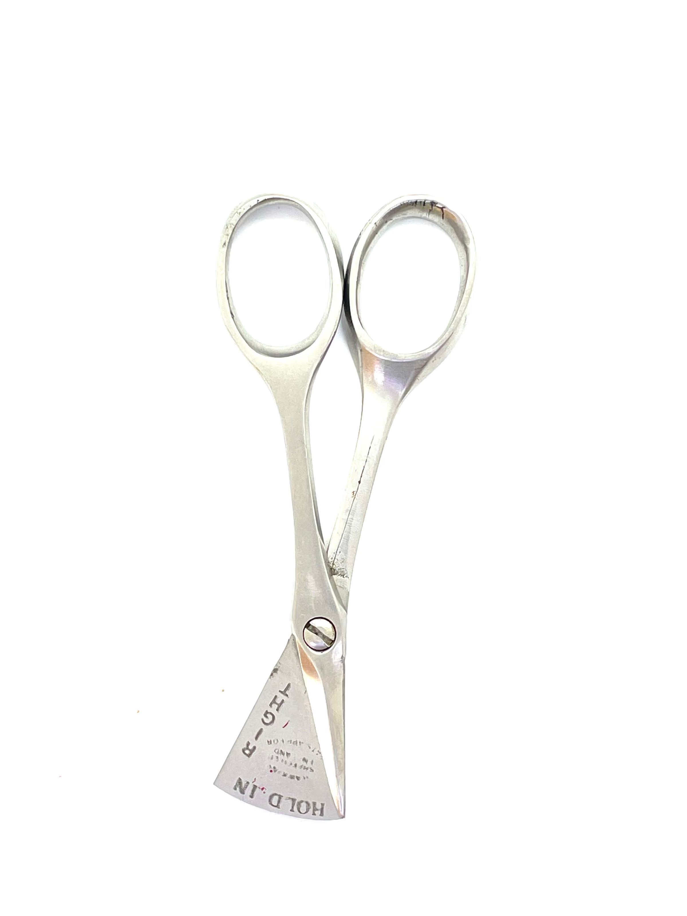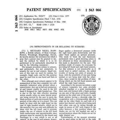 A pair of genuine left-right handed manicure scissors. One side rotates completely around the pivot to enable use with either hand. Pivot is a screw, cross section is cs1. Markings include: HOLD IN; LEFT; RIGHT; MADE IN SHEFFIELD ENGLAND; PAT APP FOR (?).Category