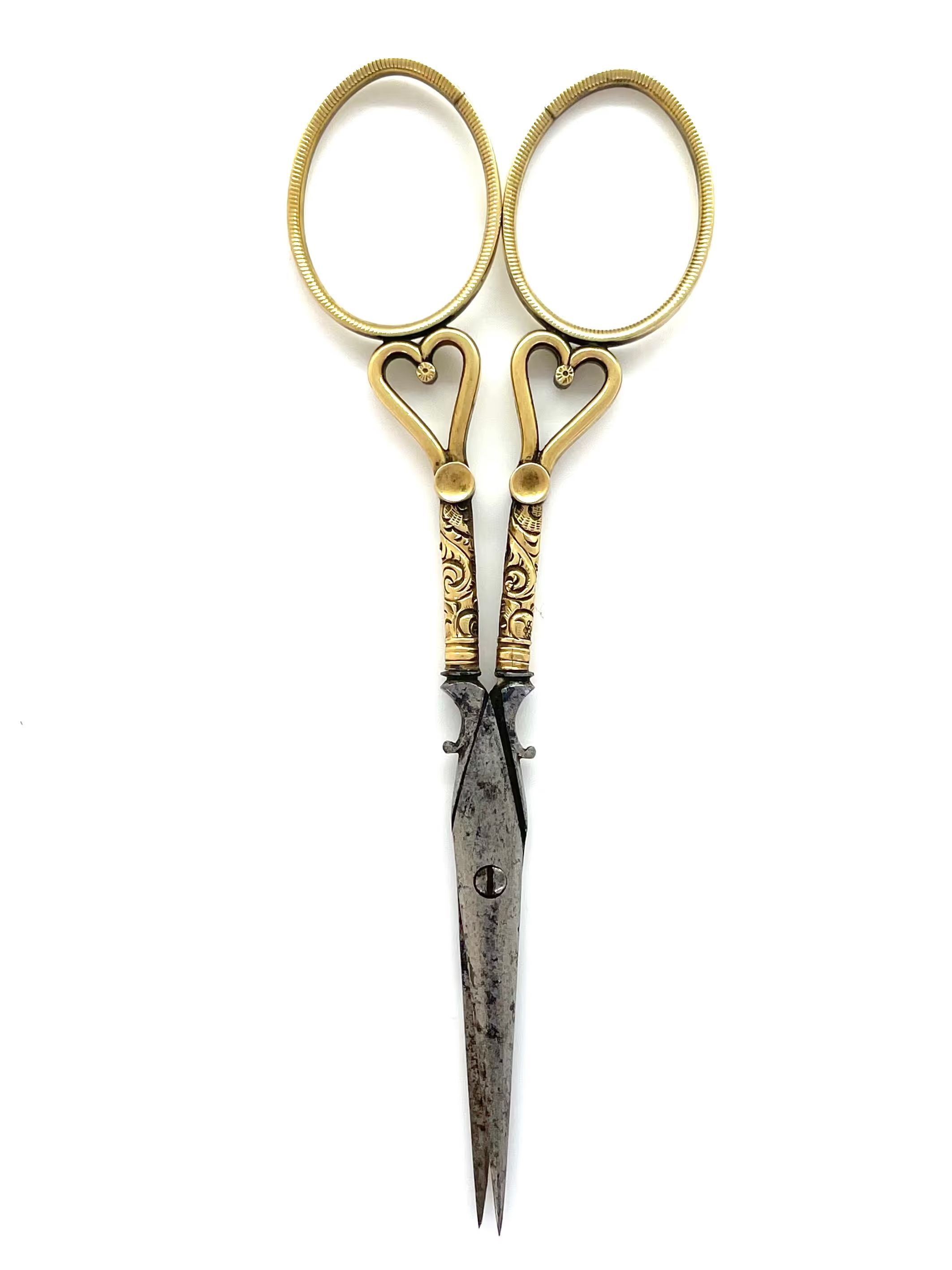 A delicate pair of French scissors with long shoulders. Pivot is a screw, cross section is cs2. Bows and decorated shanks are gold.Made/Created