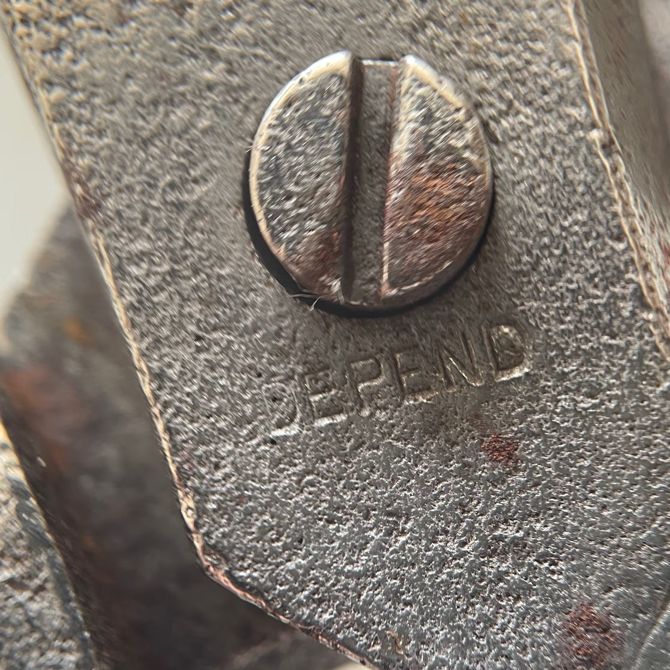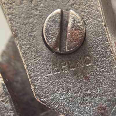 A pair of pruning/vine scissors with unequal bows, a bolt pivot, and asymmetrical point. Shoulder is st1, cross section is cs4. The scissors are marked "DEPEND" on the pivot area; this was a mark registered to Saynor & Co (later passed onto Needham, Veall & Tyzack) so it is likely that these were made by Saynor although there are no other identifying marks to confirm this.