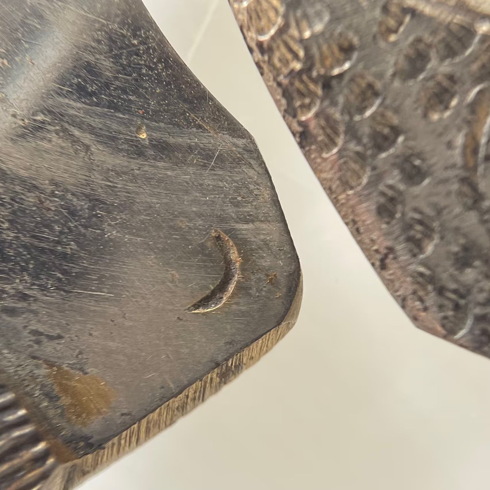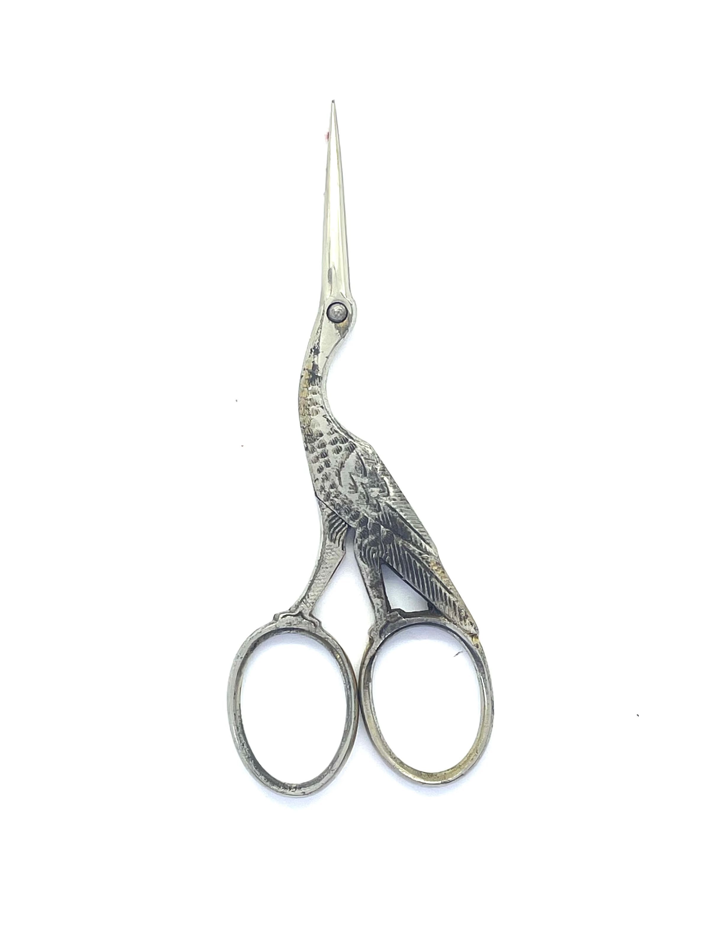A pair of European stork scissors from the second half of the 19th century. The pivot is a rivet, and there is no shoulder transition. Cross section is cs2, with bodkin blade/point. There are no markings to identify manufacturer, but there are pairing marks (crescents).Category