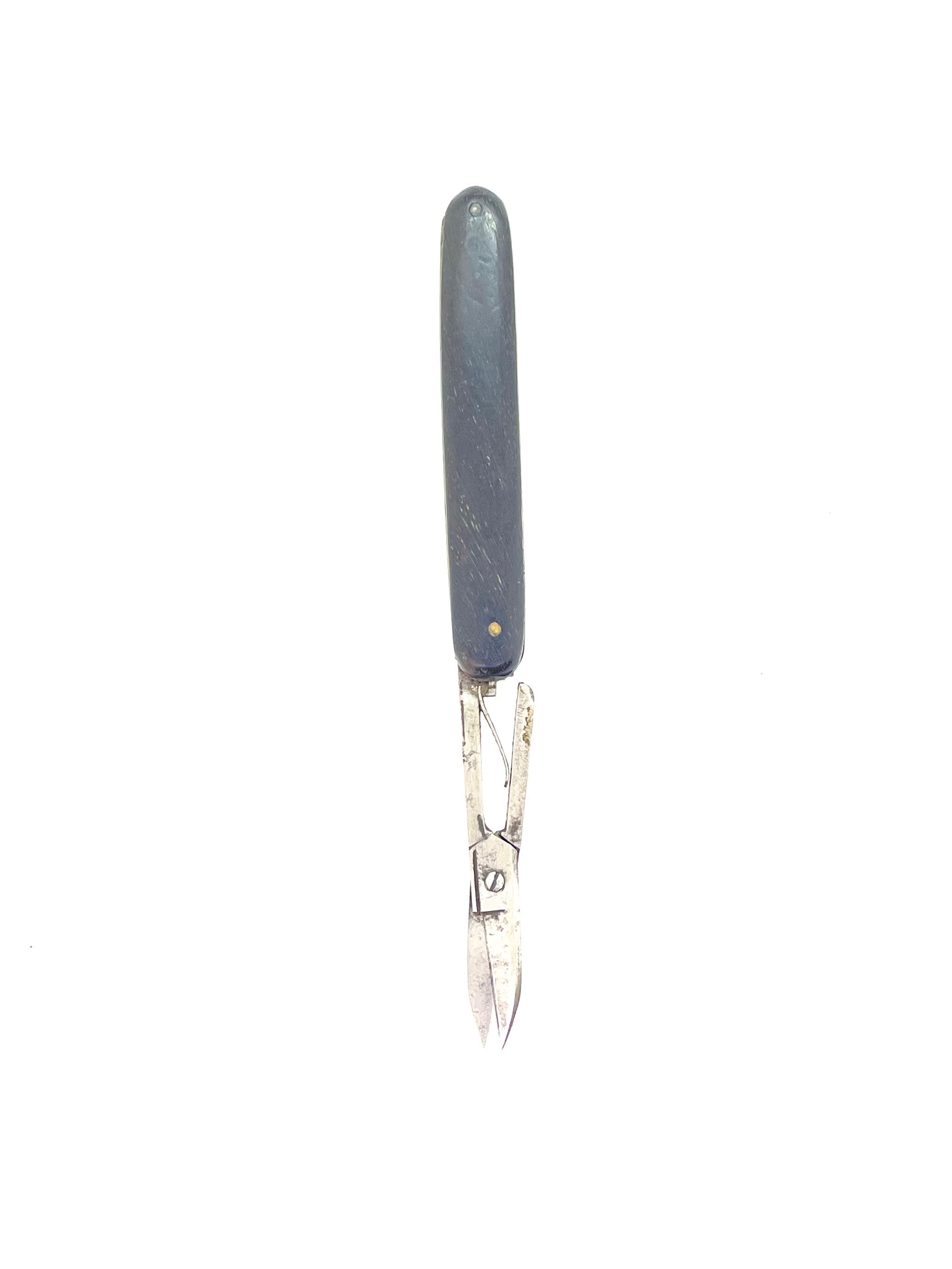 Folding sprung scissors with hardwood scales and brass liners. Point type is leaf, shoulder is st1, cross section is cs8. The pull is a long French nail pull, and there are no other blades or files included.Category