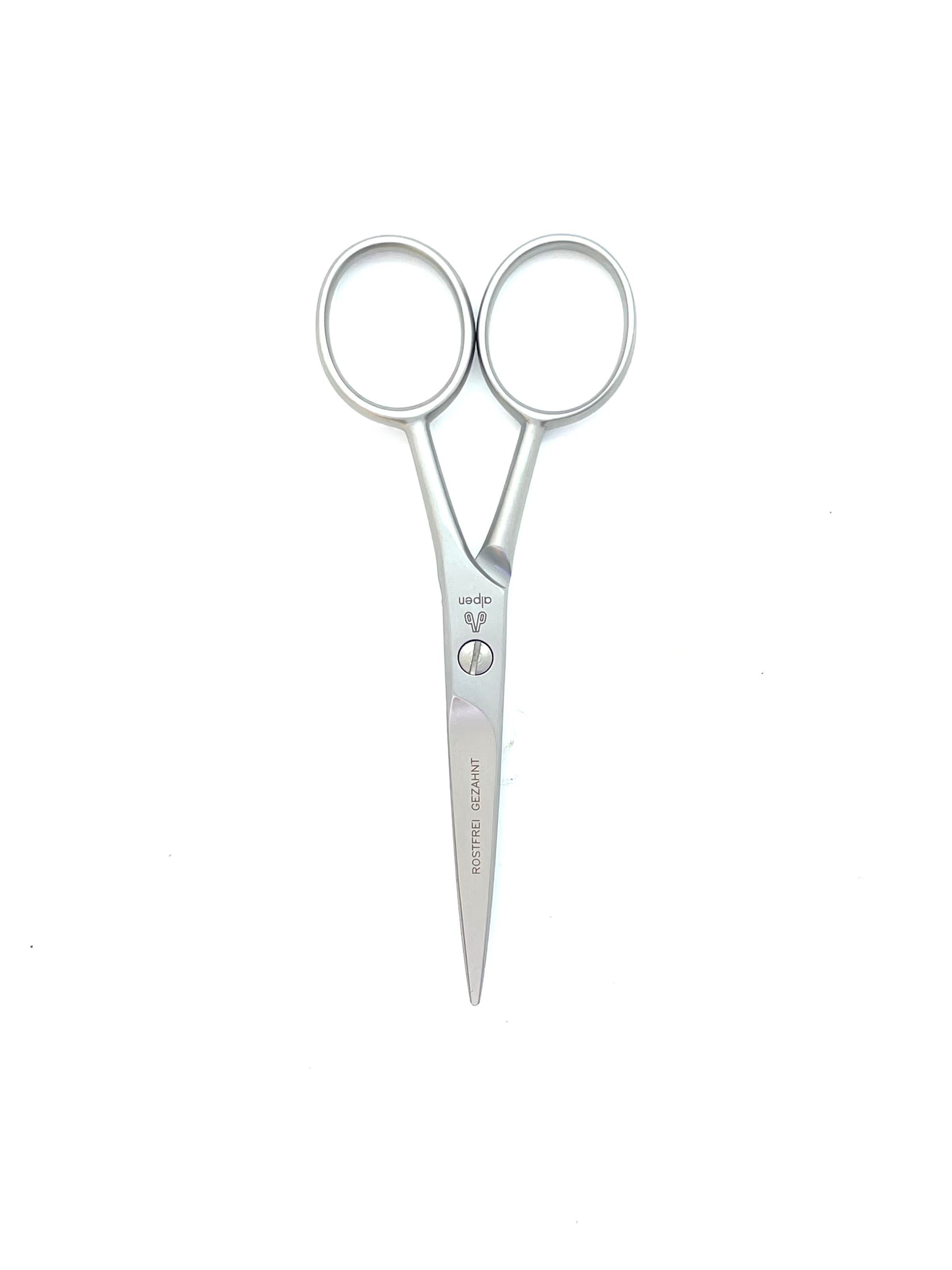 A pair of modern whisker or moustache scissors. One blade is smooth, one has fine serration (this blade is marked "ROSTFREI GEZAHNT" - which translates as "stainless serrated"). The pivot type is a screw, shoulder is st6, cross section in cs4. Shank type is quaker. Marked "alpen" at the pivot.Category