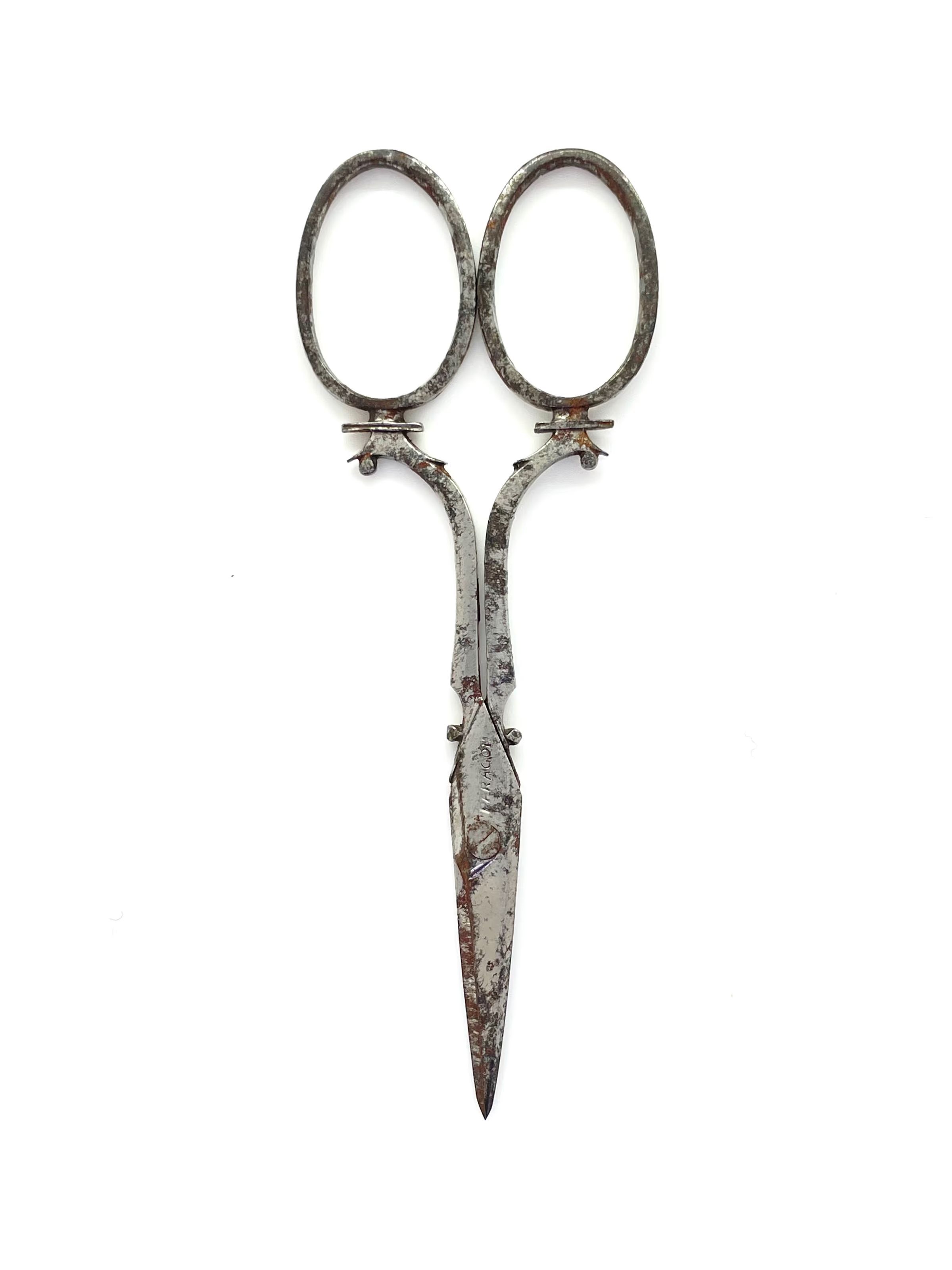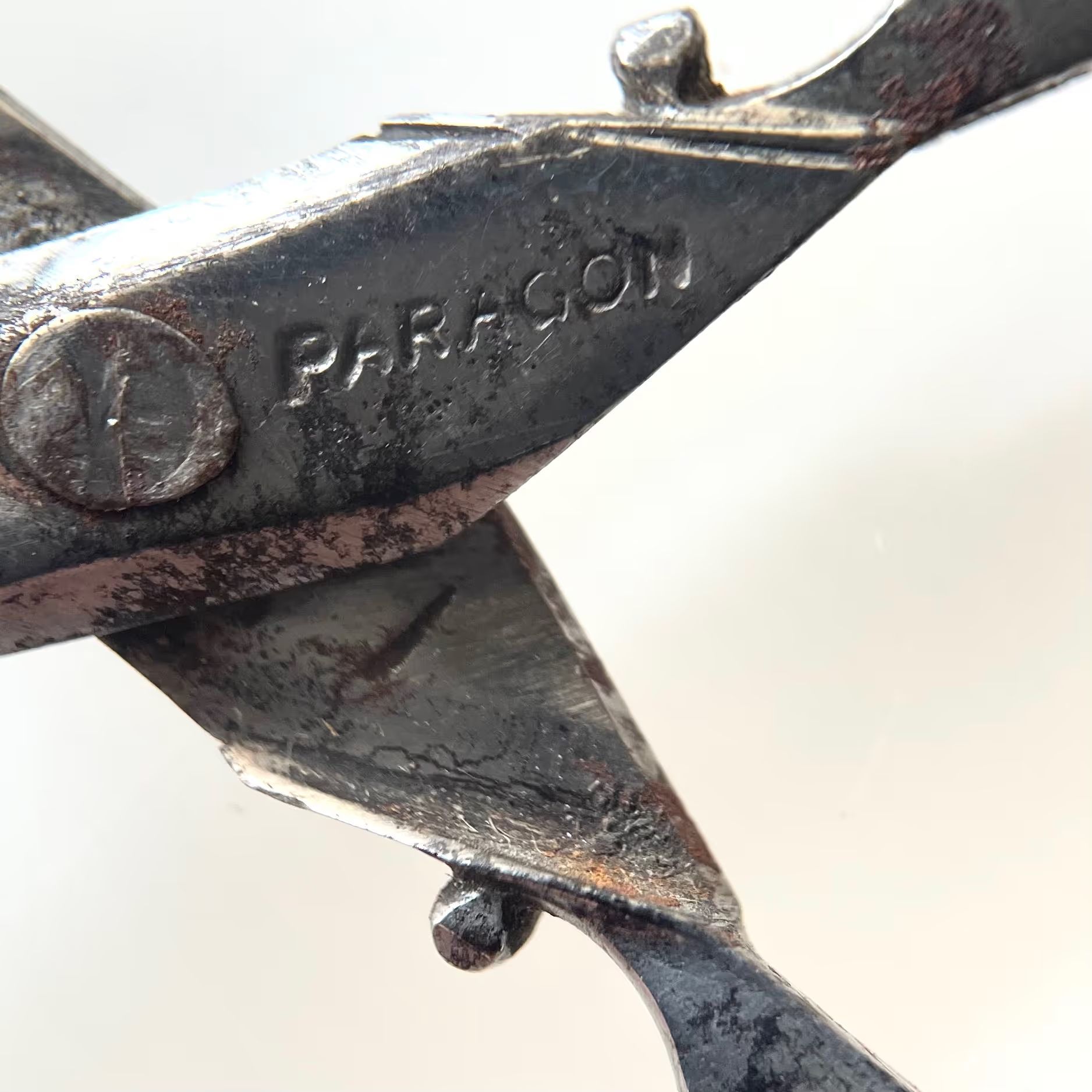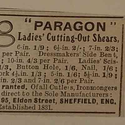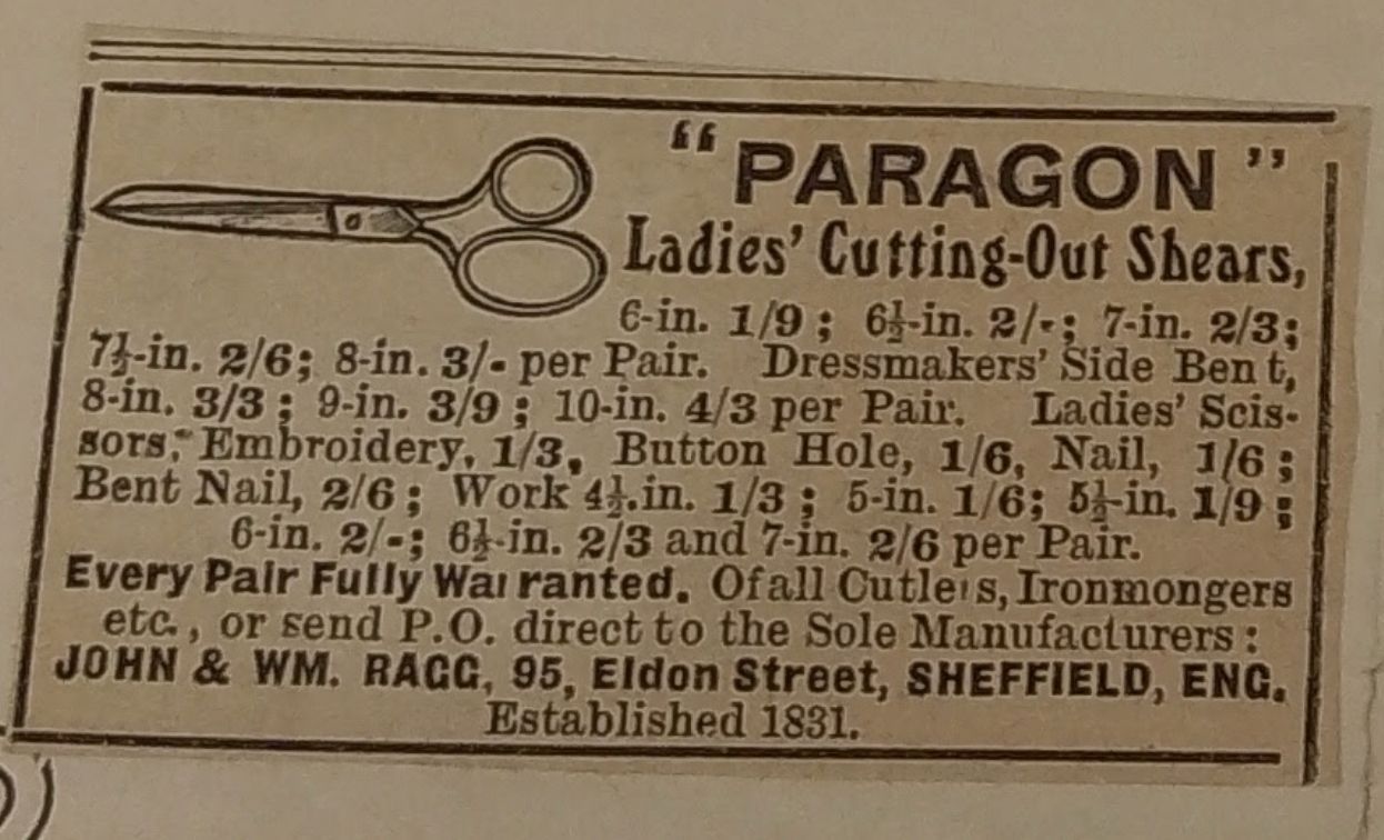 A small pair of plated scissors. Pivot is a screw, shoulder is st3 and cross section is cs4. Shank type is sarum with a thread neck. Marked PARAGON which was a mark registered to J & W Ragg of Sheffield, registered before 1851. The unders have pairing marks.Made/Created