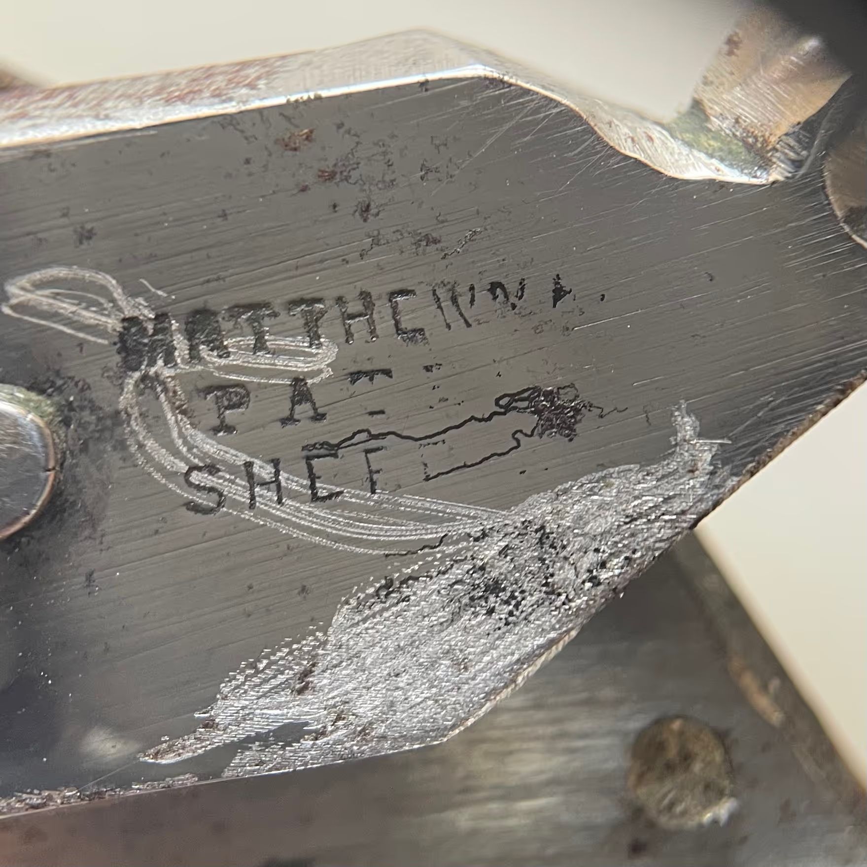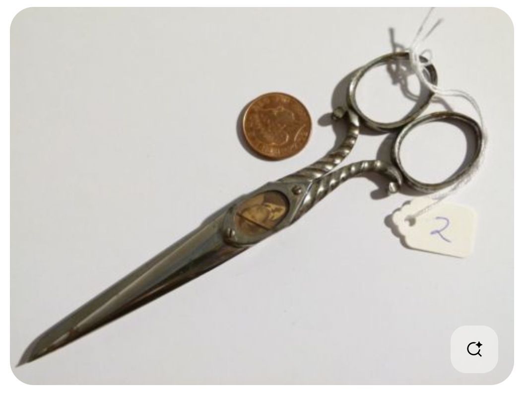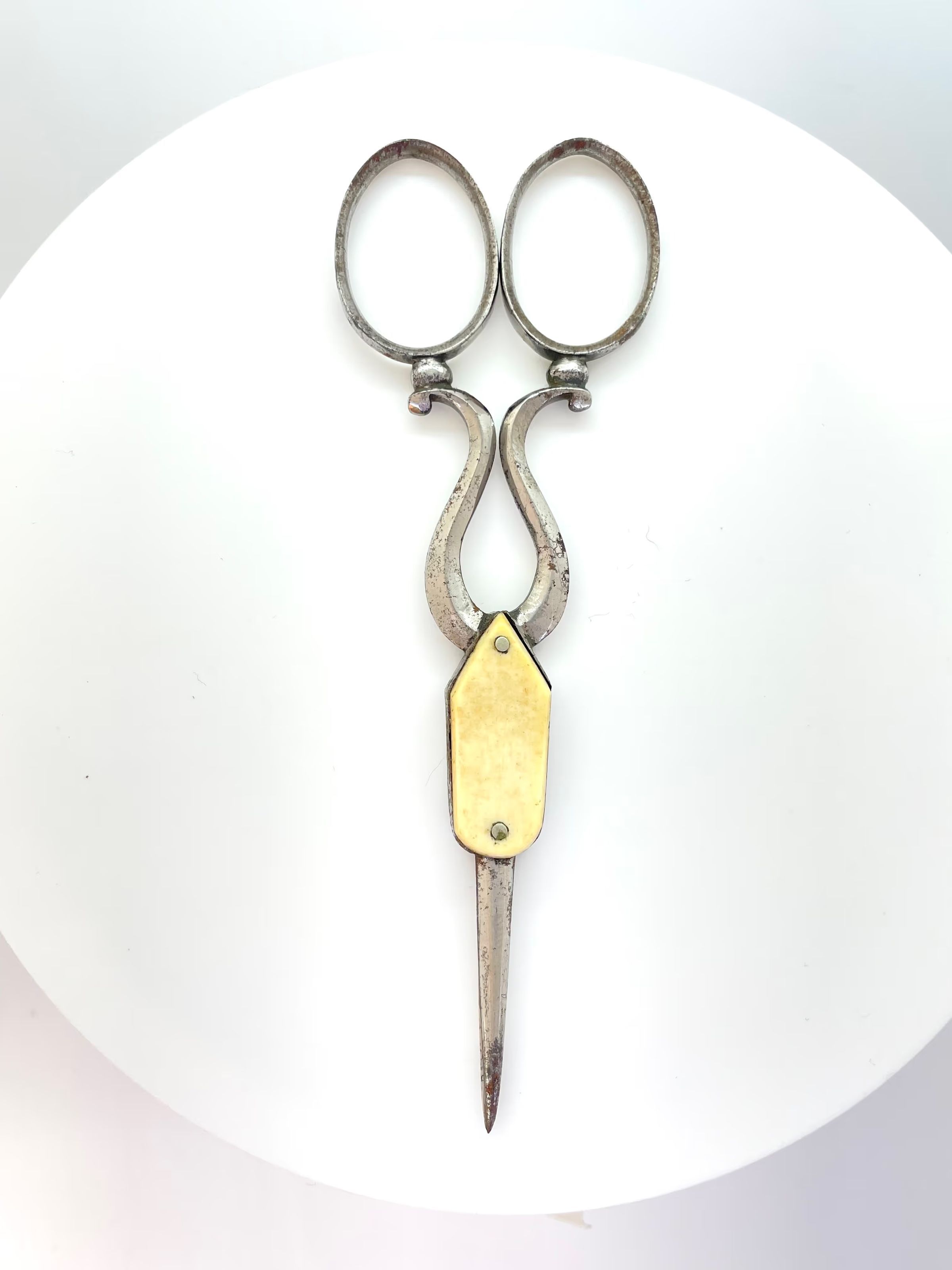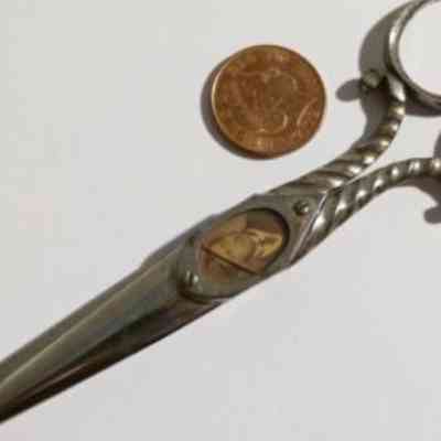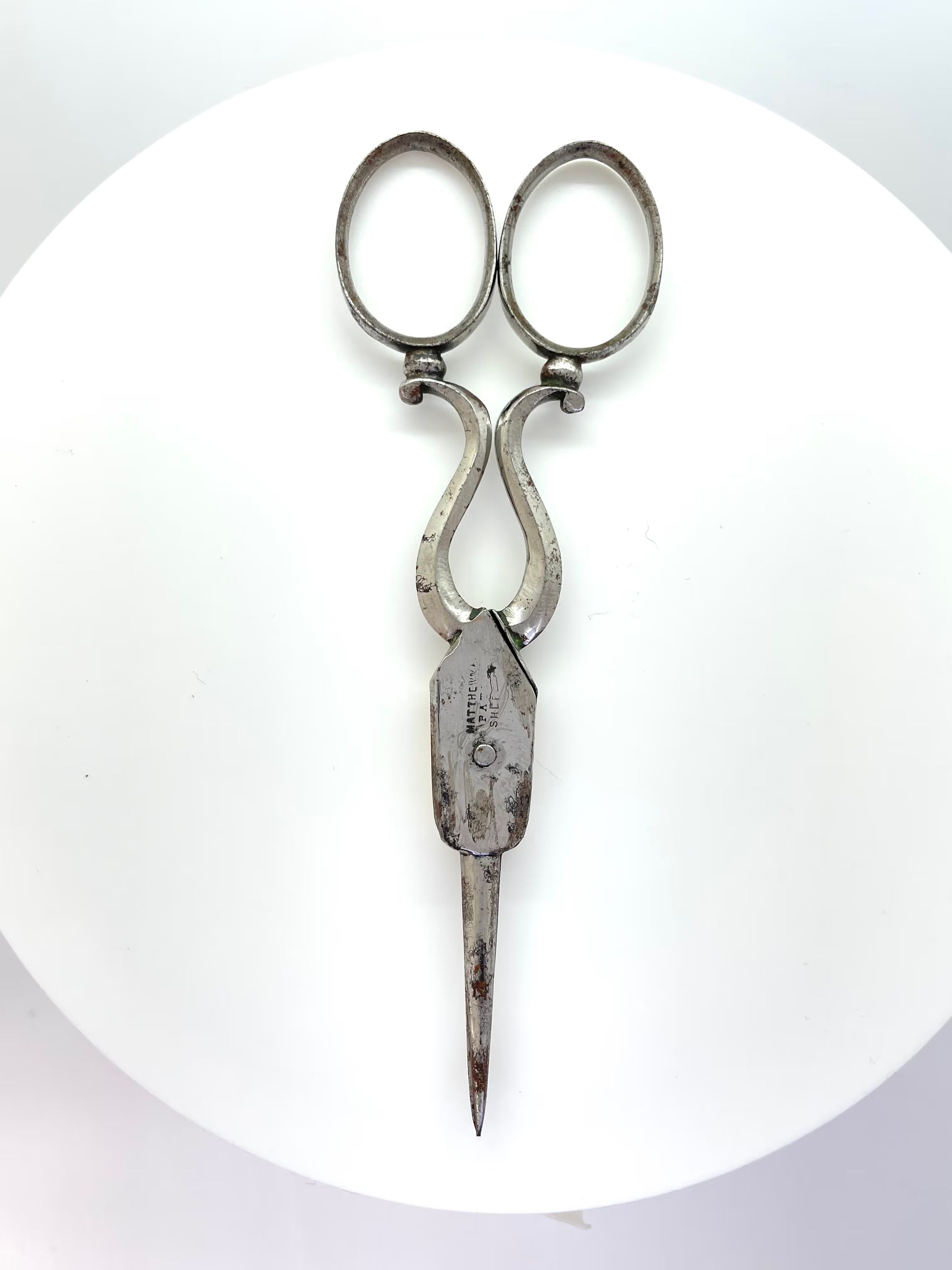 A pair of scissors with an ivory overlay on one side of the pivot area; the reverse side is marked with "MATTHEWM[AN?] PAT SHEF". There was a scissor maker in Sheffield in the 1800s called Matthewman, so it could be one of theirs. The blade is bodkin with cs2 cross section.Made/Created