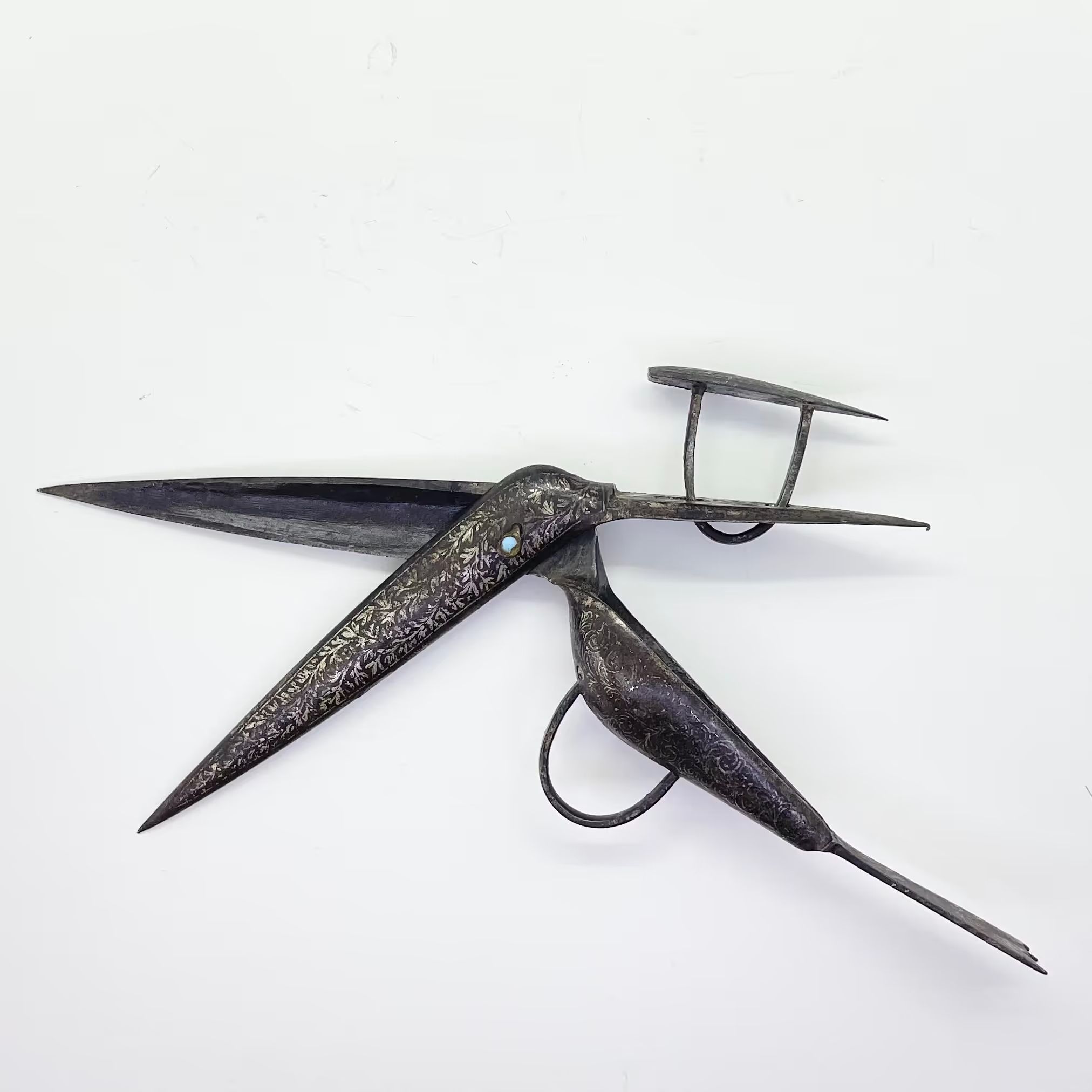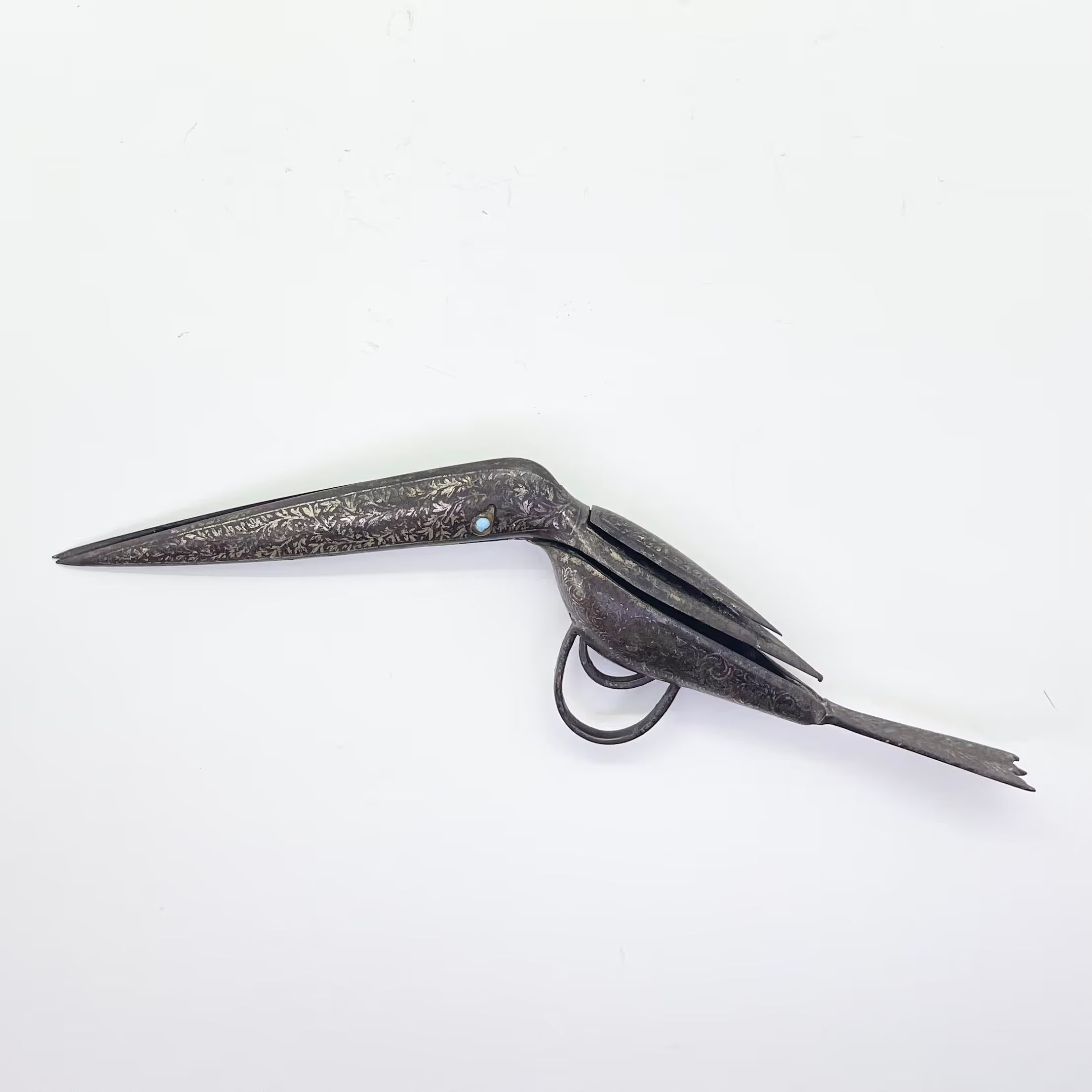 A pair of scissors in the shape of a bird, with koftgari decoration and a blue glass 'eye' on the pivot.