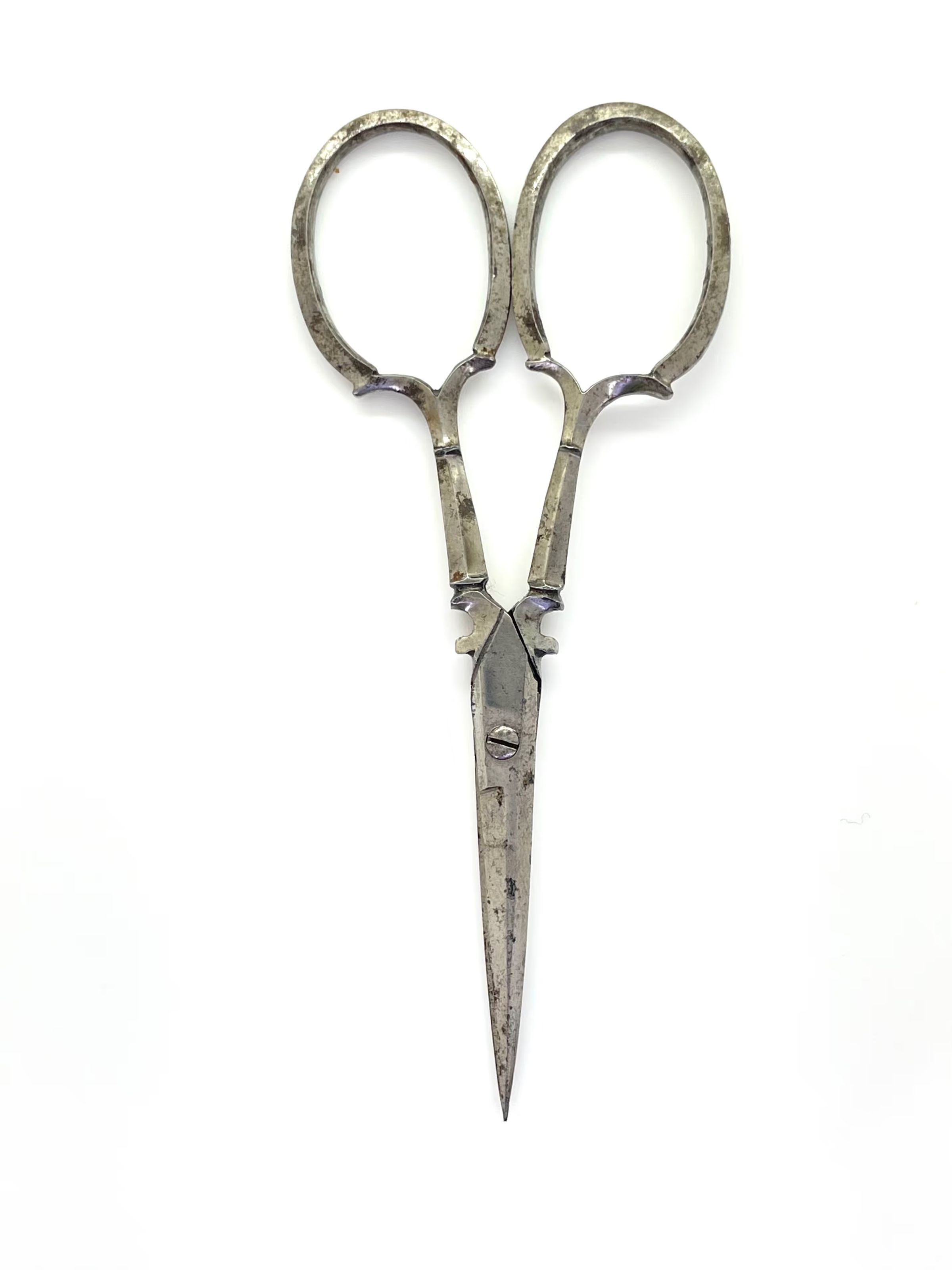 A delicate pair of scissors with double wing quaker shanks and a screw pivot. Shoulder is st2, cross section is cs8, and point is bodkin. Small triangle marks on under.Inscription/Signature/Marks