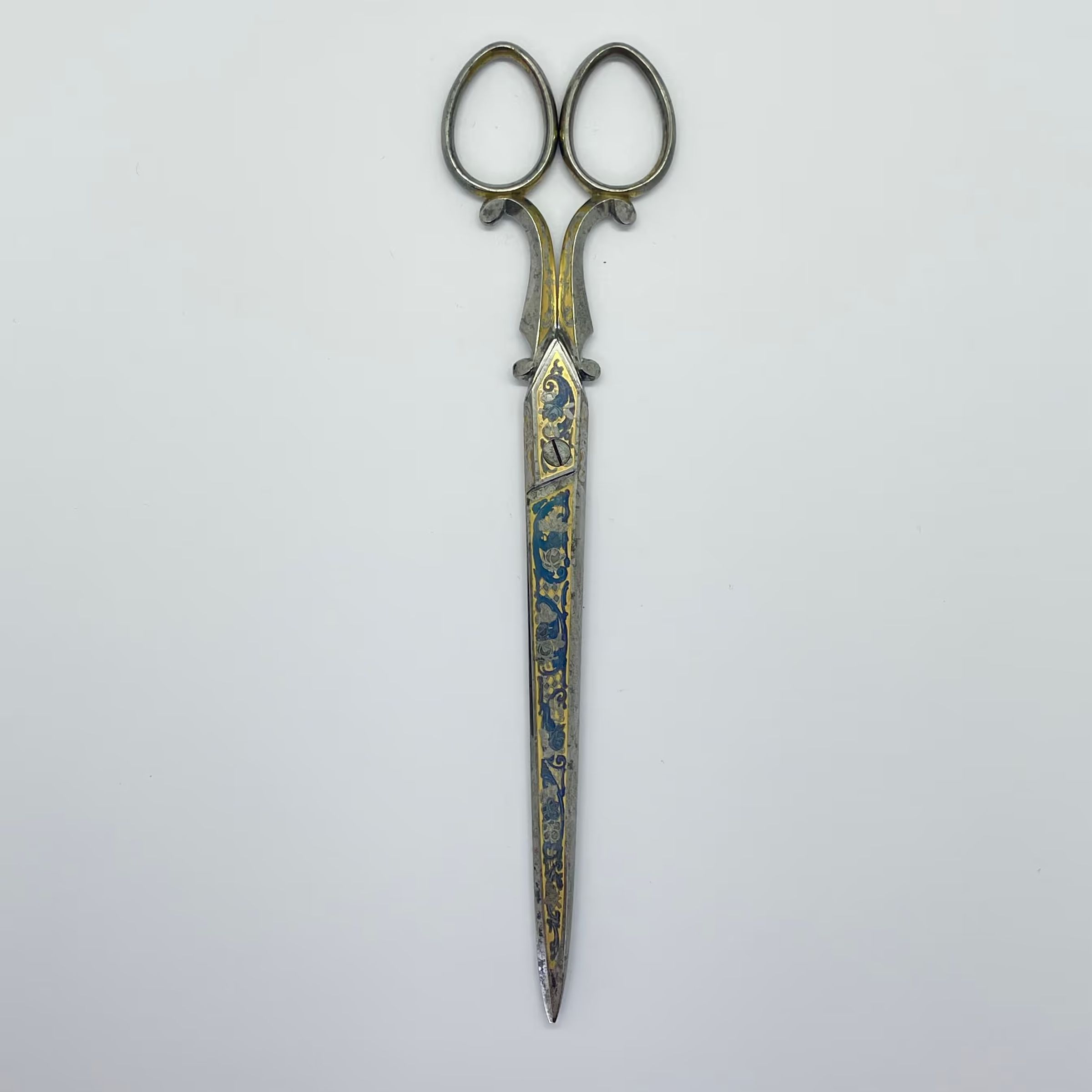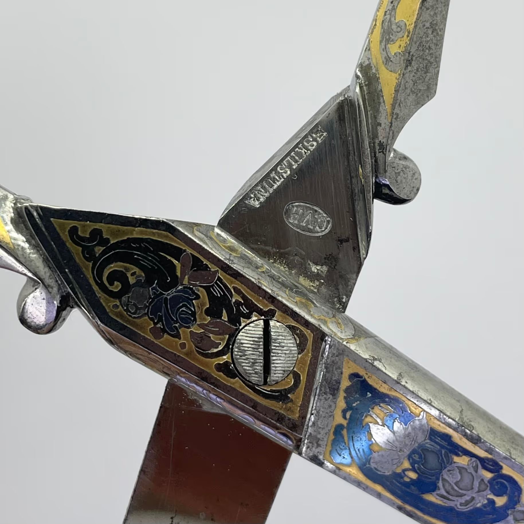 A pair of Swedish scissors with relatively short shanks and long blades. The shank is sarum, shoulder is st3, cross section is cs10. The blue and gold decoration is very distinctive, and typical of Swedish scissors.
