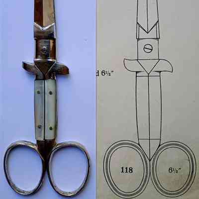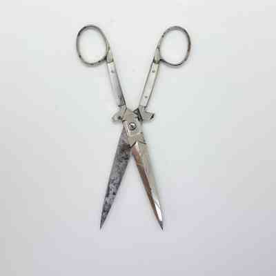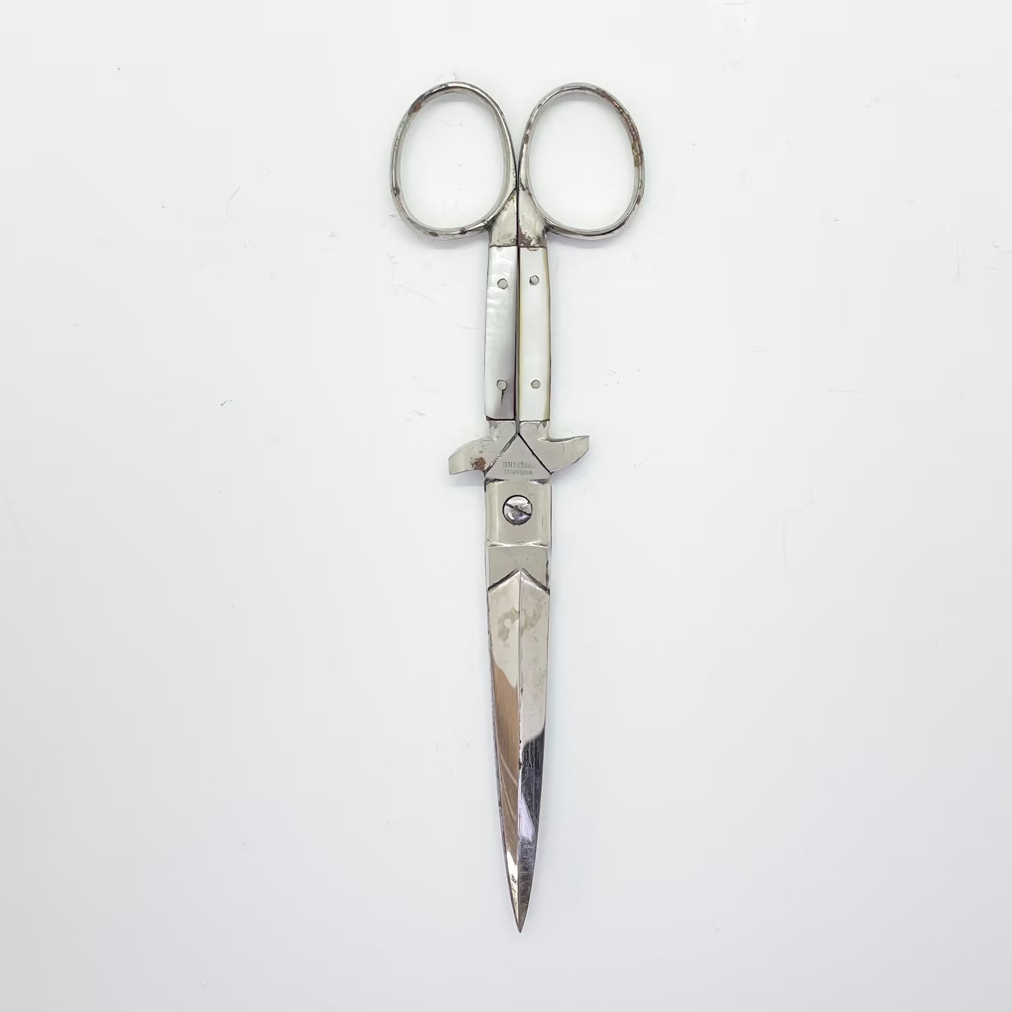 A pair of steel scissors with mother of pearl overlaid on the shanks. The scissors are marked WARRANTED FORGED STEEL which is frequently found on German scissors, and the style matches a model found on p28 of a Hendrichs catalogue dated to the interwar period.