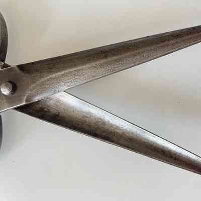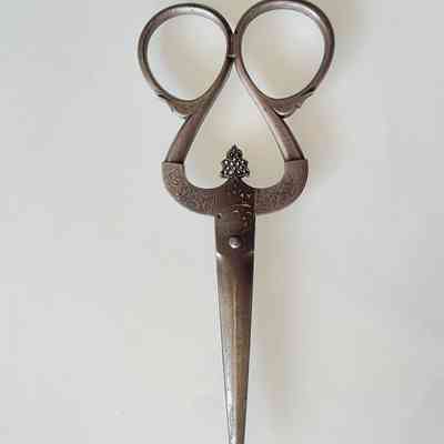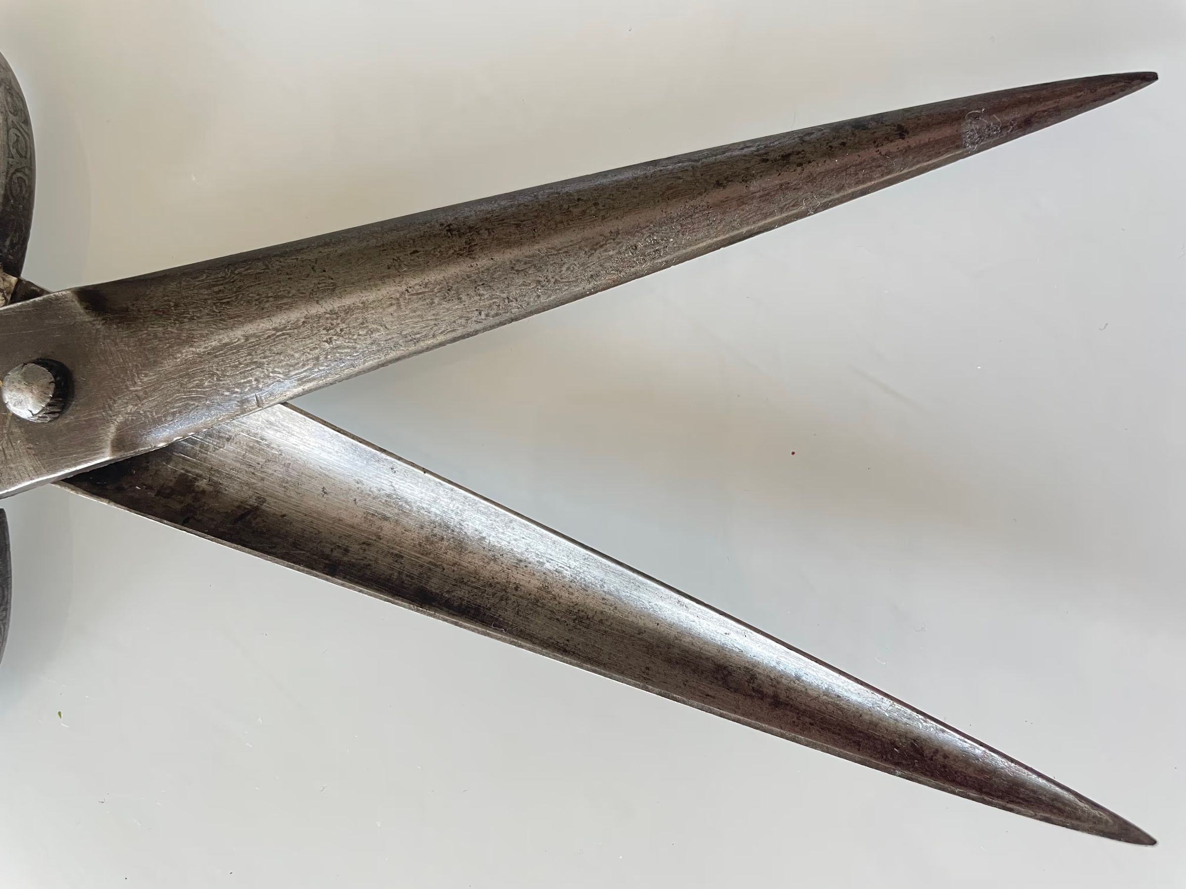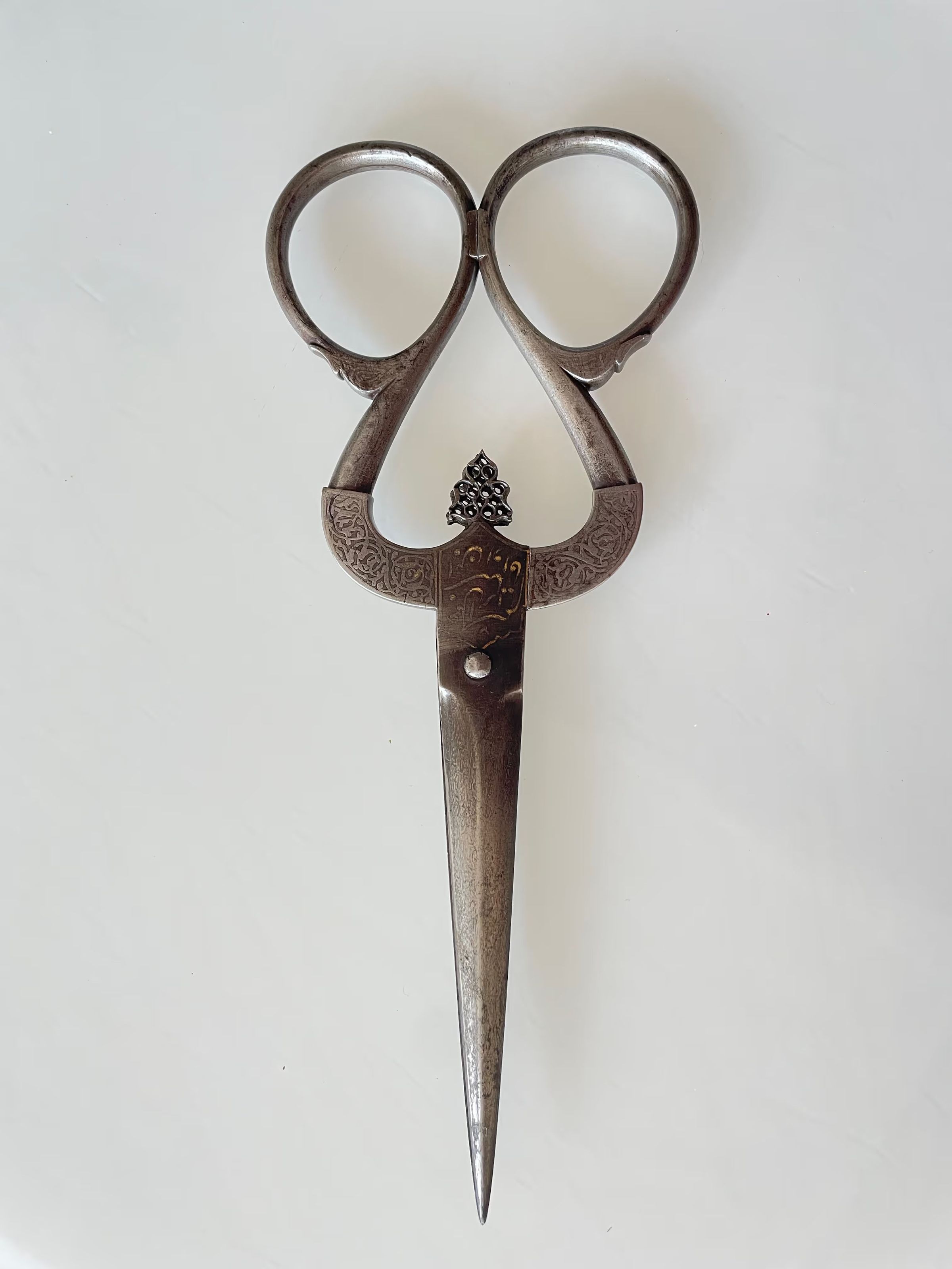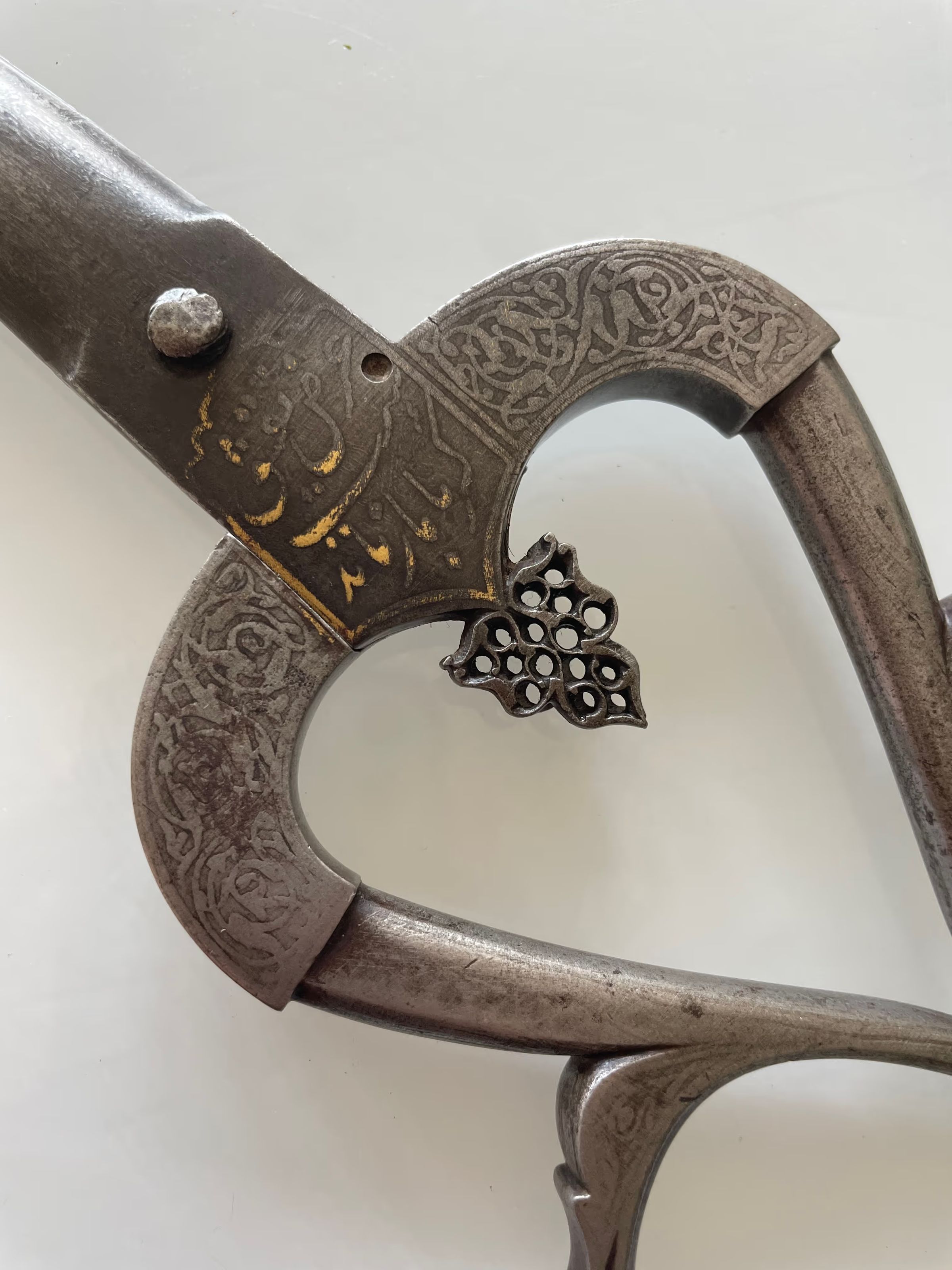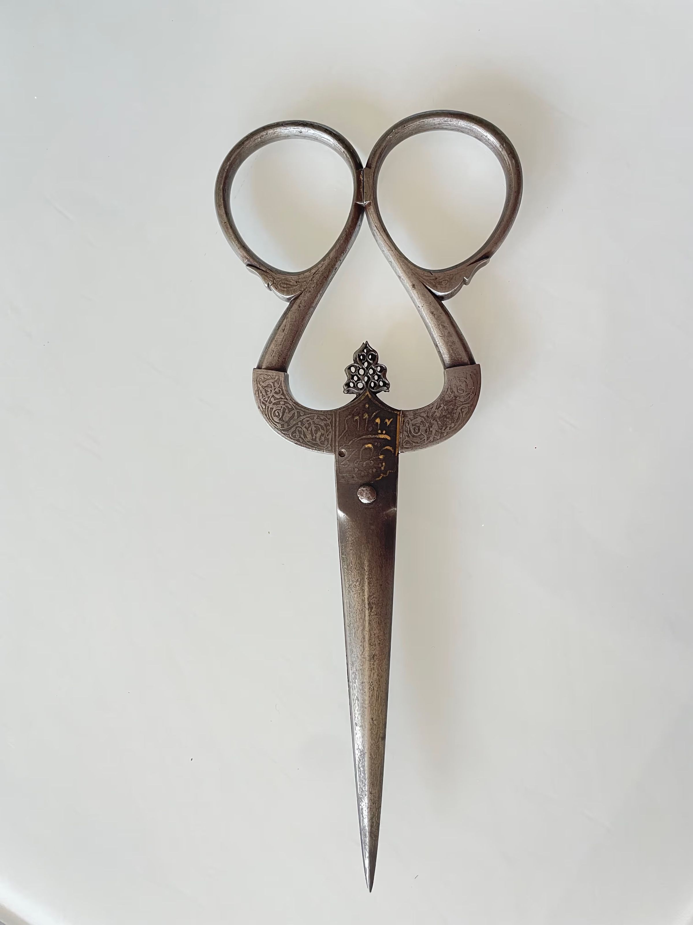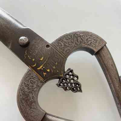 A pair of Persian scissors from the Safavid period (1501 - 1736). Markings show that they were made by "BRAHIM SON OF" and the inscription translates roughly as "THE WIDTH OF YOUR HEAD IS LIKE OPEN KARMA" - possibly a reference to the distinctively shaped shanks and bows.