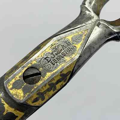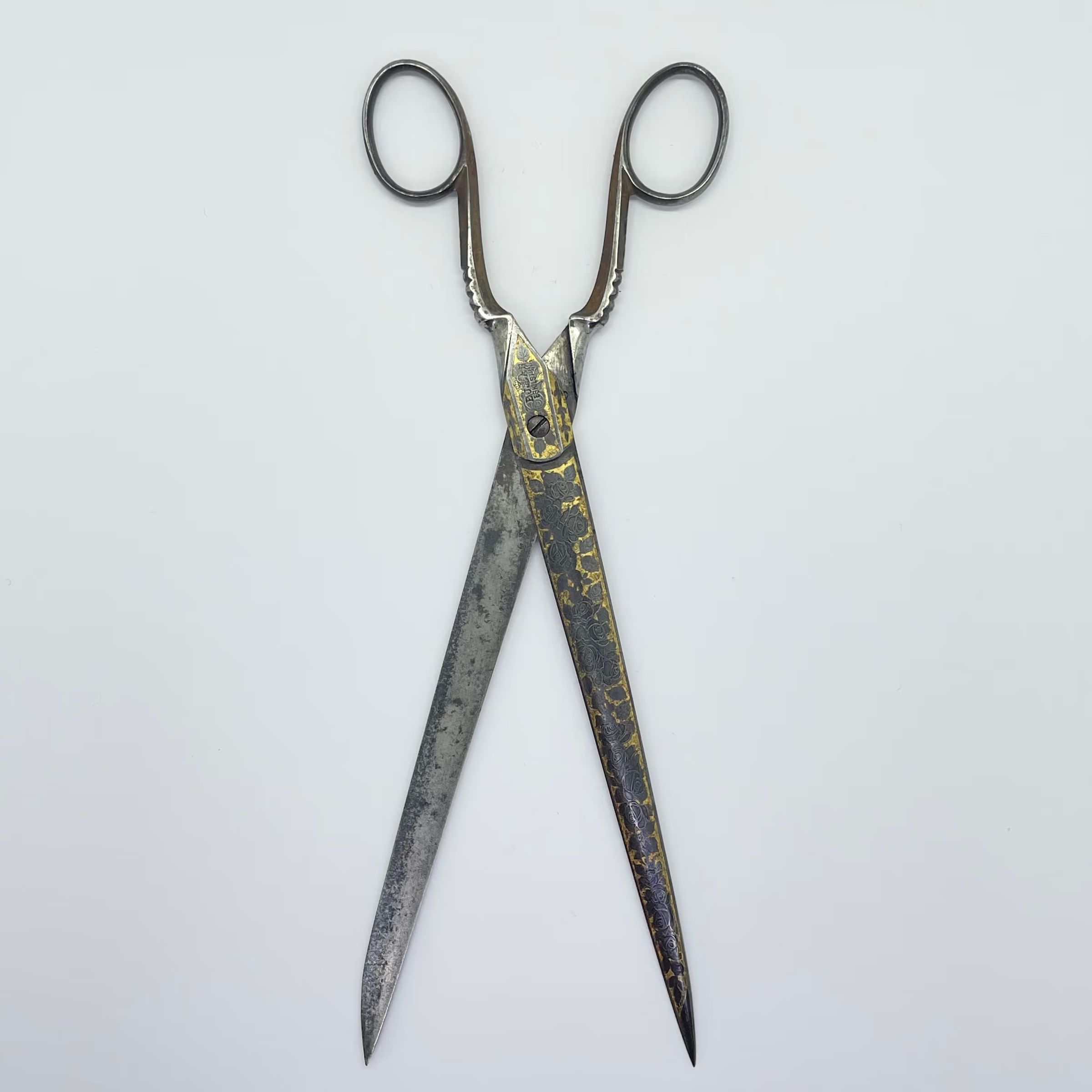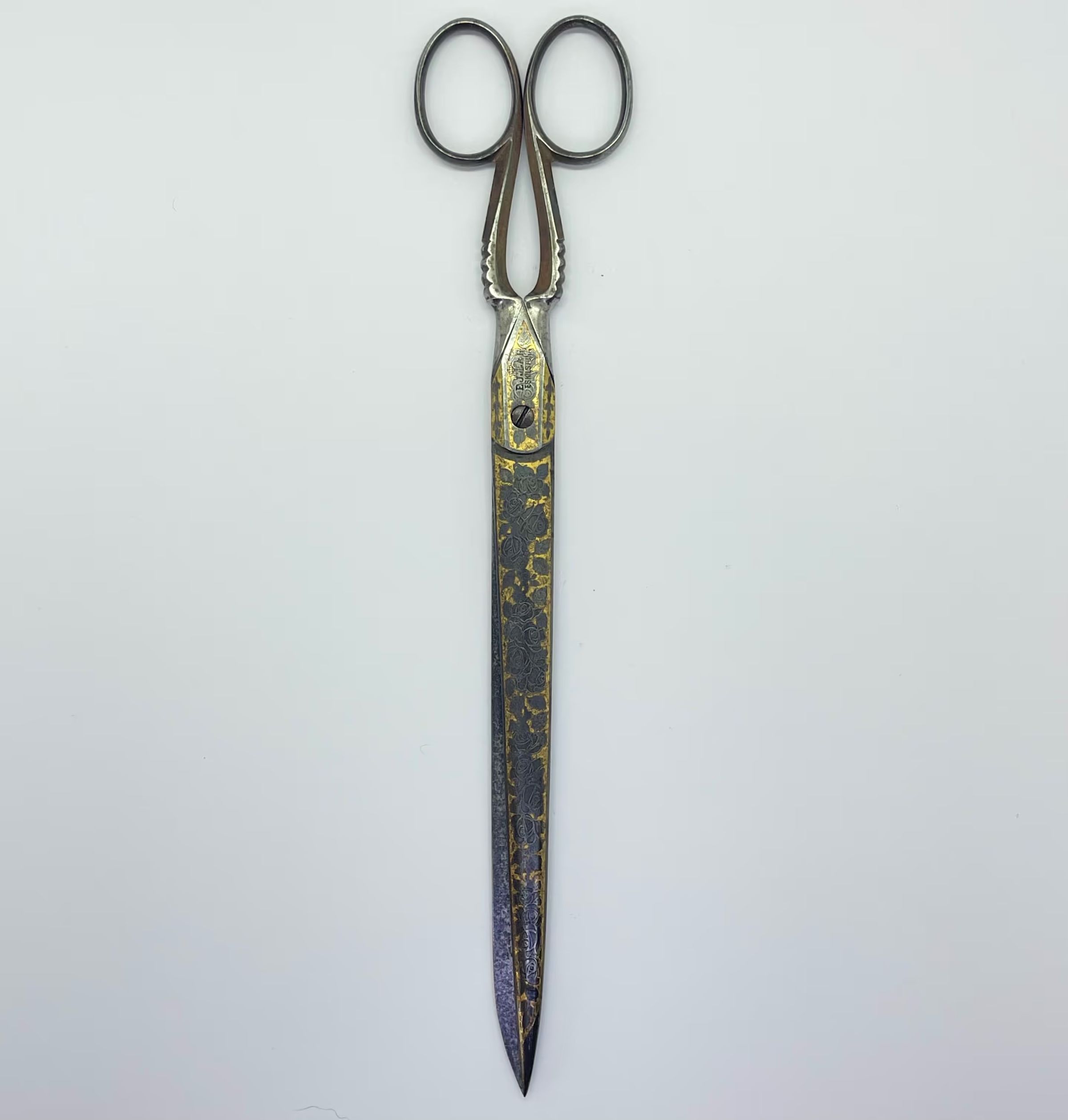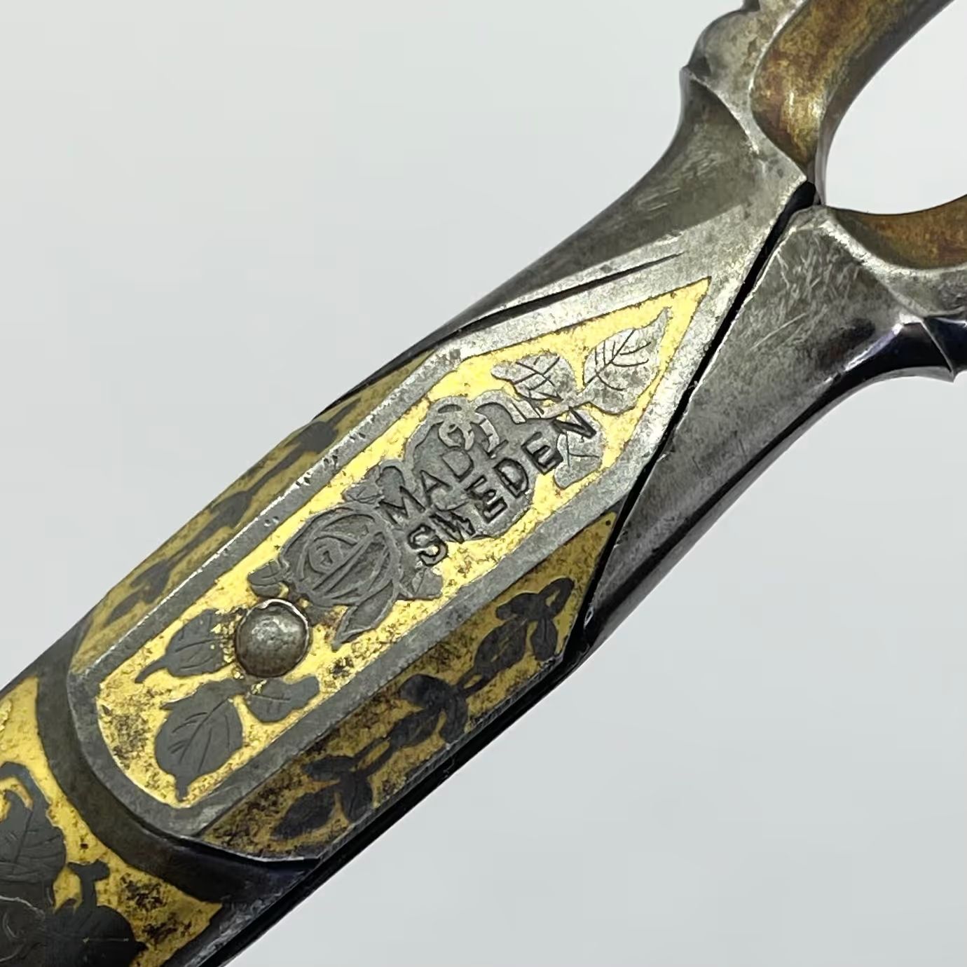 A large pair of Swedish scissors with relatively long blades and a typically Swedish style of decoration. Tup shanks with st4 shoulder transition. Cross section is cs2 and the point is asymmetrical,