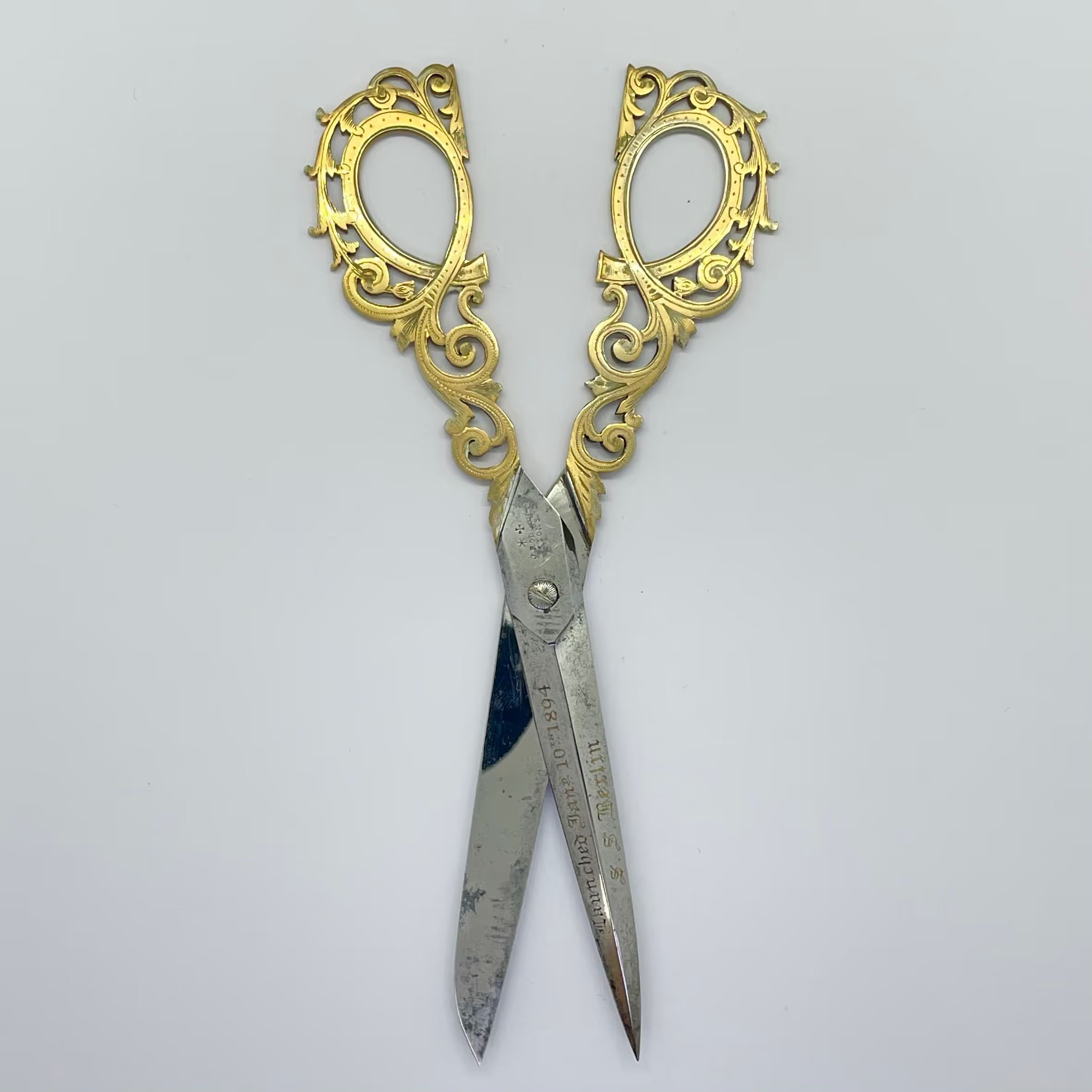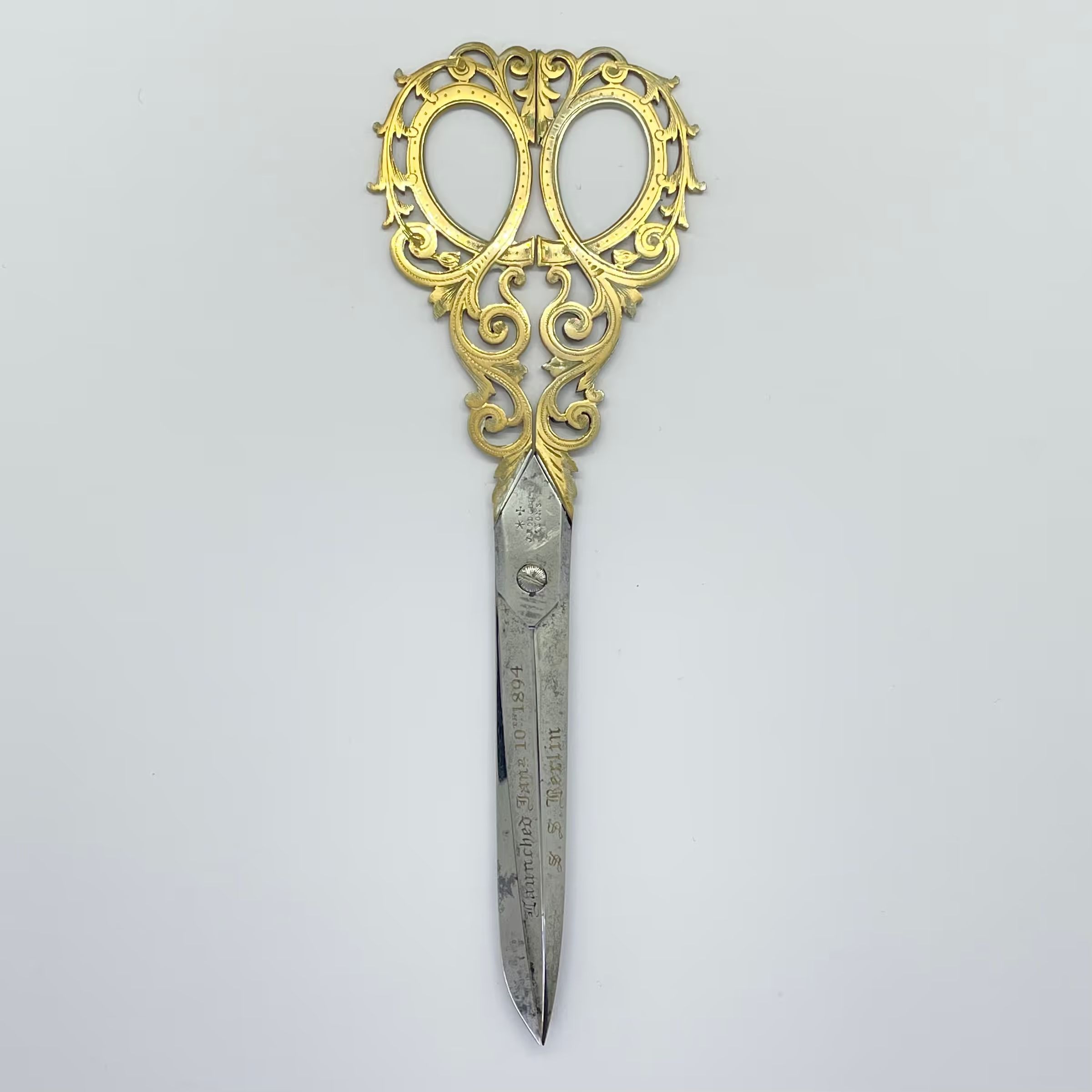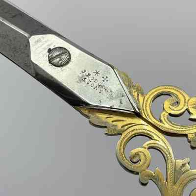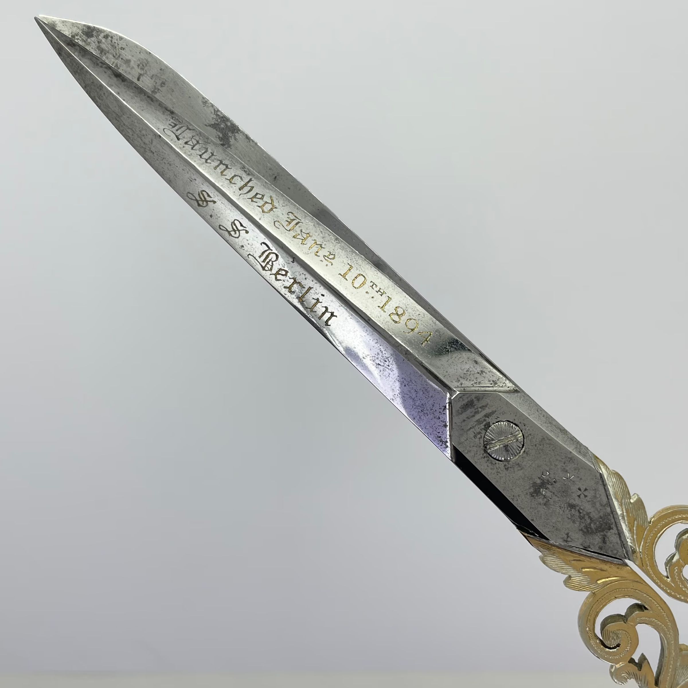 A pair of commemorative scissors made by Joseph Rodgers & Sons for the launch of the S.S. Berlin on the 10th January 1894. The shanks and bows are ornate, and the screw head and base are decorated. Shoulder transition is st8, cross section is cs1, and the point is asymmetrical.