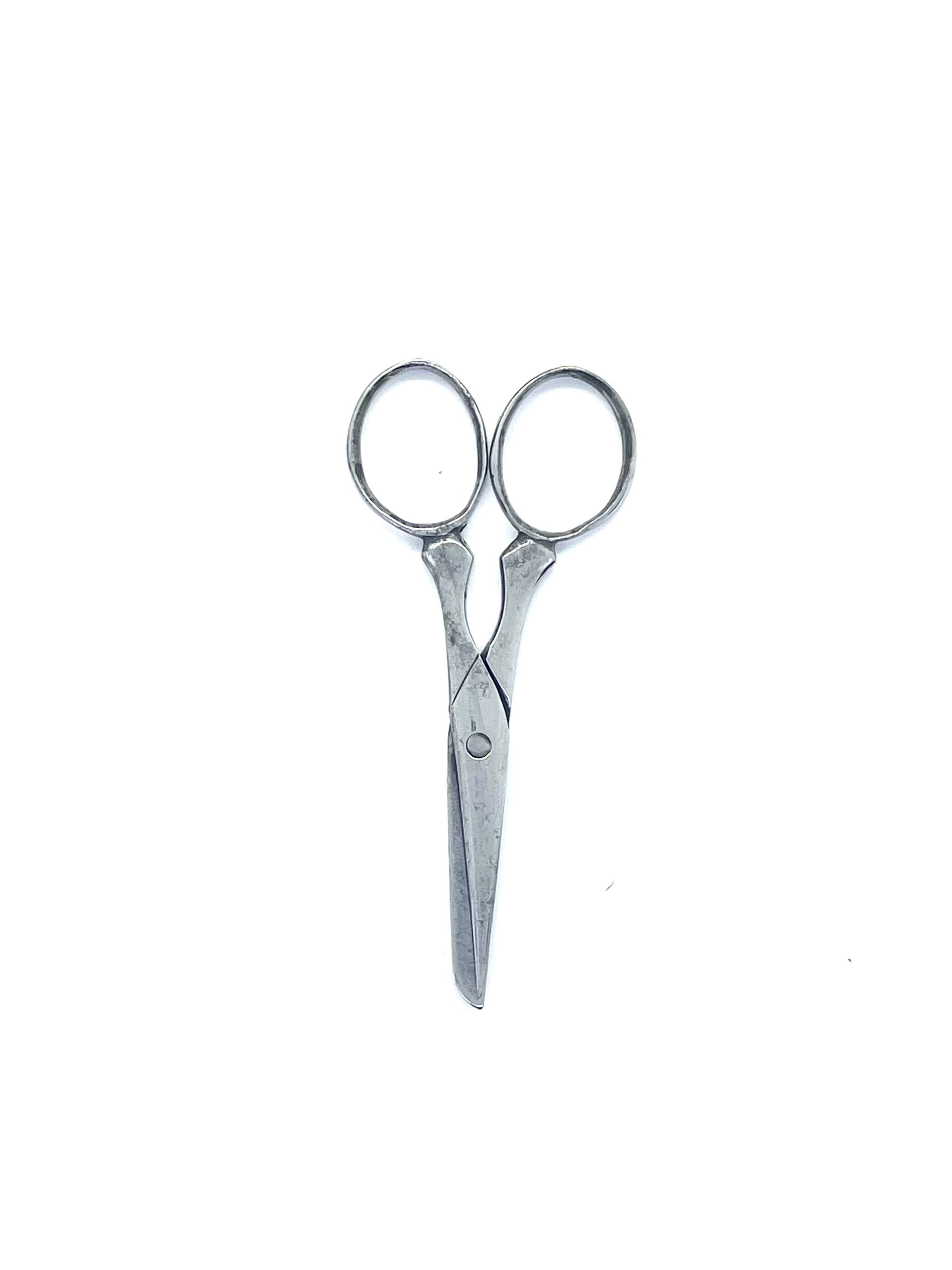 A small pair of European scissors with bat shanks. The pivot is a rivet, there is no shoulder transition, cross section is cs2, and the point is asymmetrical. There are no markings (European origin is assigned due to stylistic details).Dimensions