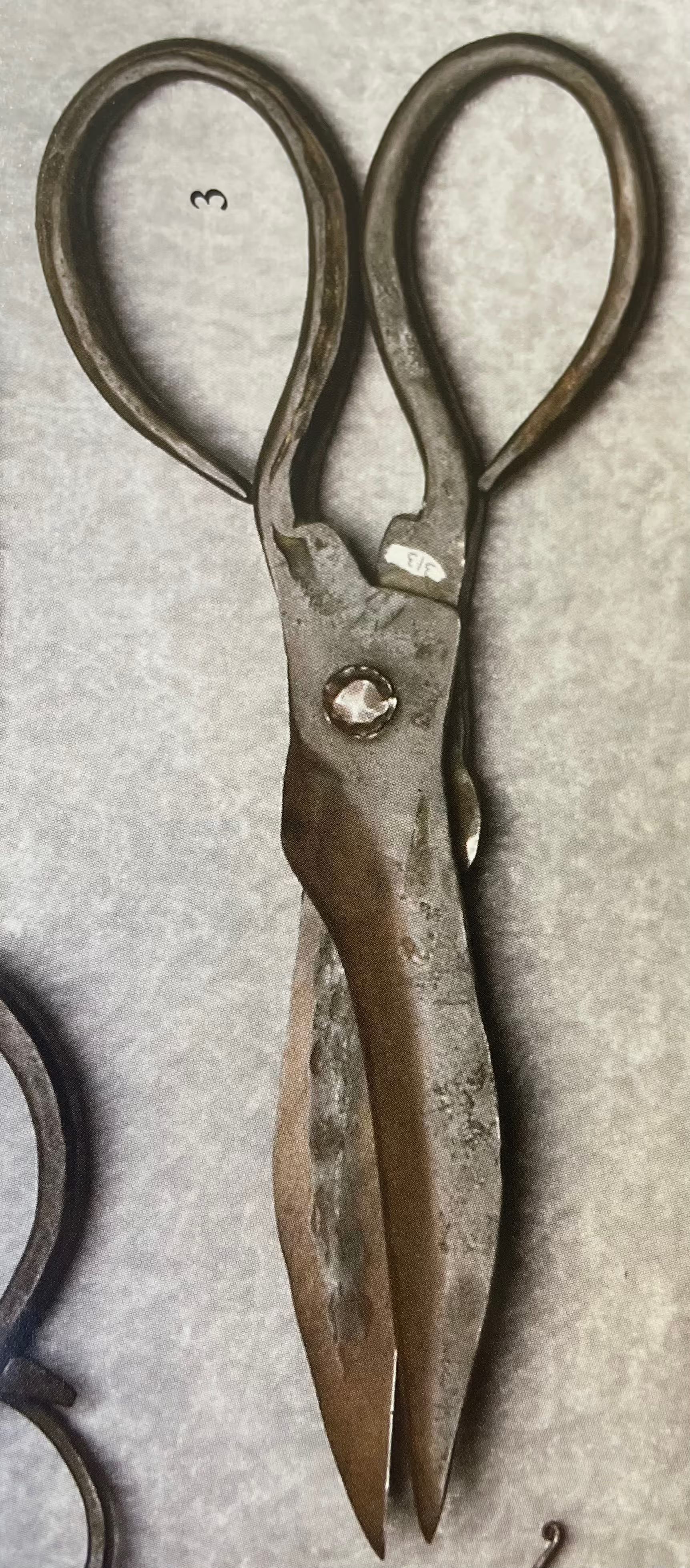 Carbon scissors with a rivet and washer point, and leaf point type. The blades are hooked, possibly due to sharpening.Cataloged By