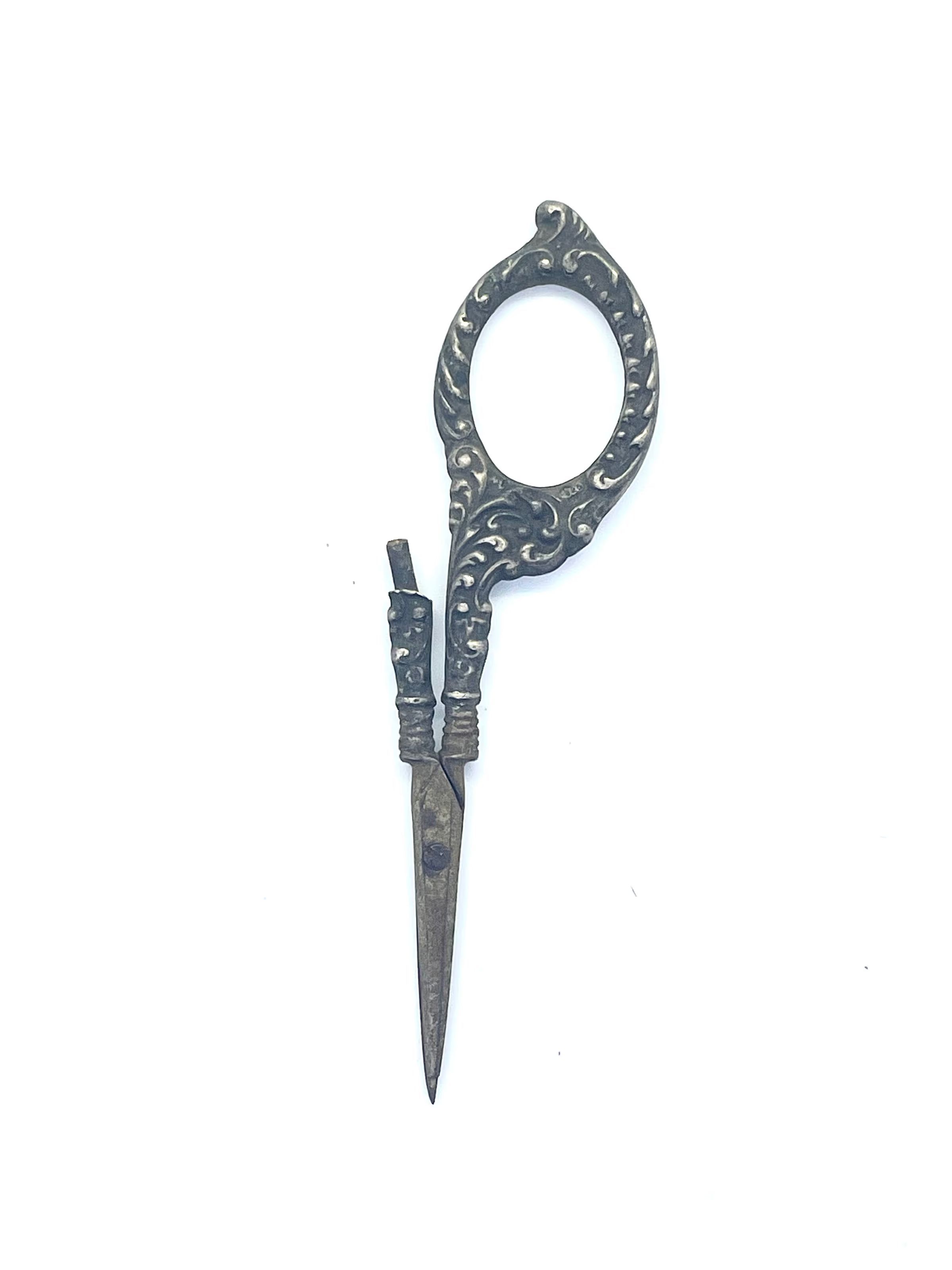 A pair of American scissors with hollow silver handles, one handle is broken. Dated to around the turn of the 20th century. Pivot is a screw, there is no shoulder transition. Cross section is cs5 with bodkin blade/point. No markings.Dimensions