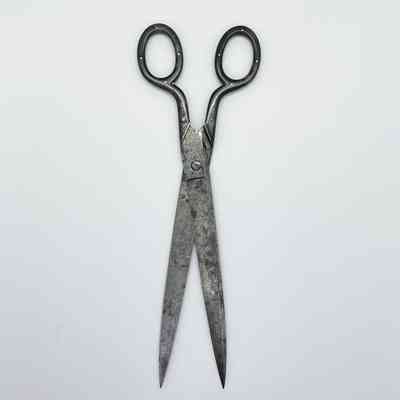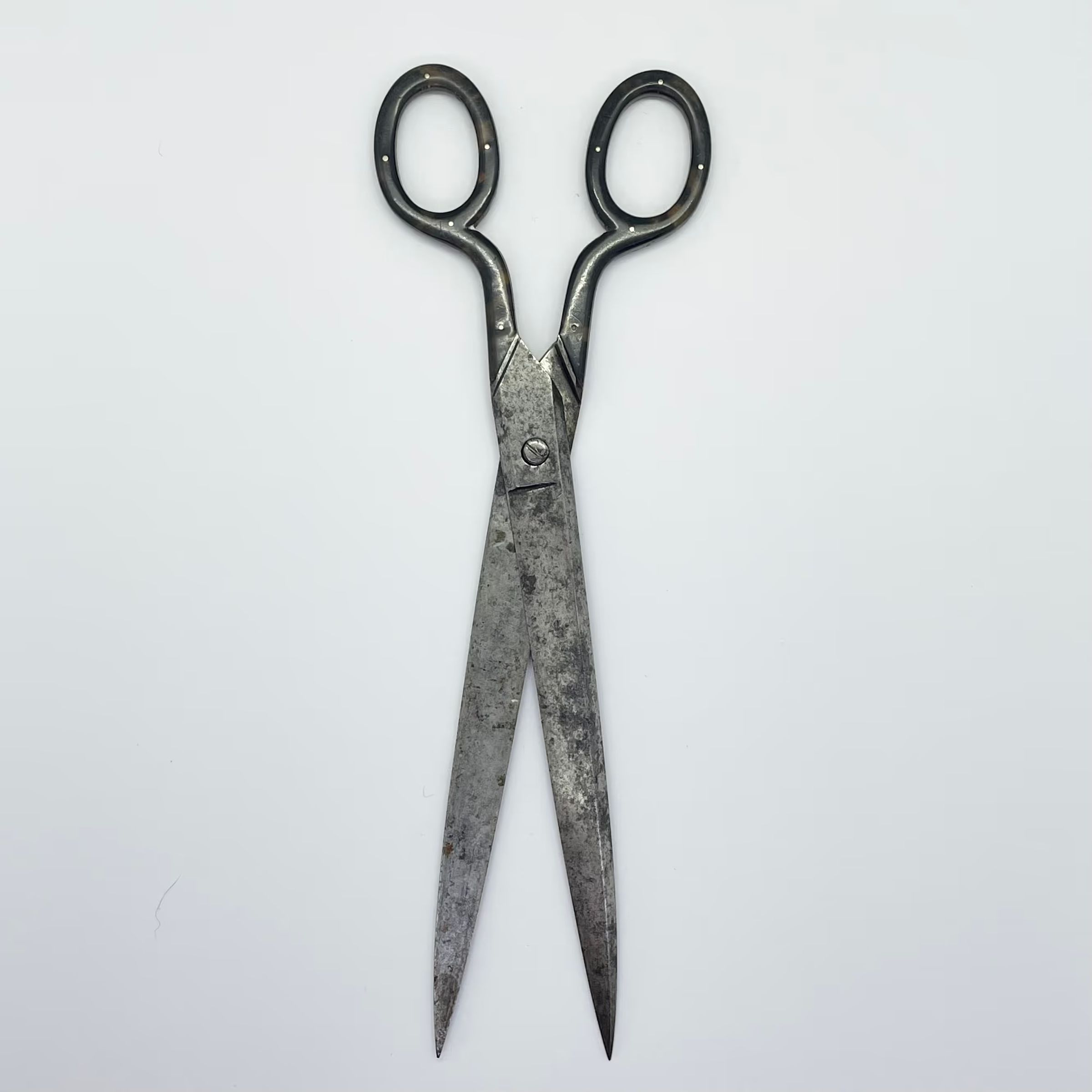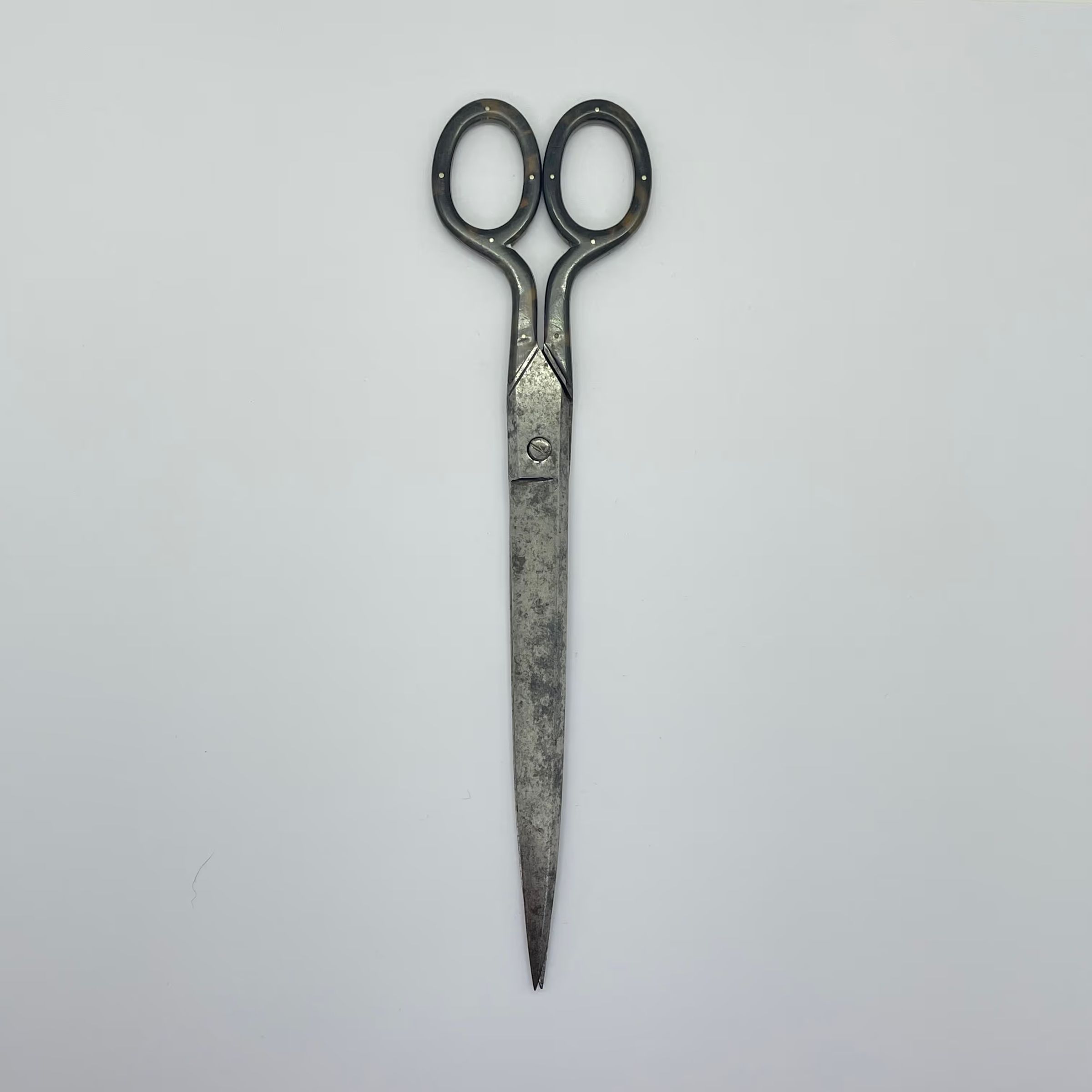 A large pair of scissors with relatively short shanks and long blades. The shanks and bows have a tortoiseshell overlay.