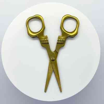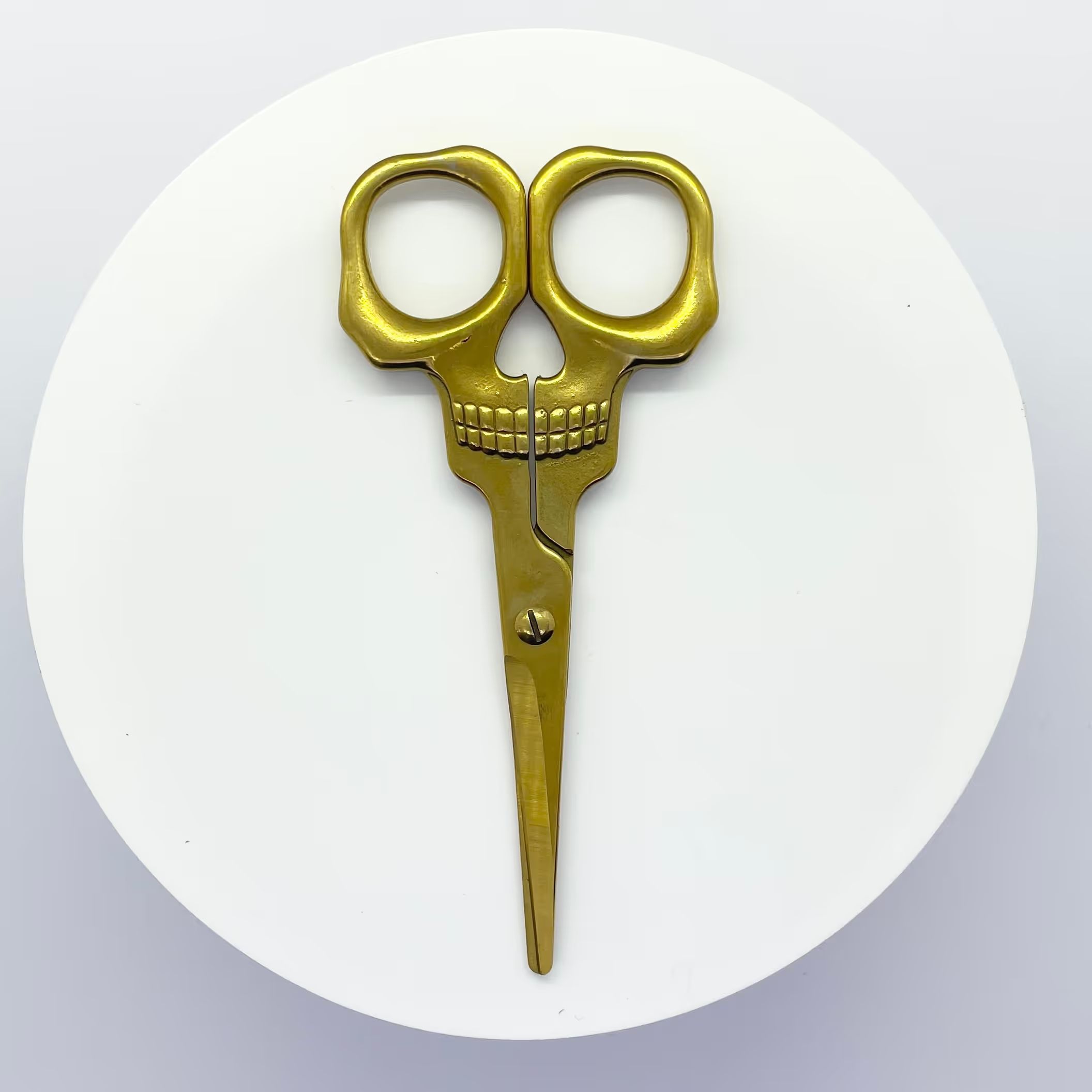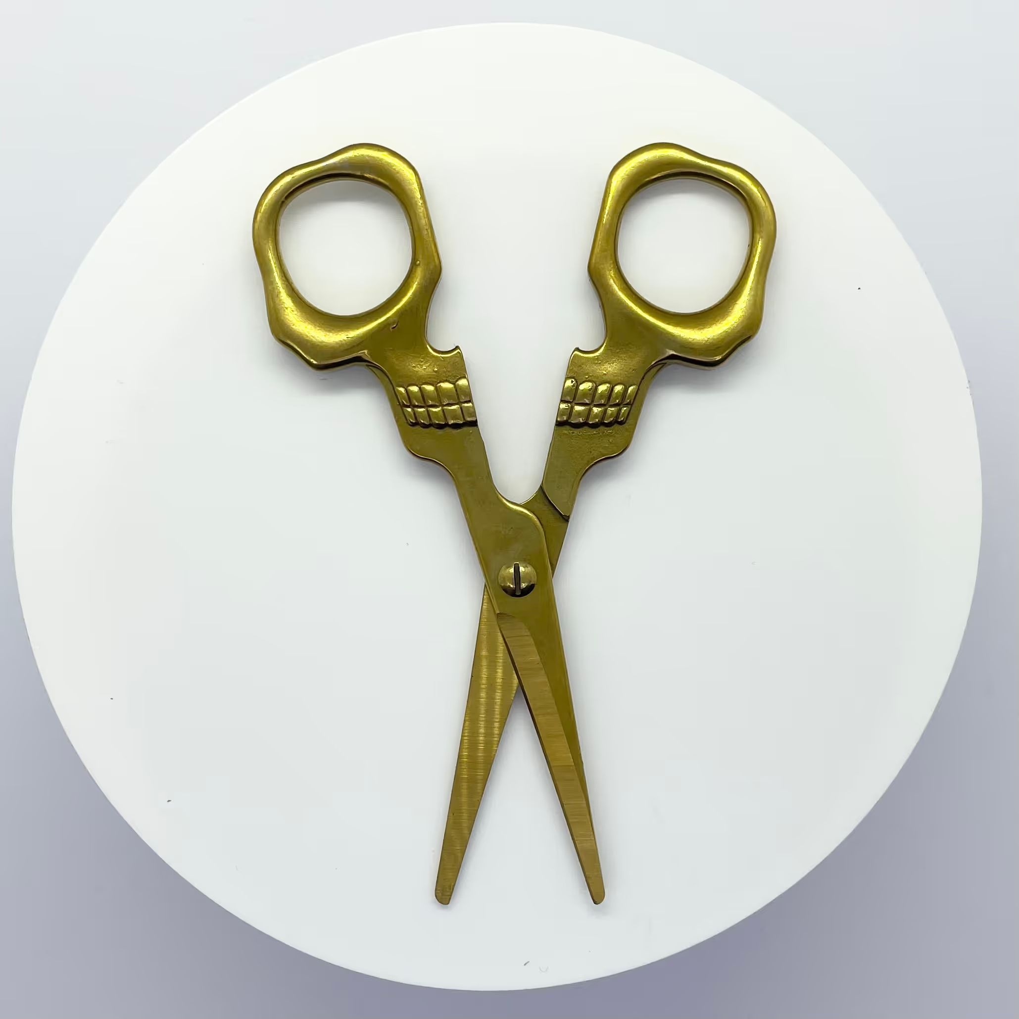 A pair of novelty scissors with the bows and shanks shaped so that they form a skull shape when the blades are closed. Shoulder transition is st6, cross section is cs10, and the point is rounded. There are no markings.Dimensions