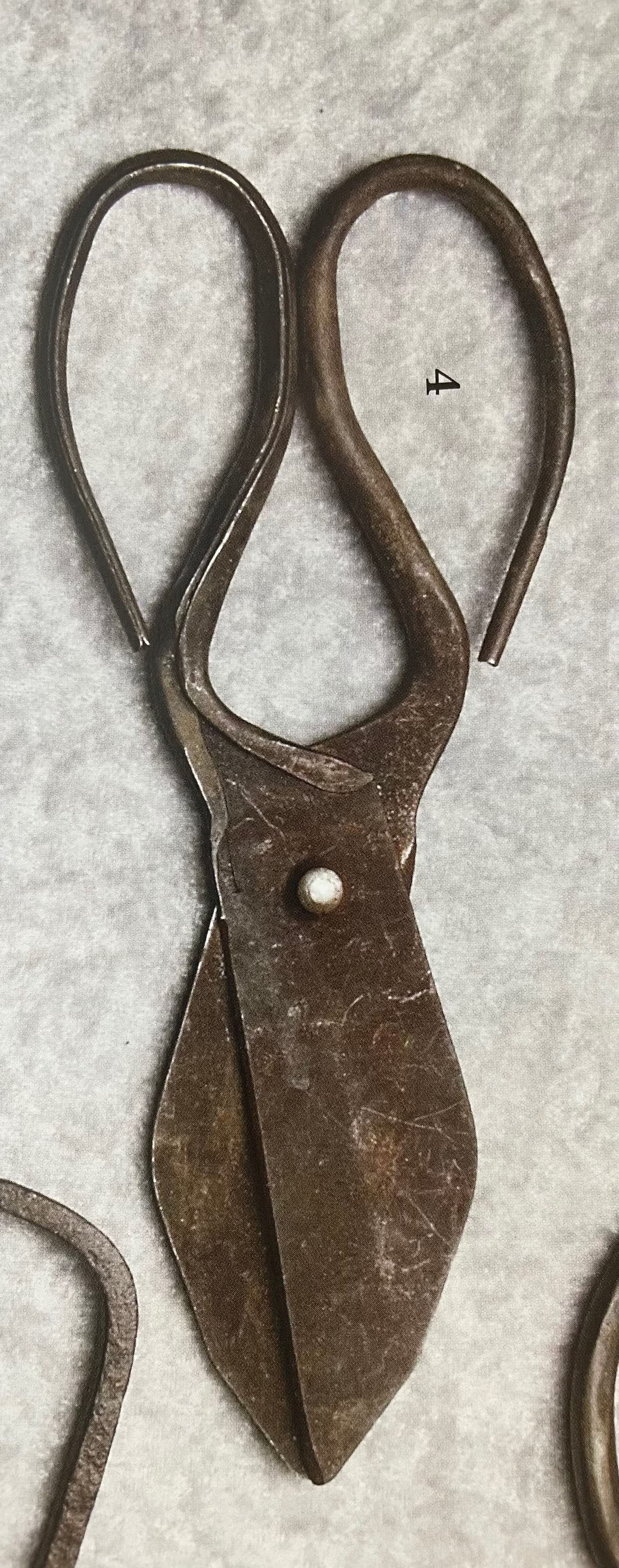 A pair of carbon scissors with a rivet pivot point, and wide leaf point type. The scissors have very wide blades.Cataloged By