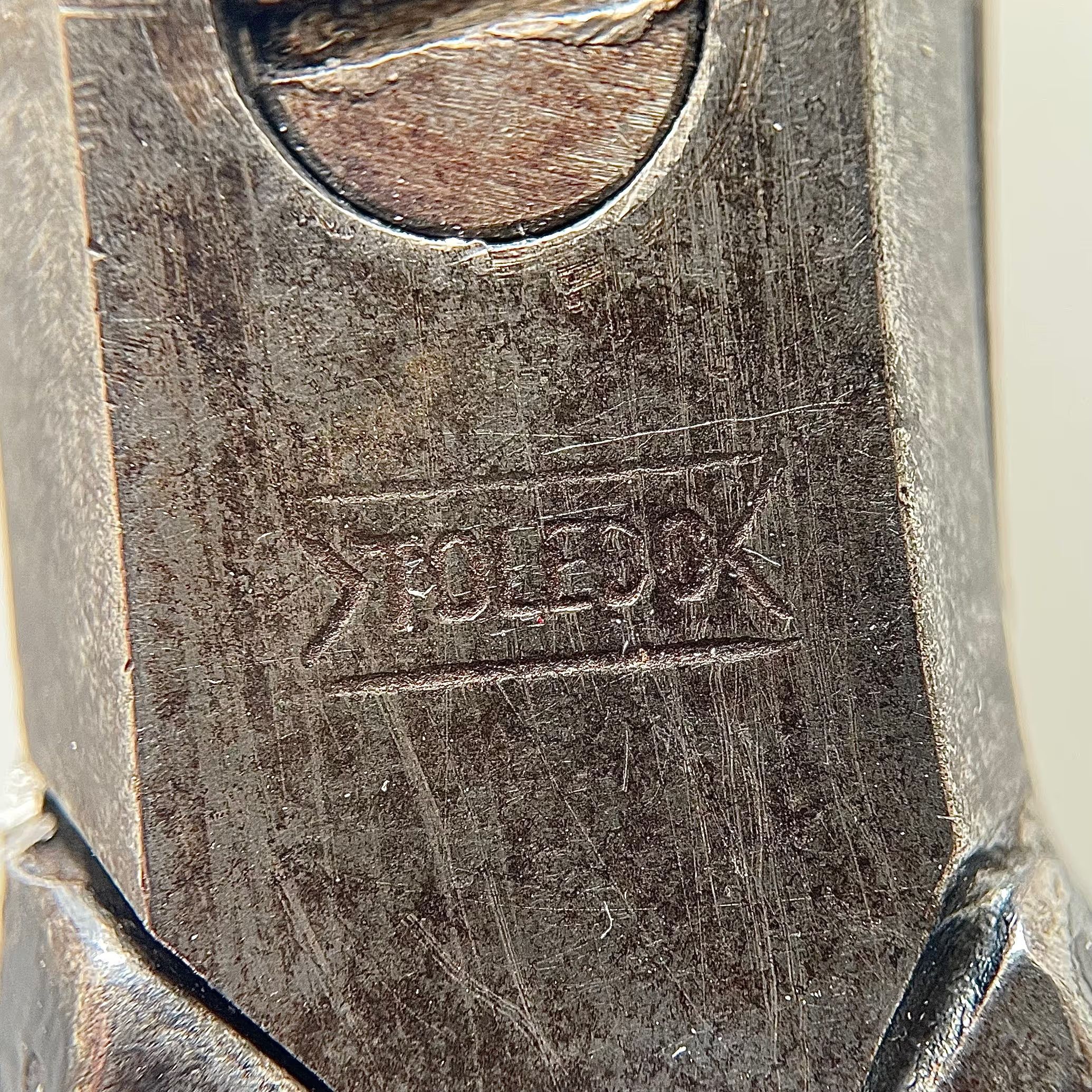 A pair of scissors with unequal bows, japanned handles, a bolt and washer pivot, and asymmetrical point. Shoulder is st1, cross section is cs4. Marked "TOLEDO" on the pivot area.Inscription/Signature/Marks