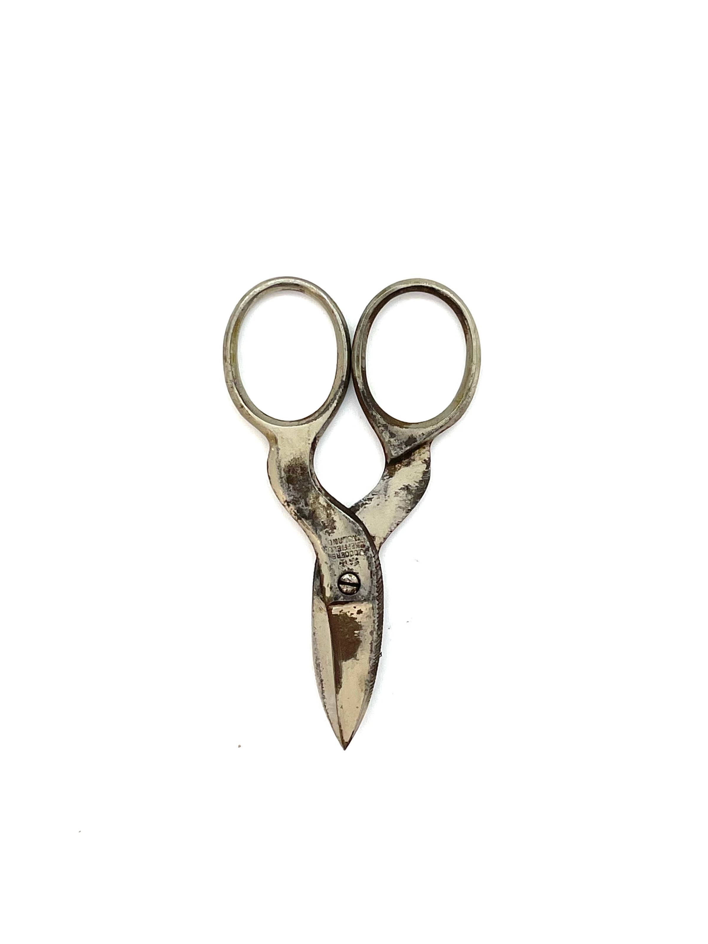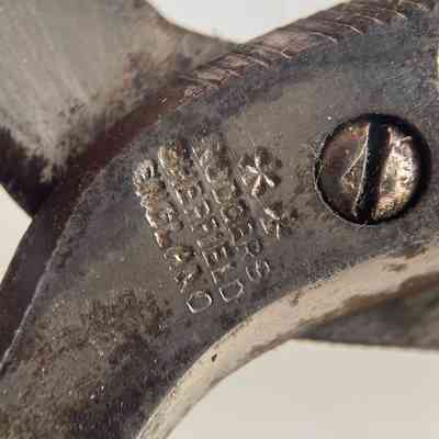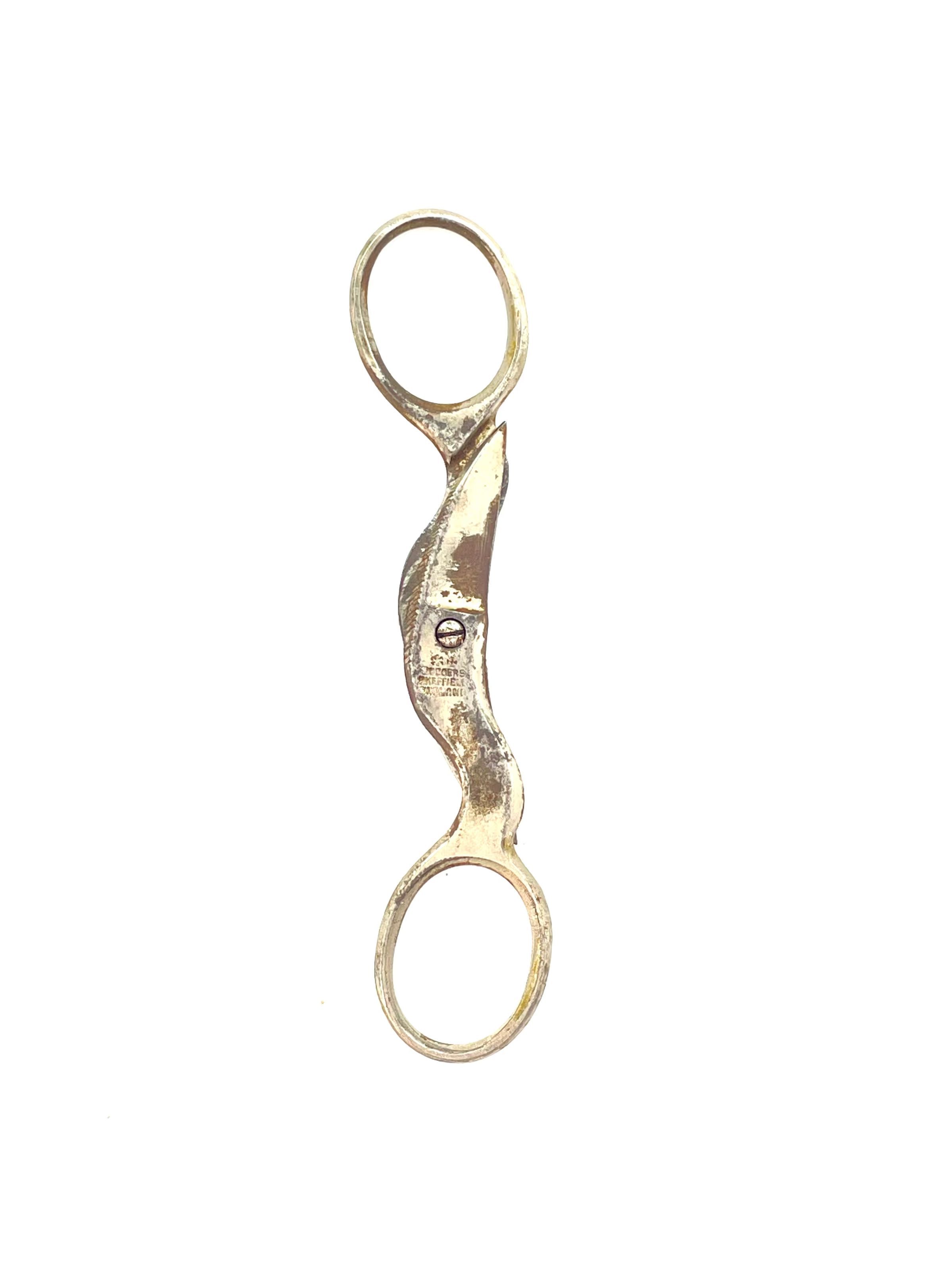 A pair of plated folding manicure scissors with serrations to form nail files on the outer edge of each blade. Fit into a small leather sheath when folded. Marked "RODGERS SHEFFIELD ENGLAND" with a star and Maltese cross design, which is the mark of Joseph Rodgers & Sons Ltd, on the pivot area. Shoulder is st1, cross section is cs4.Category