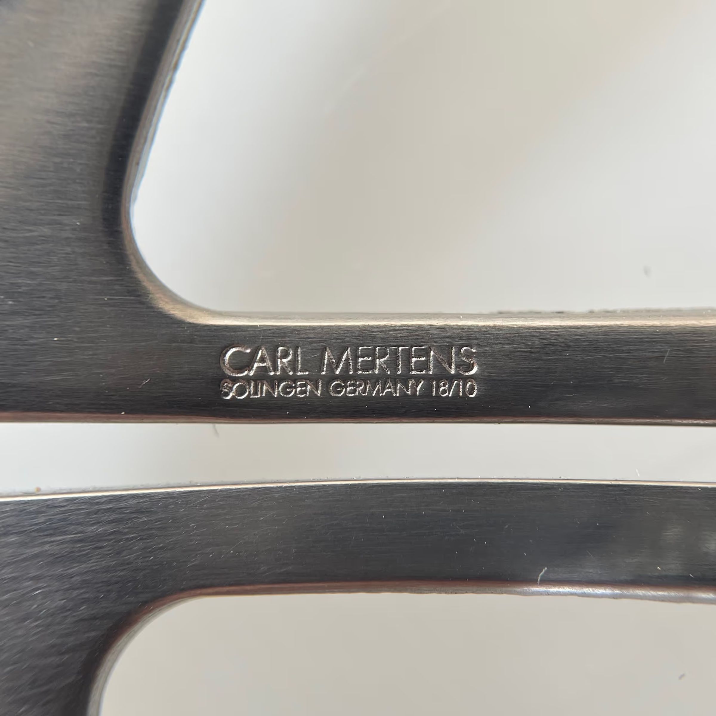 A pair of modern wick scissors made by Carl Mertens of Solingen. Pivot is a screw, the blades are asymmetrical. Shoulder is st6 and cross section is cs4. Marked "CARL MERTENS SOLINGEN GERMANY 18/10" on one of the bows.Inscription/Signature/Marks